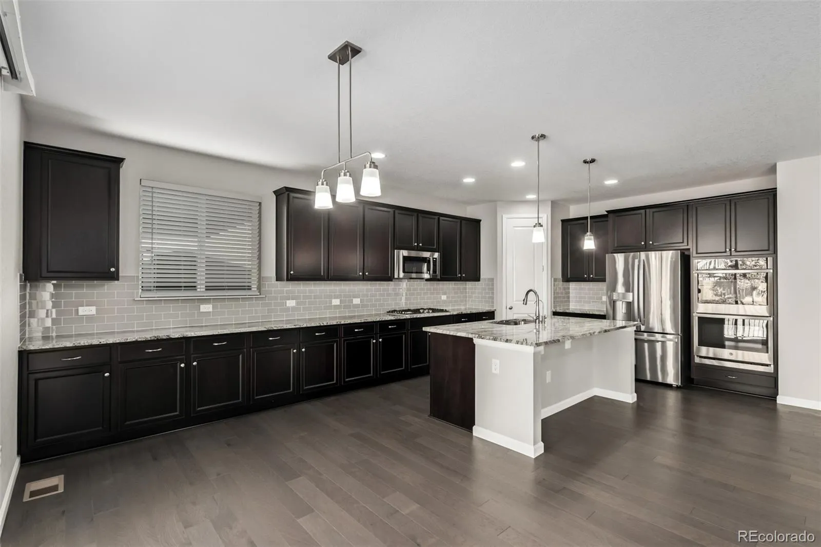 Step inside to a bright, open floor plan with modern wood flooring, neutral tones, and plenty of natural light, perfect for both everyday living and entertaining. The chef’s kitchen is a true showstopper with high-end stainless steel appliances, including a brand-new Bosch dishwasher and GE microwave, granite countertops, tile backsplash, and a large island with breakfast bar seating.