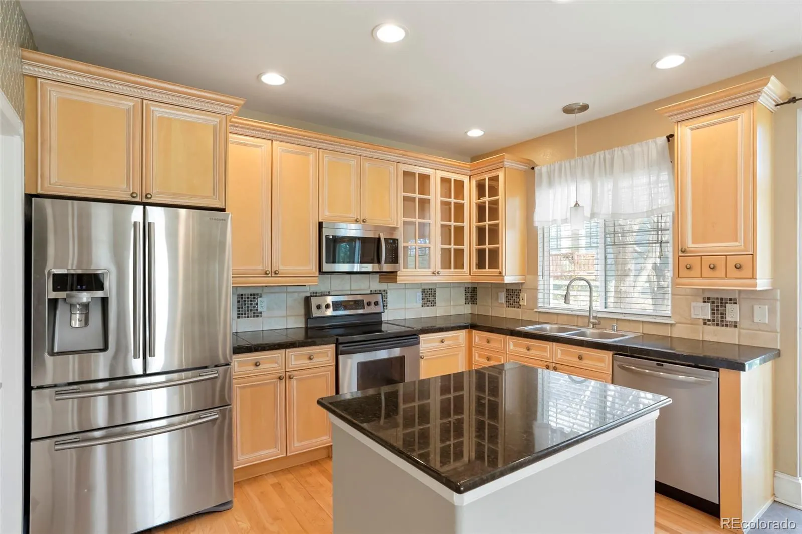 backsplash, an island for extra prep space, and a generous walk-in pantry. A large sliding glass door lets in abundant