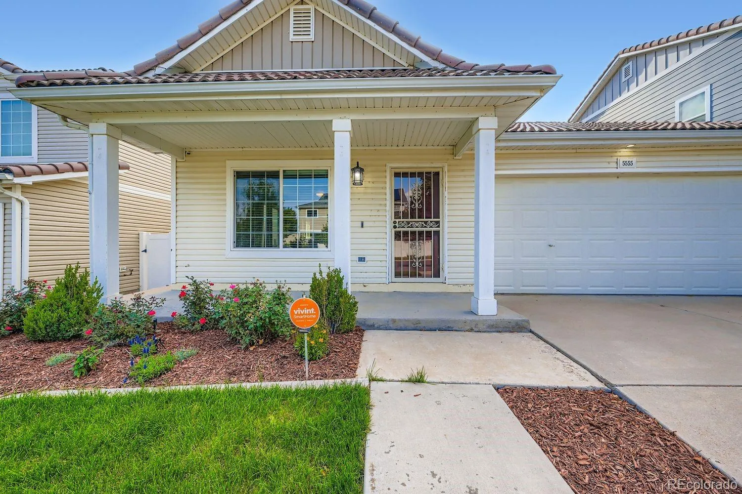 Welcome to this beautifully maintained ranch-style home in Green Valley Ranch, offering comfort, convenience, and single-level living. With 2 bedrooms, 2 full bathrooms, and nearly 1,400 square feet, this home is thoughtfully designed for both everyday living and entertaining. Inside, you’ll find a bright, open floor plan featuring a spacious living room, dining area, eat-in kitchen with modern appliances, and a smart thermostat. Additional features include walk-in closet, ceiling fans, in-unit laundry room. and double-pane windows for year-round efficiency and comfort. Step outside and enjoy a covered front porch perfect for relaxing mornings, and a private backyard with a covered patio, ideal for entertaining or unwinding. The home also offers a 2-car attached garage, off street parking landscaped yard with sprinklers, and partial fencing. Conveniently located in a professionally managed community with road maintenance, snow removal, and trash service included, this property is close to parks, schools, shopping, dining, and just minutes from DIA with easy access to public transit. Move-in ready!