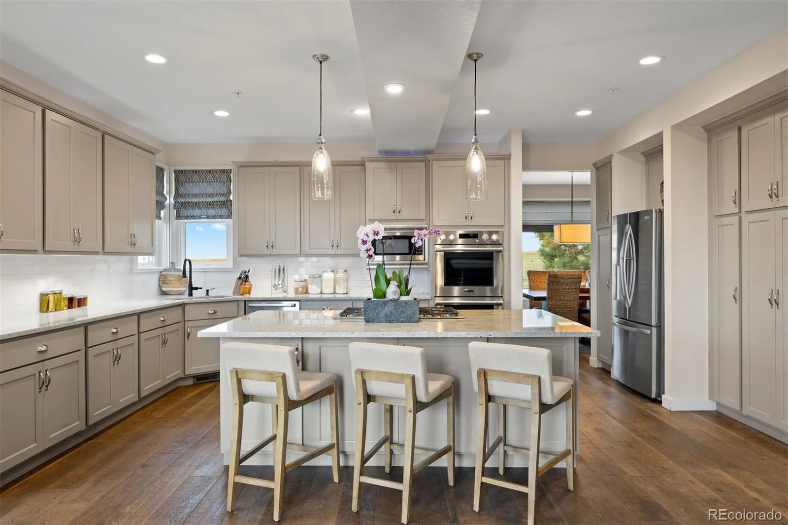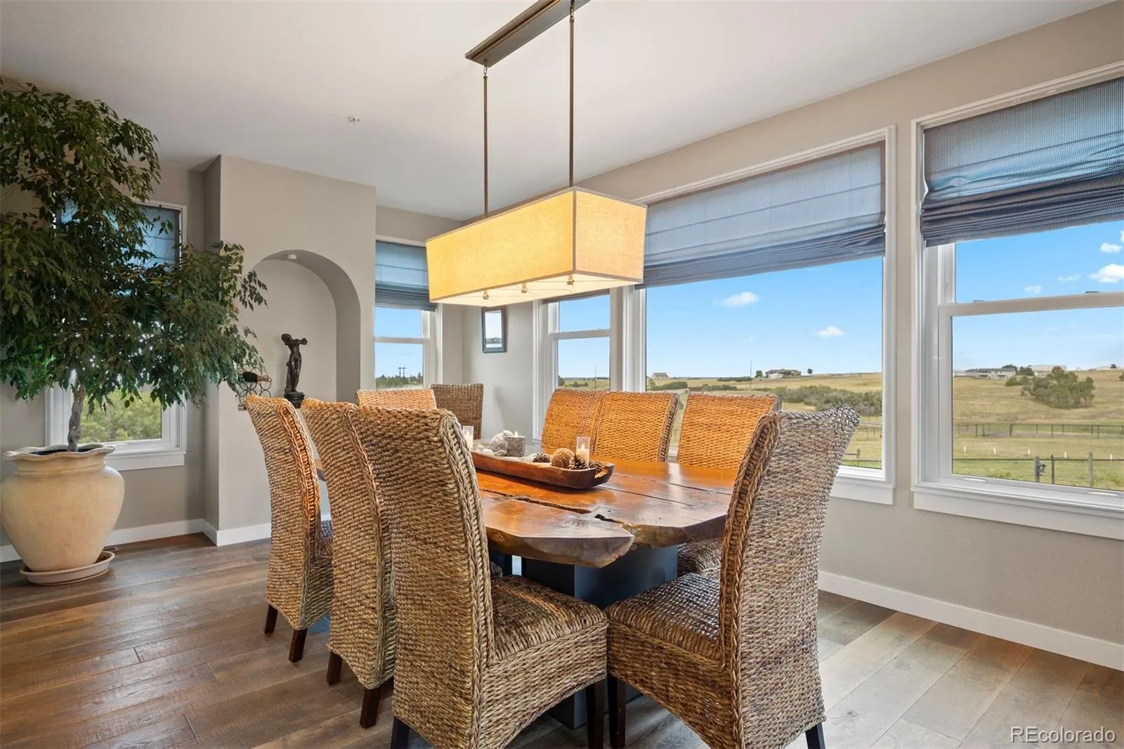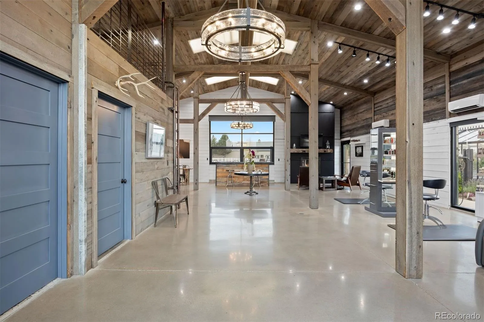 Nestled in the heart of Douglas County, you’ll find an exquisite equestrian estate that spans a breathtaking 35 acres. From every corner of the property, the panoramic front range views are nothing short of spectacular. Adding to its allure, the estate is bordered by 8,800 additional acres of conservation land to the south, creating a vast expanse of natural beauty and privacy! This unique farm-to-table living experience includes a variety of charming features such as chickens, cows, lush gardens, and a vineyard. The main house is a showcase of luxury and comfort. Includes 6 bedrooms and 8 baths in 7,063 finished square feet. For guests or ranch hands, there’s a fully equipped 900 sq ft apartment in the lower level walkout. Throughout the home, designer upgrades abound. The main living area features wide plank French Oak floors finished with hard wax oil for durability, and fresh paint throughout. The estate includes two primary bedroom suites one on the main floor and one upstairs, two spacious family rooms, and a 4-car garage. Equestrian enthusiasts will appreciate the immaculate Olympic size indoor arena (110′ x 225′), connected to a 22-stall barn complete with radiant heat flooring. The barn also has an outdoor arena, automated water systems, tack room, office, and a viewing lounge that overlooks the indoor arena, along with two bathrooms. The property also boasts an additional 1,600 sq. ft. 6-stall barn that has been renovated and creatively repurposed into a chic 2-chair hair salon. This space includes a cozy bedroom, a 3/4 bath, a loft bedroom, a kitchen w/ dining space, a bar/lounge with fireplace, + access to an outdoor seating area with large fireplace. The estate is equipped with a commercial well and has adjudicated water rights, ensuring a reliable and sustainable water supply. Whether for personal enjoyment or professional endeavors, this Douglas County estate offers an unparalleled blend of luxury, functionality, flexibility and natural beauty.