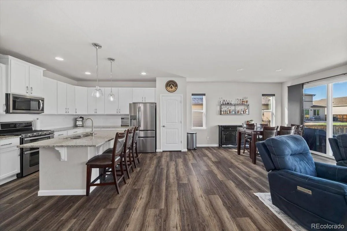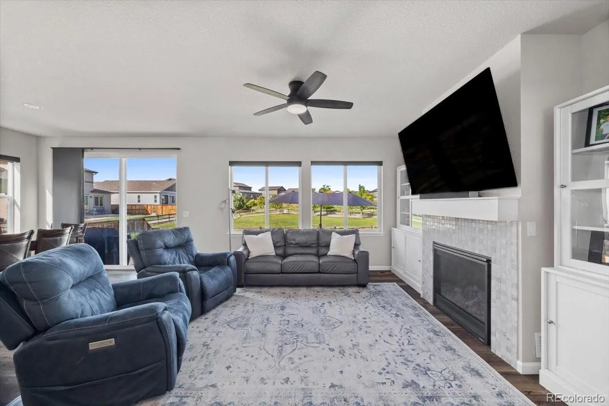 The open floorplan makes hosting effortless, with a *BRIGHT* kitchen at the center featuring 42″ white cabinets, granite counters, a large island with room for everyone to *GATHER* , and stainless appliances ready for casual dinners or holiday feasts. Wide-plank luxury vinyl flooring ties the main level together, flowing into a *SUNLIT* living room anchored by a mantled gas fireplace with elegant *TILE* surround.