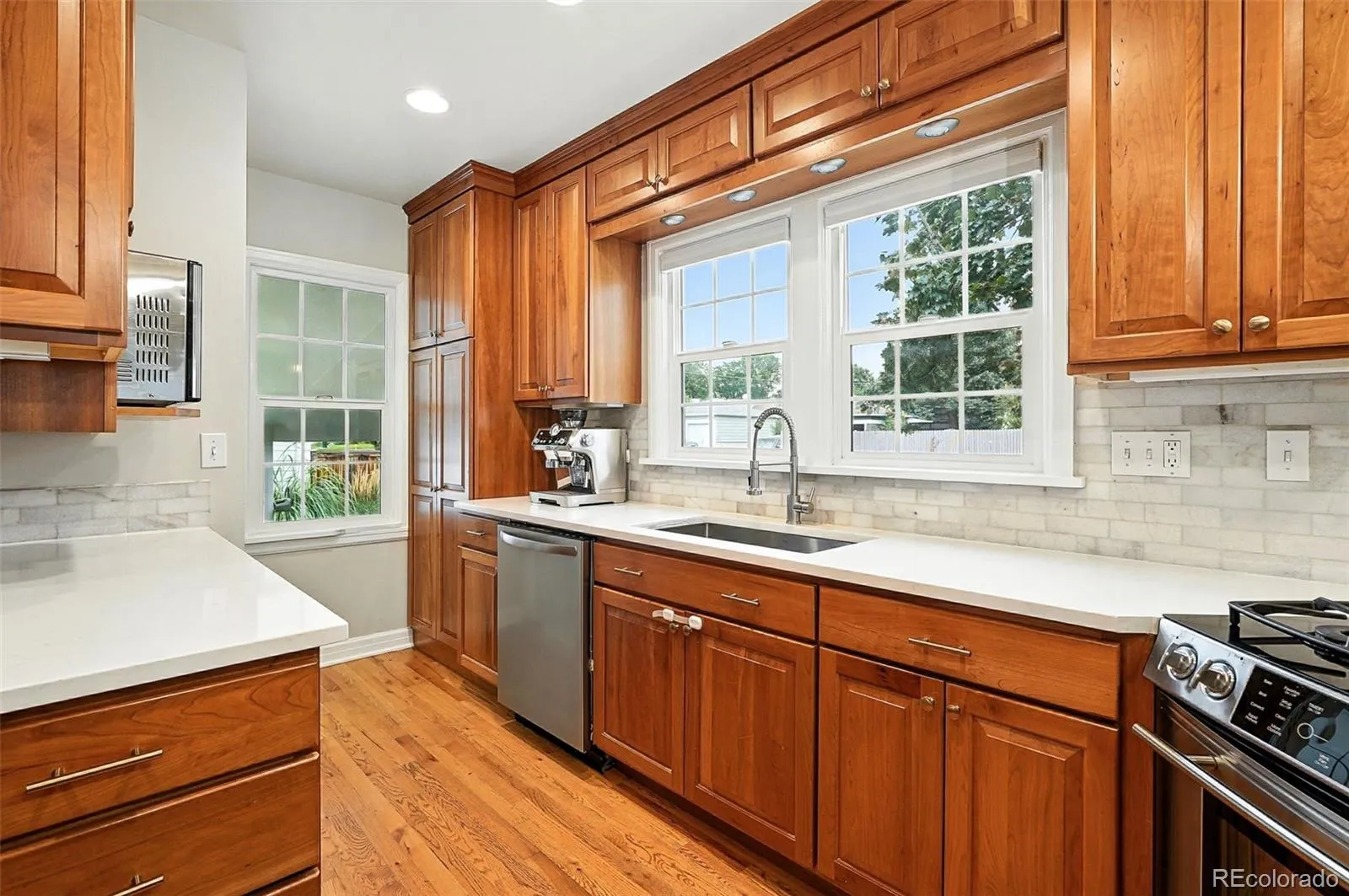 GREAT NEW PRICE! This beautifully remodeled University ranch delivers the perfect blend of modern style and vintage charm. With 3 bedrooms, 3 baths, a finished basement, and a brand-new backyard studio, this home offers flexibility for every stage of life. Perched on a prime corner lot along a quiet tree-lined street, you’re just blocks from restaurants, breweries, and Harvard Gulch Park — and only minutes to the buzz of Wash Park. Inside, gleaming hardwood floors, fresh designer paint, and large windows fill the home with light. Coved ceilings, arched doorways, and original solid wood doors nod to its heritage, while thoughtful updates bring it beautifully into the present. The heart of the home is the updated kitchen with stainless appliances, Quartz counters, rich cherry cabinetry, and a breakfast bar that connects seamlessly to the living room. French doors in the dining room open to the covered patio for effortless indoor-outdoor entertaining — perfect for morning coffee or hosting guests on gameday. Need a quiet home office, gym, or creative space? The new detached studio is your answer — complete with built-in desk, cabinetry, and its own heating and cooling system. The main-floor primary suite is a true retreat with vaulted ceilings, radiant-heat floors, dual vanity, and two closets. A sunny guest room and full bath complete the main level. Downstairs, the light-filled finished basement offers a spacious family room, third bedroom, ¾ bath, laundry area, and flex space for your Peloton, yoga mat, or second office. Additional highlights include a fully carpeted attic for storage, oversized crawlspace, new furnace and A/C, water heater, radon mitigation system, recent sewer scope, new basement carpet, garage door, interior and exterior lighting — plus professional landscaping and a 5-year roof certification. With quick access to I-25, Cherry Creek, DTC, and Downtown, this one checks every box for location, lifestyle, and livability. Hurry, don’t miss out!