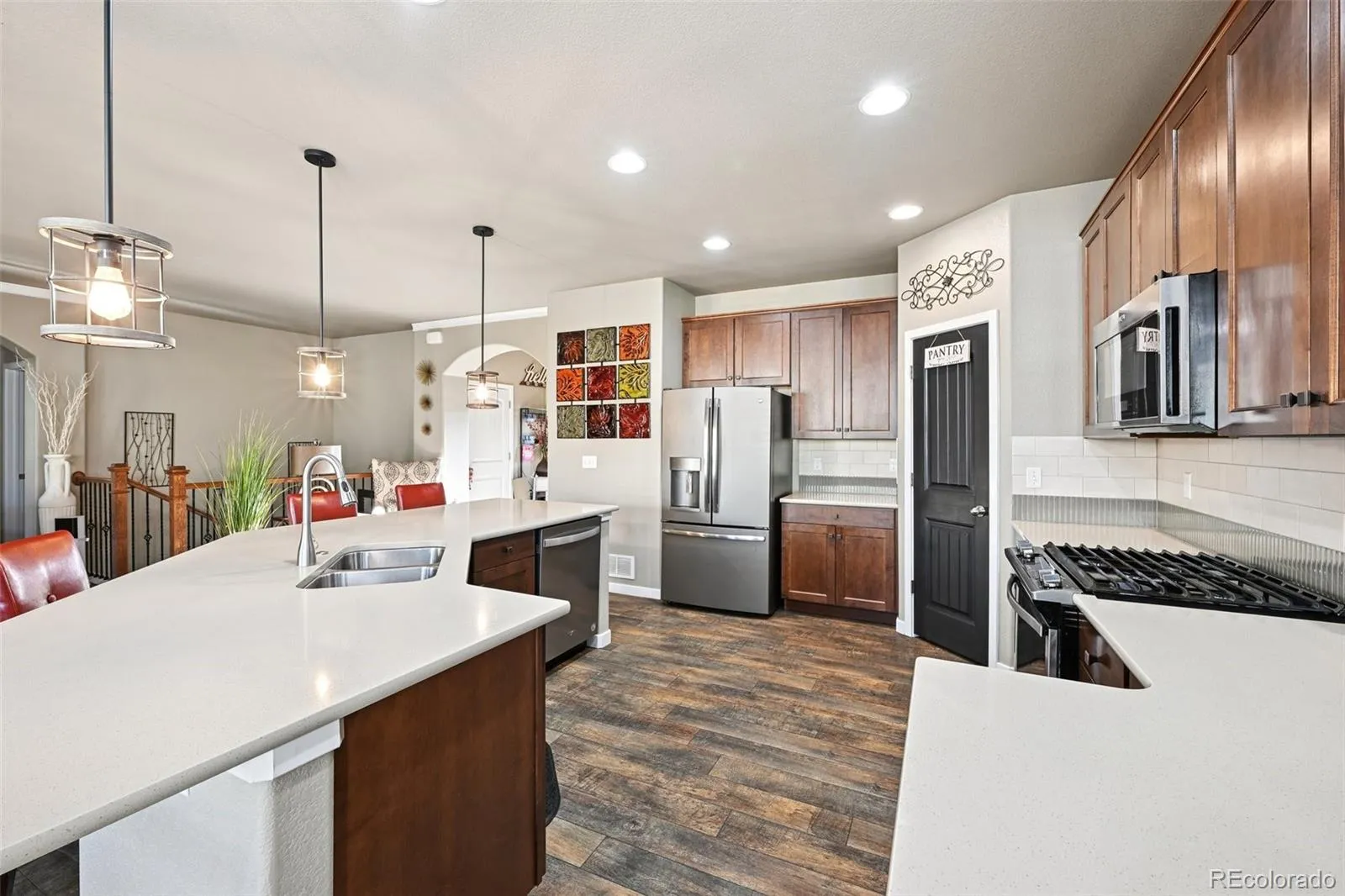 Beautiful 4-bedroom, 3-bath Rosewood Classic model in desirable Hannah Ridge! This home features a spacious kitchen with quartz island, gas stove, walk-in pantry, and adult-height cabinets. Main level offers laundry room and access to a covered patio with exterior shades. Finished basement boasts 9+ ft ceilings, bonus room, plenty of storage, and pre-plumbing for a wet bar. Additional highlights include a radon system, ceiling fans, window well covers, and a 2-car garage. Xeriscaped yard with gazebo and storage shed complete this move-in ready home.
