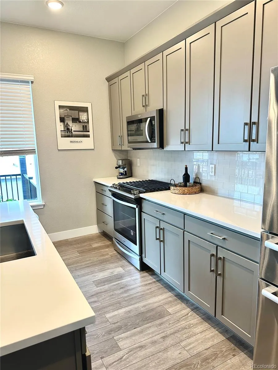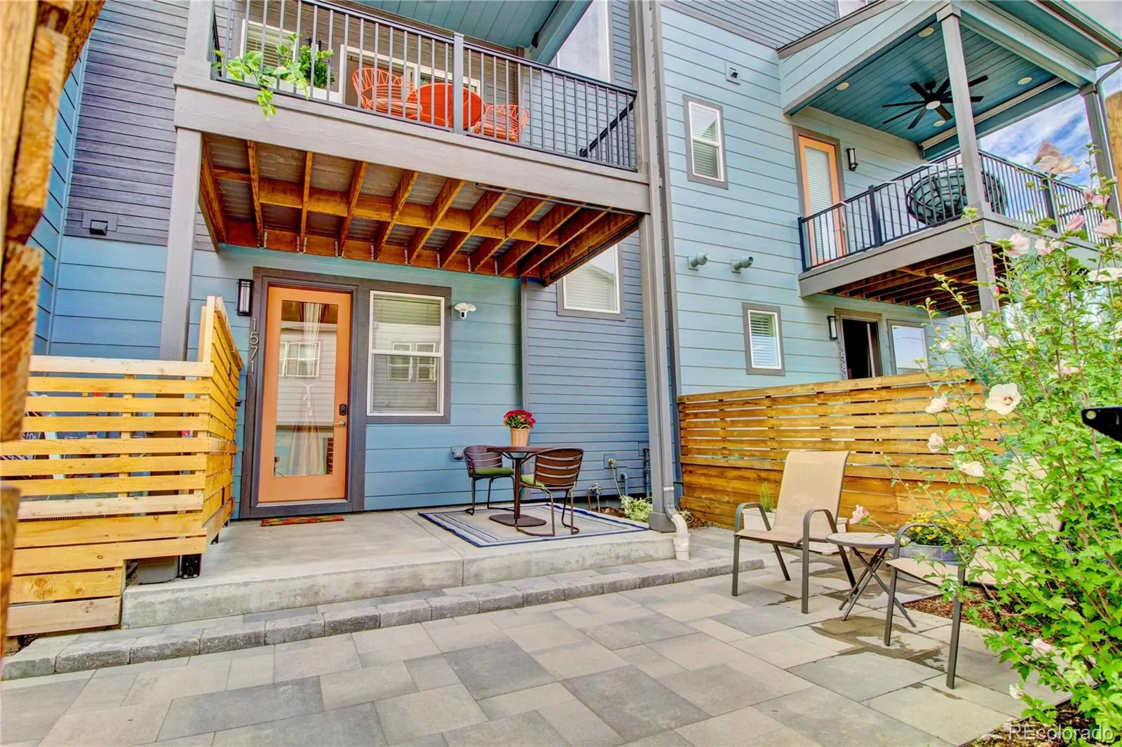 Stunning, energy-efficient 3BR/4BA smart townhome with owned solar panels, Level 2 EV charger, and outdoor space! This light-filled home features 9’–10’ ceilings, reclaimed wood/metal built-ins, Electrolux washer/dryer, Bosch fridge with roll-out shelves, quartz counters, and Minka Aire ceiling fans. The open-concept main level offers 10’ ceilings, stainless appliances, breakfast bar (seats 4), a gas fireplace, powder room, and access to a covered deck with ceiling fan. Custom 10’ built-ins add style + storage. Upstairs: en-suite guest bedroom and spacious primary retreat with walk-in closet, dual vanities, linen closet, and private W/C. Laundry, HVAC, and tankless water heater all on this level. Lower-level en-suite works perfectly as a guest suite or office, with walk-out access to a private, fenced, professionally landscaped + irrigated yard. Garage features a full Gladiator storage system including cabinets, gear tracks, baskets, and 3’ overhead shelves. CAT-6 outlets in each bedroom + dining nook = ideal WFH setup. Walk to brewery, café, dog parks, playgrounds, Montessori, and community garden. Near bike paths + easy access to Denver, Boulder, Golden, and highways. Low HOA covers trash, snow, and landscaping. Move-in ready!
