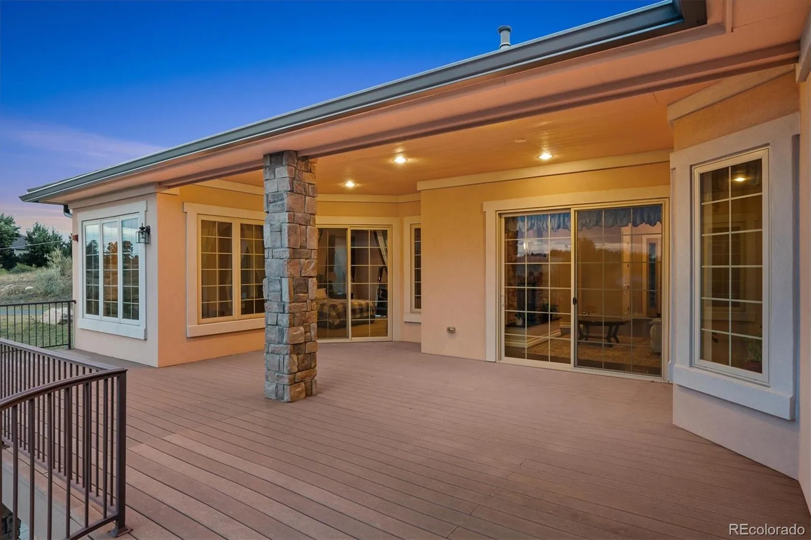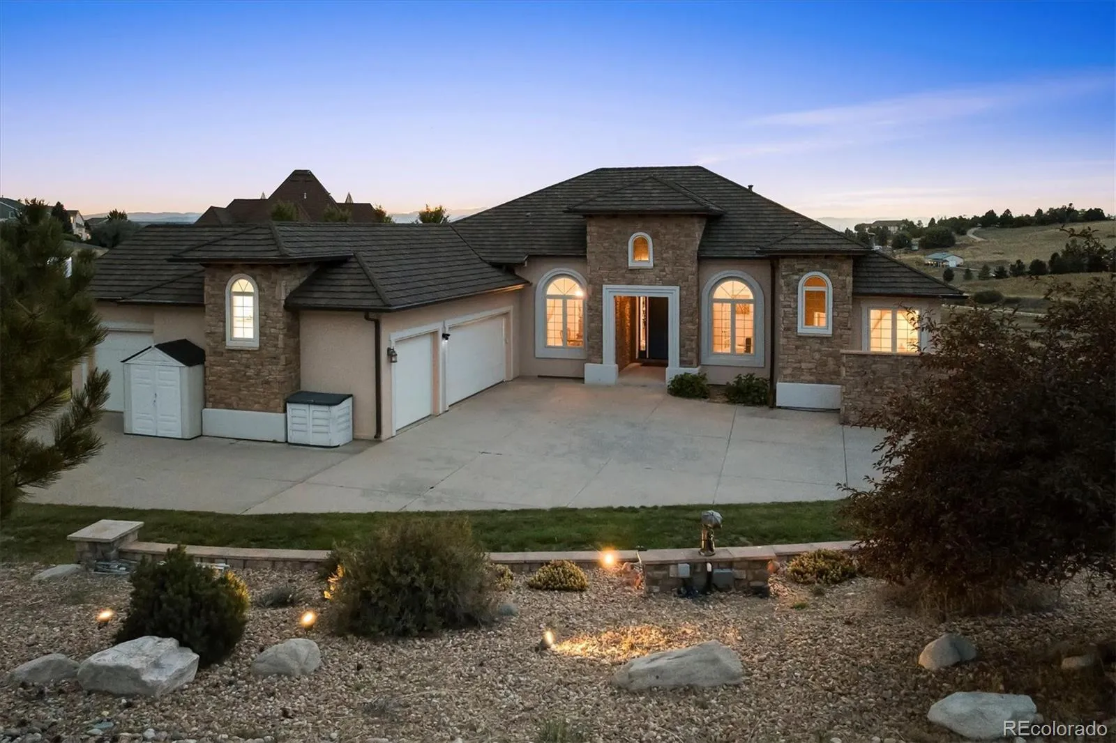Welcome home to serene country living situated on nearly 5.5 acres with breathtaking mountain views and easy access to all Downtown Parker has to offer. A quarter-mile drive arrives to 7372 Talon Trail; a sprawling ranch residence defined by intentional design, seamless flow, and refined finishes throughout. A newer steel coated roof and professional landscaping greet you from outside and unfold to 12’ ceilings with coffered detail, tile-inlay hardwood floors and over 6,800 sqft of functional living and entertaining space. The main level features formal living and dining spaces, a spacious family room anchored by a dual-sided gas fireplace, and a well-appointed kitchen featuring granite counters, a stainless steel GE Monogram appliance package, a center island, and custom cabinetry. Retreat to the main-level primary suite, complete with deck access, a private sitting area, dual walk-in closets, and spa-like 5-piece bath. Step outside to a sizable composite deck to take in sunset and mountain views. The finished lower level is an entertainers dream featuring a spacious recreation room, sleek wet bar, game area, and a state-of-the-art home theater with a projector and tiered seating. A secluded guest suite or mother-in-law suite rounds out the lower level and offers easy access to the outdoors. Step outside to the stamped concrete patio to relax under the stars in the hot tub while overlooking mature professional landscaping. Additional features of this turn-key residence include a designated home office, a private well and septic, newer dual furnaces, upgraded Daikin AC, A 4-car finished garage with epoxy flooring and integrated LED lighting. Just minutes from Downtown Parker’s extensive dining, shopping, and entertainment, along with award-winning Douglas County Schools, this location offers the perfect balance of convenience and country living.