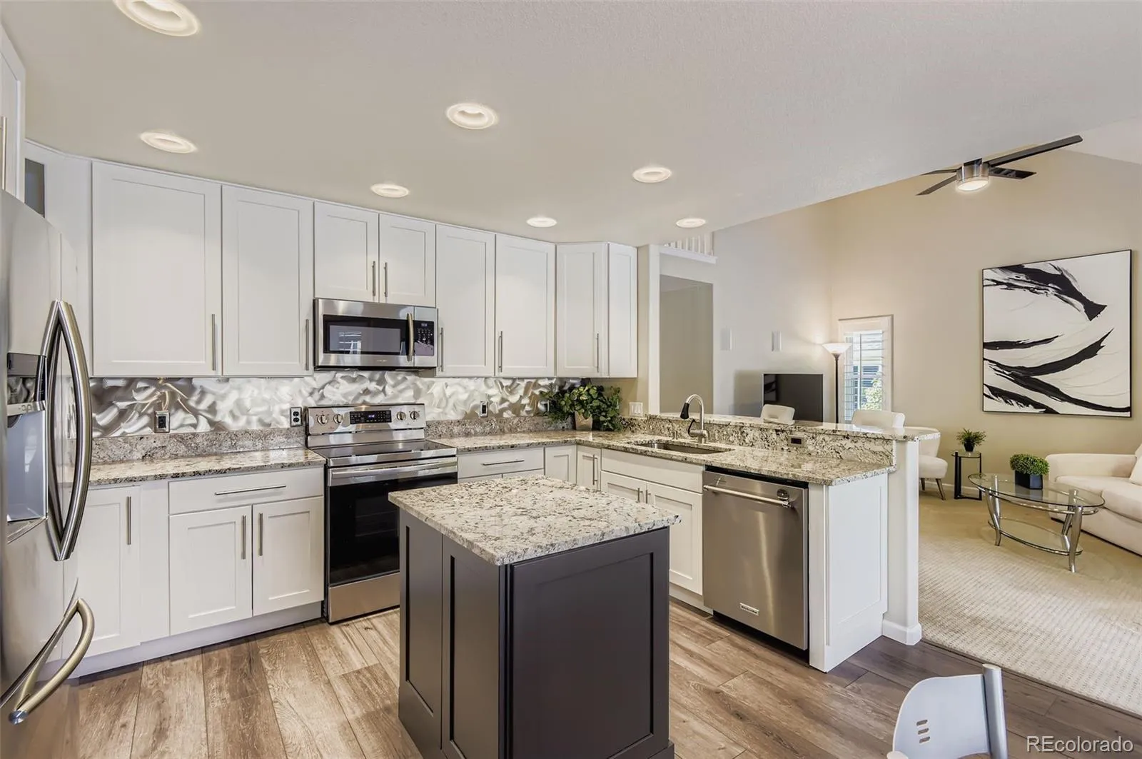 On the main level, you’ll find wide-plank flooring, a welcoming living room with a fireplace, a formal dining room, and a spacious family room with soaring ceilings. The beautifully renovated kitchen connects seamlessly to the family room and features white shaker cabinets, granite countertops, and stainless steel appliances.
