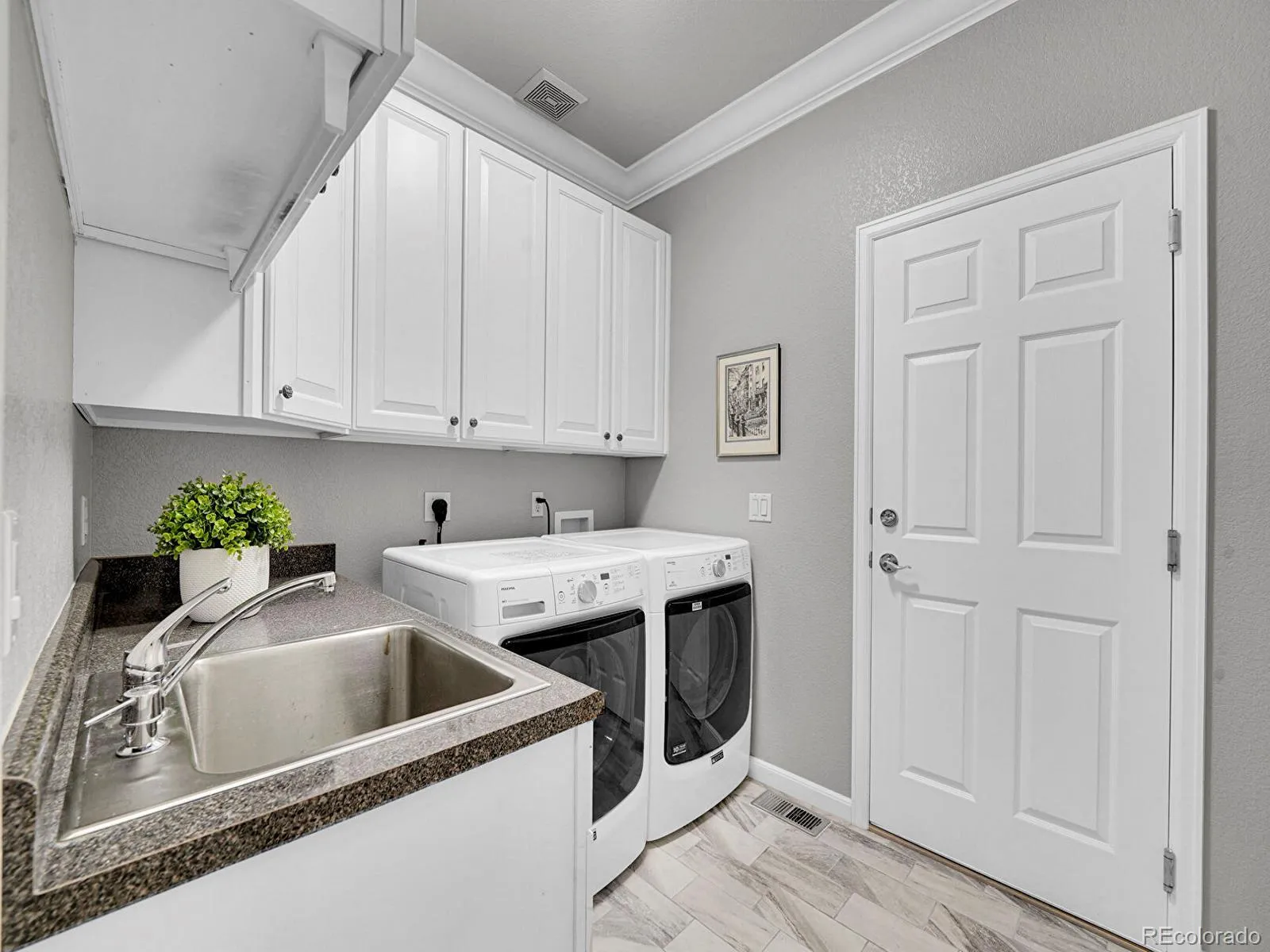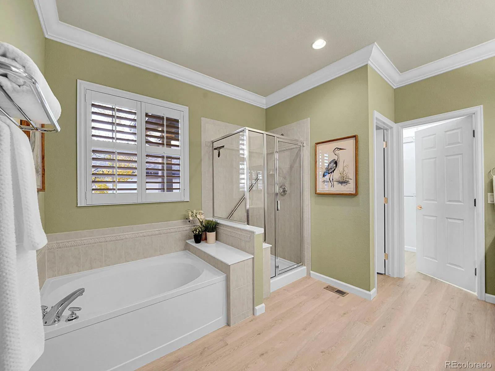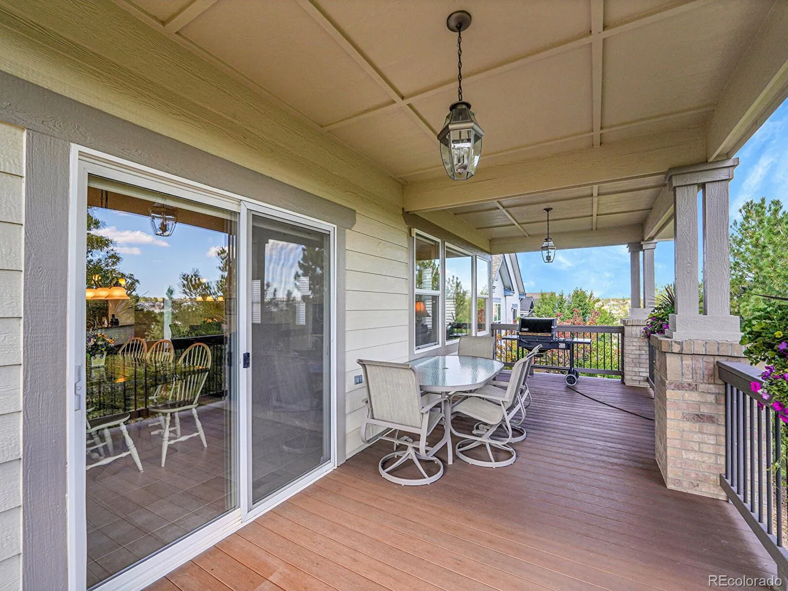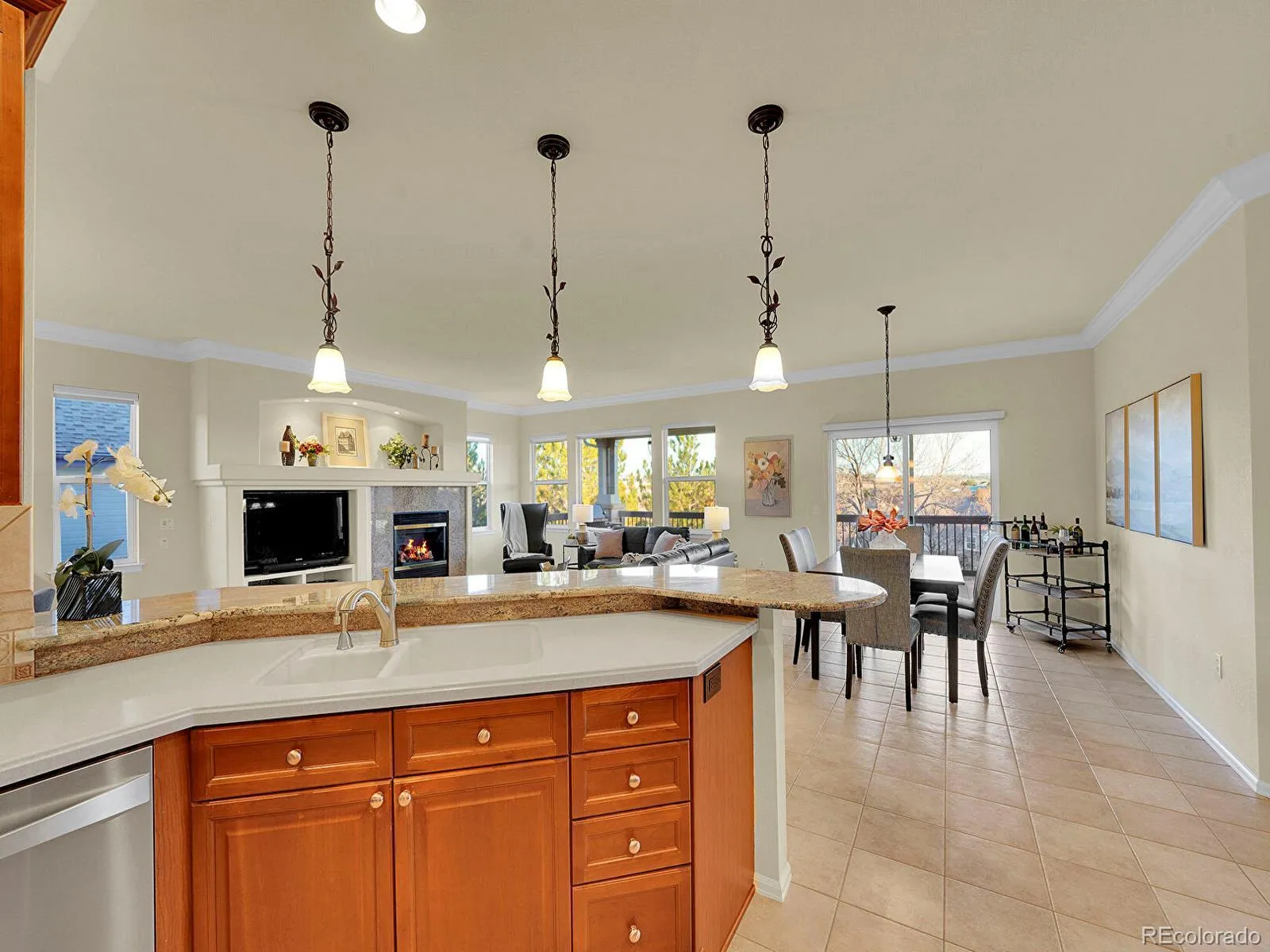 Bright and airy single-family ranch in sought-after Heritage Eagle Bend! Designed for main-level living and entertaining, this 4-bed, 3-bath home boasts tranquil greenspace views surrounded by evergreens, a brand-new roof, an oversized 2-car garage, and a finished walkout basement. Lush garden beds and a covered patio lead into the open main level, accented by crown molding and bright windows. A formal dining area flows seamlessly into the living room, an expansive space for entertaining anchored by a gas fireplace and warm built-ins. Boasting rich cherry cabinetry, stainless appliances, a pantry, and a peninsula with seating, the open kitchen keeps the chef in the action. The dining room opens to the covered upper deck through sliding glass doors, perfect for barbecues or morning coffee. Unwind in the main-level primary suite, featuring a tray ceiling, walk-in closet, and five-piece en suite bath with soaking tub, stand-up shower, and seated vanity. A comfortable second bedroom with a walk-in closet connects to a dual-access en suite full bath, while a third non-conforming bedroom is brightened by wall-to-wall windows and French doors, perfect for a guest room or home office. Convenient main-level laundry with extra storage! The walkout basement features a sprawling rec room with a kitchenette, built-in bookcases, gas fireplace, and sliding glass doors leading to the covered patio. A basement bedroom, dual-access ¾ bath, and 2 bonus rooms create privacy for multigenerational living or guests. Enjoy peaceful greenspace on the covered upper deck or lower patio, perfect for dining al fresco. Embrace the Heritage Eagle Bend lifestyle! This gated 45+ community is built around an 18-hole golf course, indoor/outdoor pools, fitness center, restaurant, and activities like pickleball, tennis, bocce, and billiards. Located just minutes from Southlands Mall, Aurora Reservoir, and Parker Main Street, with easy access to C-470 and DIA.