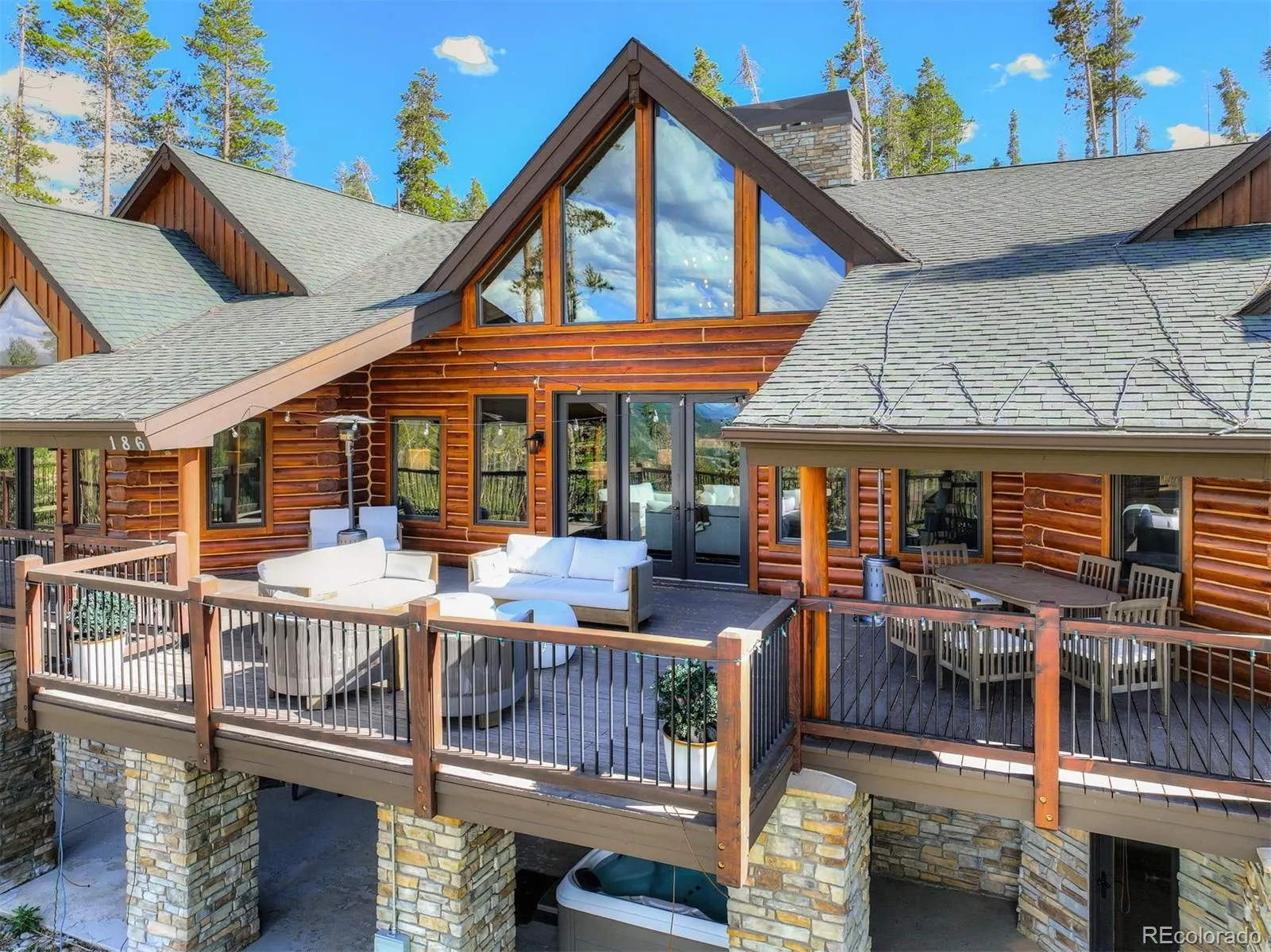 Spectacular Colorado Log Retreat with Panoramic Mountain & Lake Views Perched above Breckenridge with sweeping views of the Ten Mile Range, Buffalo Mountain and Lake Dillon, this extraordinary 6,500 square foot Colorado log home blends rustic elegance with modern luxury. Designed for grand living and entertaining, the home features expansive multi-living areas and spacious bedrooms—all with en-suite, custom-designed baths. At the heart of the living room is an iconic fireplace, creating a dramatic focal point beneath soaring ceilings. The chef’s kitchen is a true showpiece, boasting a massive live-edge island, Sub-Zero and Wolf appliances and high-end finishes throughout. An elevator adds convenience, while wraparound outdoor living spaces offer sun-soaked decks and a private hot tub to take in the alpine views. Ideally located just minutes from world-class skiing, dining, hiking, biking, fishing, and boating, this home delivers a one-of-a-kind mountain lifestyle with top-tier amenities, stunning craftsmanship and unforgettable surroundings.