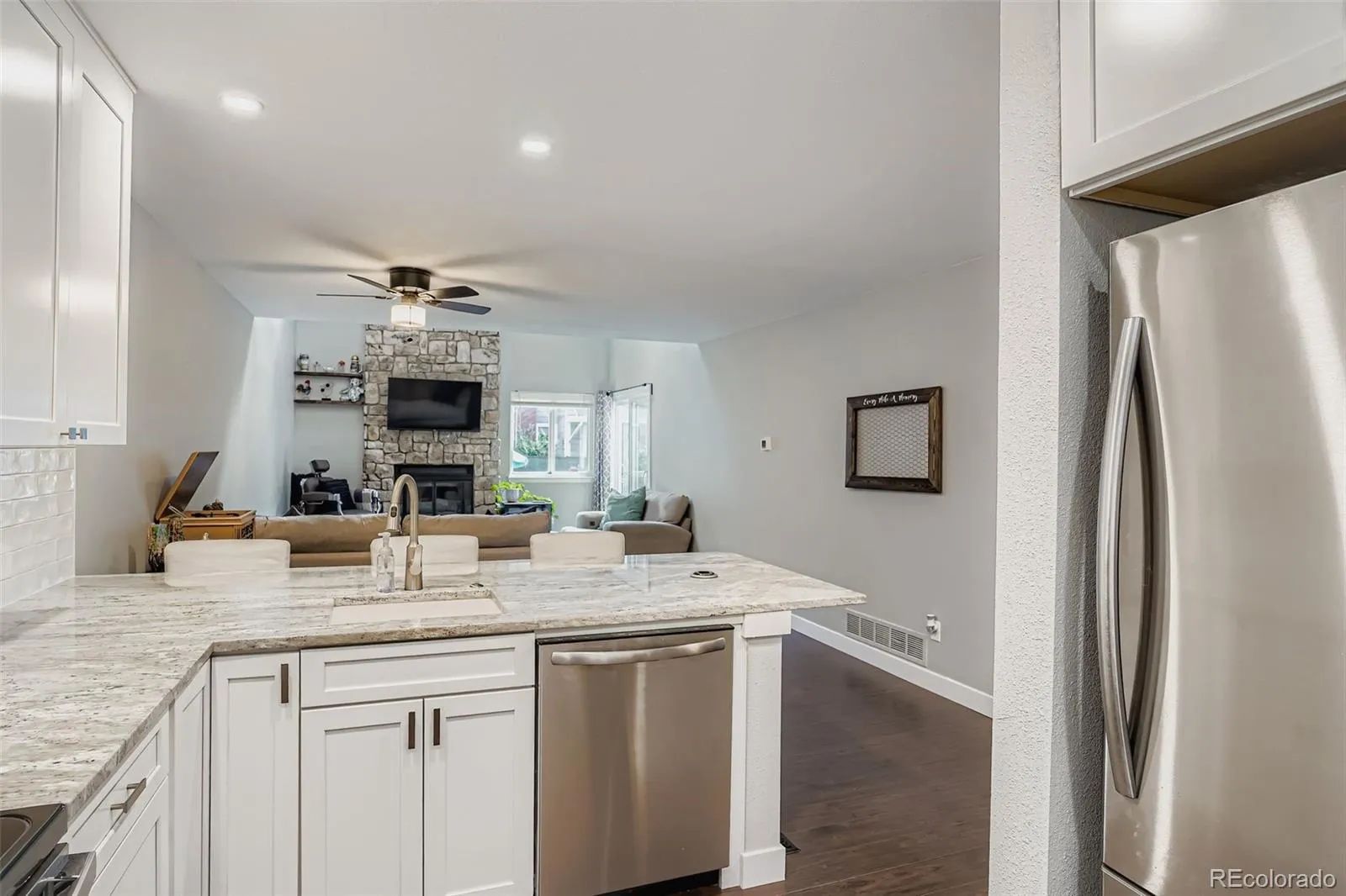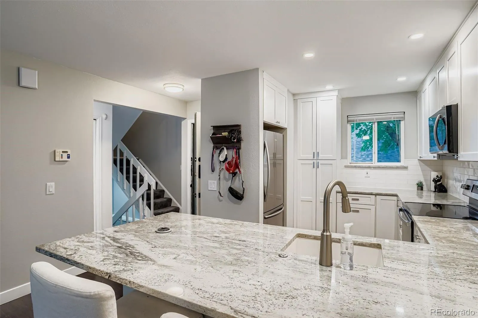 Stunning updates in this 3 bed, 2 bath, 2,200 finished SF townhome! Gorgeous laminate flooring throughout the main level. Beautiful kitchen remodel has white soft-close shaker cabinets, including two lazy-Susan’s, Stainless steel applc’s, granite counter tops w/custom tile backsplash, breakfast bar & LED recessed lighting! The dining area w/ceiling fan is right off the kitchen and flows directly into the vaulted living room w/rock wall fireplace and patio door access to the back deck overlooking the pool! You’ll also find a nice sized main level bedroom w/patio door access to the back deck, and a fully remodeled 3/4 bath, which makes a great 2nd primary. The entire upstairs is the Primary Suite! Brand new carpet & paint, 4 closets and a bonus nook with a window that can be used as a workout, home office or nursery space! The nicely remodeled full bath has an open shelving nook for extra storage. The fully finished basement has brand new carpet throughout and includes a large family room w/recessed lighting, a non-conforming bedroom, laundry room & utility/stg room! Don’t miss this beautiful townhome that has been meticulously updated throughout and backs to the pool! The one car detached garage is just in front of the unit and you have the use of one other permitted parking spot. This is a must see! Easy access to major roads & highways, several parks (incl. Cherry Creek Reservoir), walking paths, shopping (incl. Costco) restaurants and more!