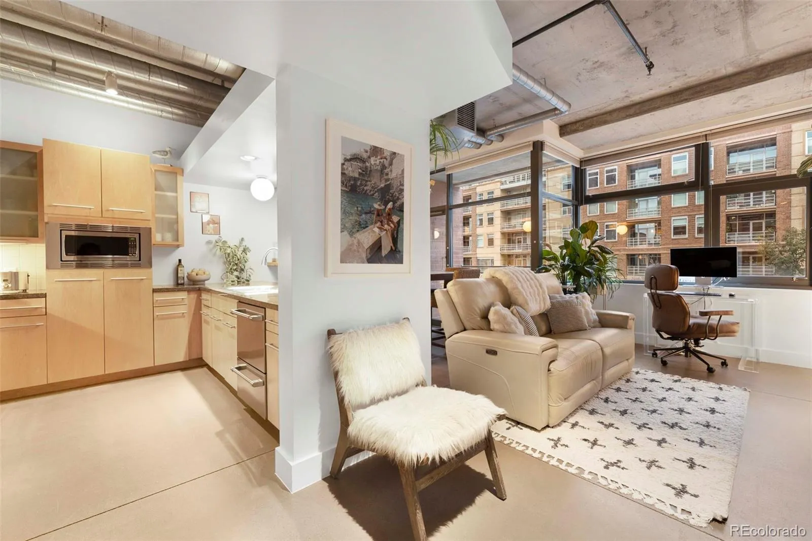 Experience contemporary loft living in one of Riverfront Park’s most desirable neighborhoods, Promenade Lofts. This 1,136 sq ft residence offers two bedrooms and two bathrooms, combining modern design with industrial character. Polished concrete floors, exposed ceilings and beams throughout, and large double-pane windows in the living room create an authentic urban feel.
