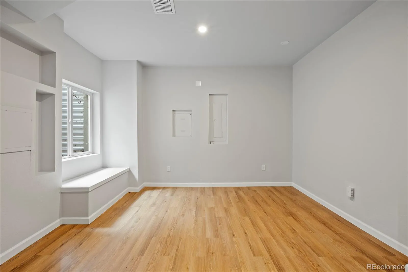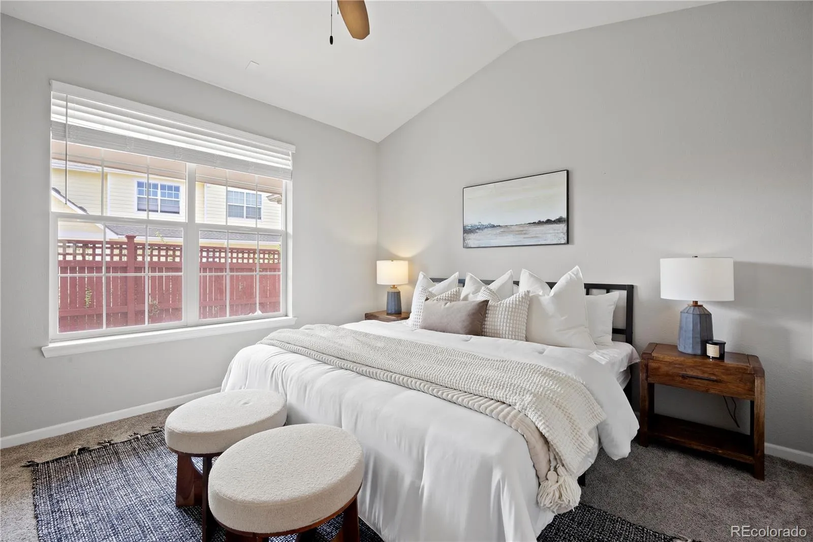 The main floor primary suite feels like a retreat, with vaulted ceilings, dual closets, and an ensuite bath. Upstairs, a sun-soaked bedroom with vaulted ceilings and huge windows overlooks the pool and park across the street, while another flexible bedroom and full bath complete the space. The newly finished basement adds a fourth bedroom with custom built-ins, window seat, and recessed lighting—ideal for guests, an office, or creative space.