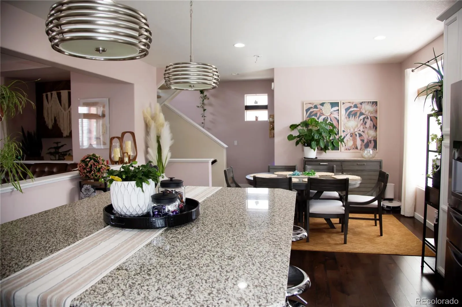 Step inside to find an open-concept main floor with a large family room and a bright, eat-in kitchen—ideal for hosting guests or enjoying quality time with family. The kitchen is a true showstopper, boasting granite countertops, a crushed granite sink, engineered hardwood flooring, and custom wood accents throughout.