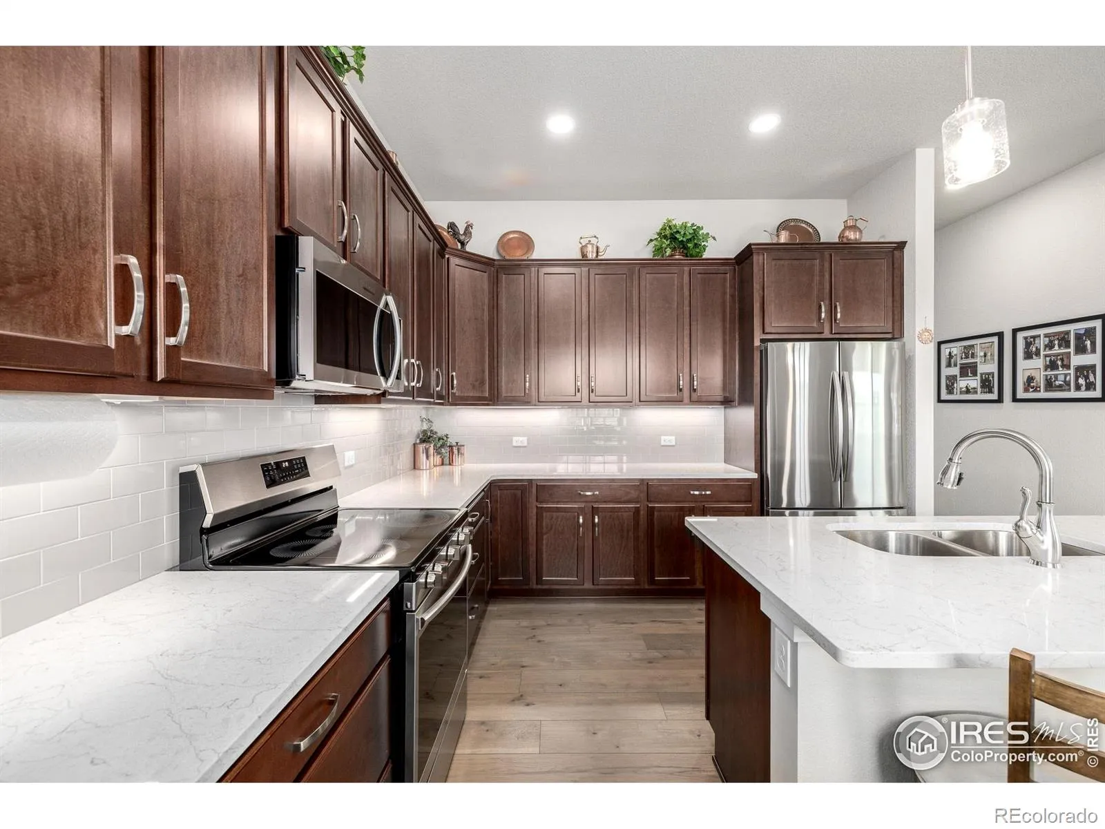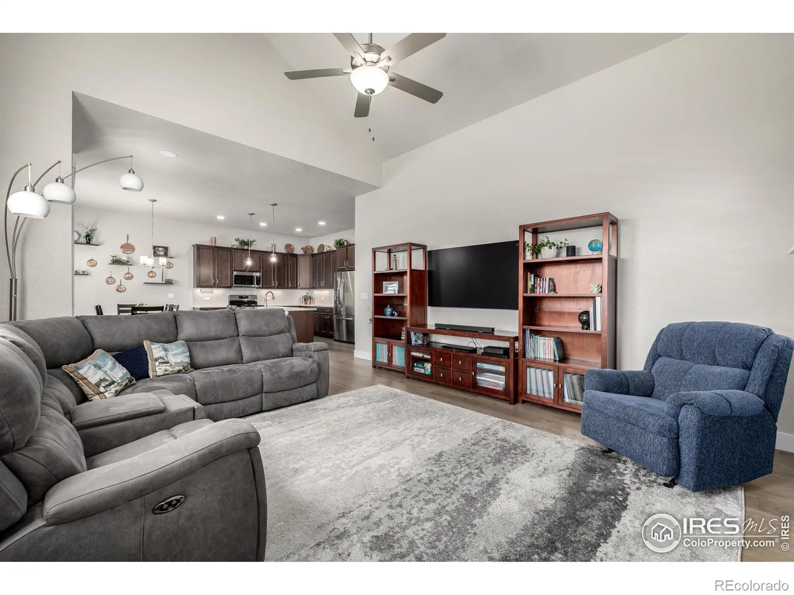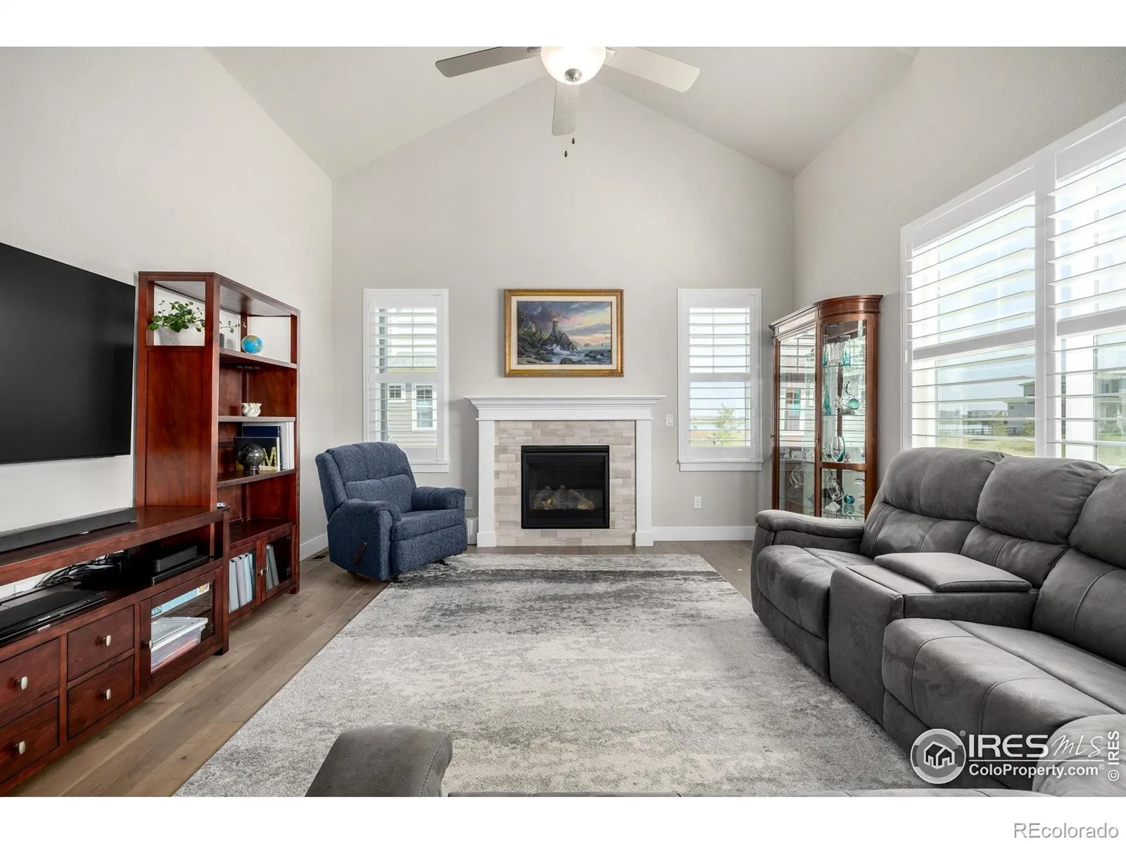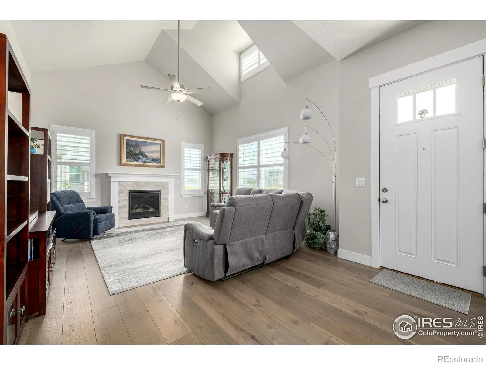 With sweeping lake views and a coveted end-unit setting, this townhome in The Lakes at Centerra offers a lifestyle of both beauty and convenience. A welcoming front porch patio opens to a thoughtfully designed interior where vaulted ceilings, abundant natural light, and a flowing open floor plan create an atmosphere of comfort and ease. The main level features a pristine living room accented by warm wood flooring and a fireplace that anchors the space. The kitchen is designed for both form and function, offering generous cabinetry, quartz counters, stainless appliances, and a spacious island that serves as a natural gathering point. The first-floor primary suite provides comfort and privacy, complete with an ensuite bath and walk-in closet. The finished basement expands the living space with a versatile family room, additional bedroom, and bath, ideal for guests or quiet retreats. A rear-entry two-car garage offers convenience and security, while the fenced yard invites time outdoors with panoramic water views. Set in immaculate condition and perfectly situated near shops, dining, and trails, this home pairs tranquility with everyday access. Plantation shutters, refined finishes, and smart design details elevate each space, making this residence a rare opportunity in one of Loveland’s most desirable communities.