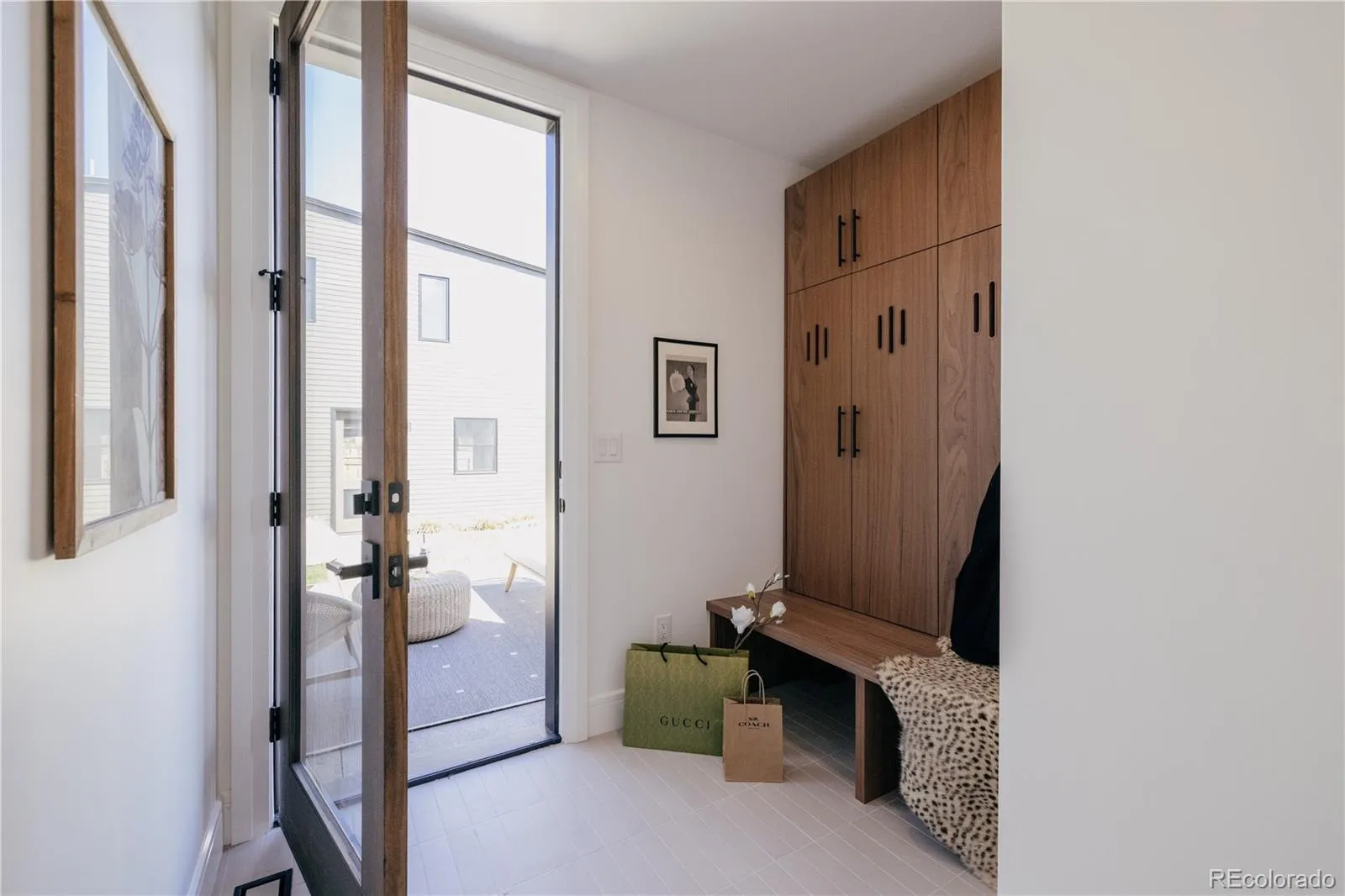 The spacious primary suite features large windows, a freestanding tub, and a curbless walk-in shower for a luxurious spa experience. A dedicated office with a private exterior entrance provides a quiet space for work or meetings, while the mudroom with custom lockers ensures convenient organization.
