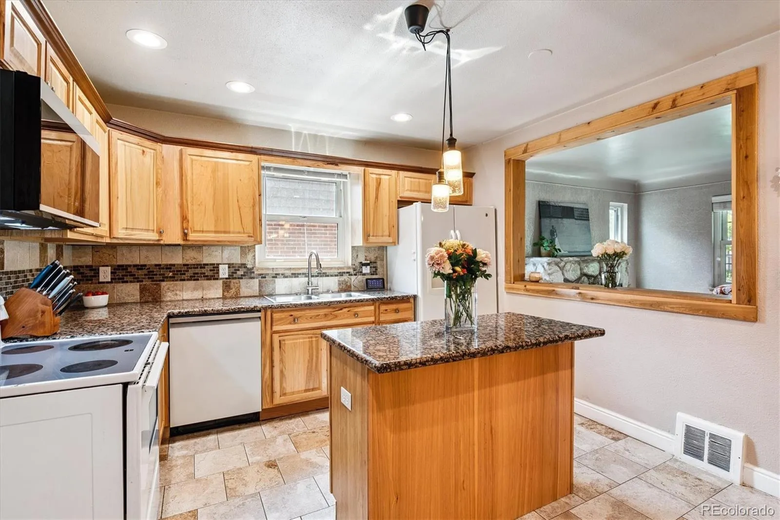 A quaint front porch leads to an open layout w/an updated kitchen featuring newer countertops, new dishwasher & microwave/hood, a functional kitchen island & built-in breakfast nook.