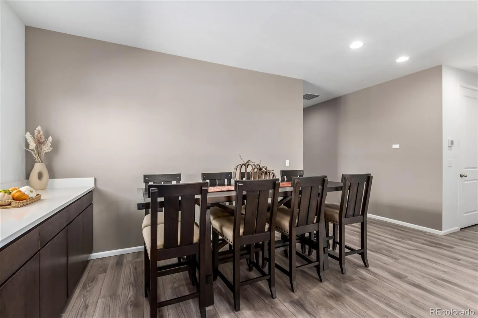 The kitchen is a showstopper with rich cabinetry, quartz countertops, stunning slate appliances, and a generous center island with bar seating. It’s perfect for casual breakfasts, entertaining guests, or preparing family meals. Just off the kitchen, the dining area provides a warm, inviting space for gatherings.