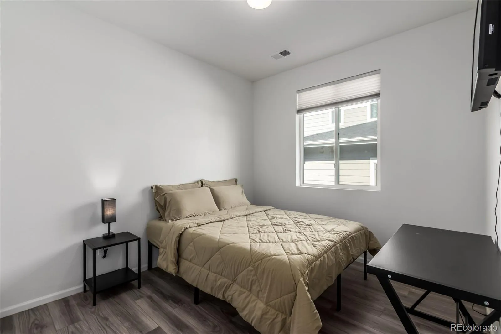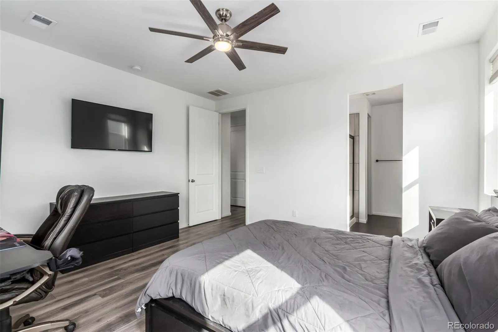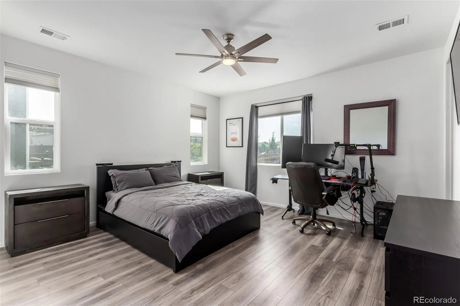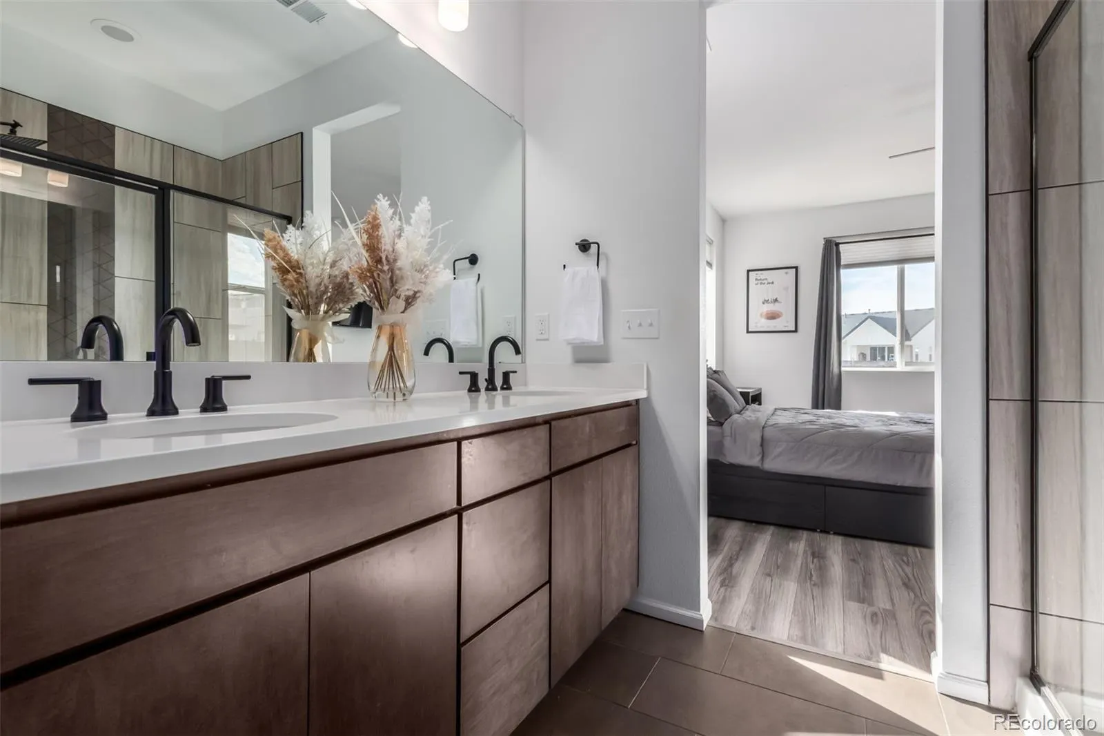 The primary suite is a private retreat with large windows, an en-suite bath featuring dual sinks, a walk-in shower with modern finishes, and a walk-in closet. Two additional bedrooms are versatile in function, ideal for family, guests, or a home office. The second full bath is conveniently located and stylishly finished.
