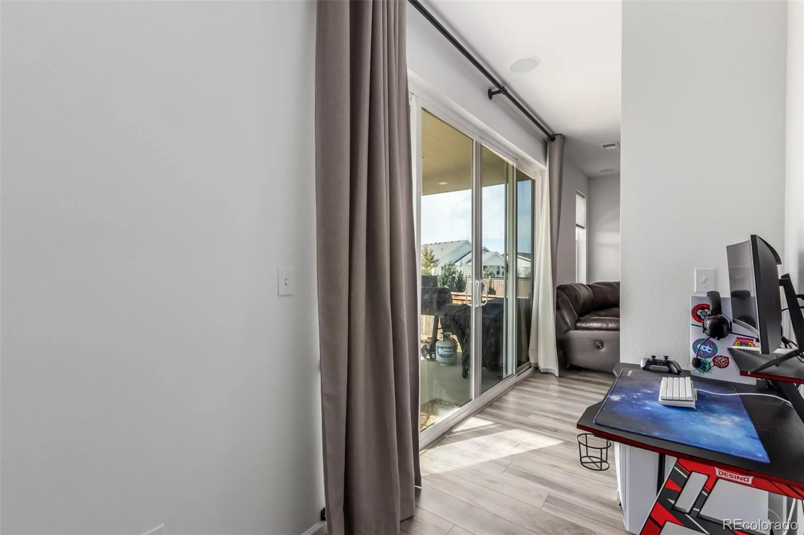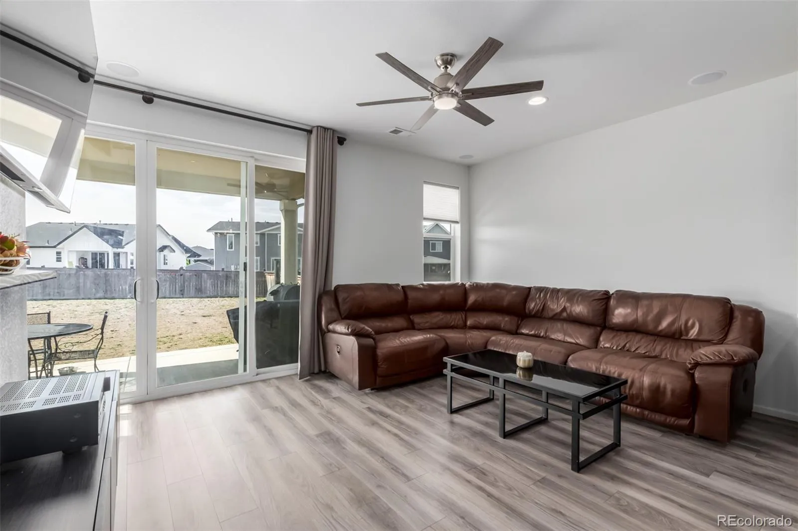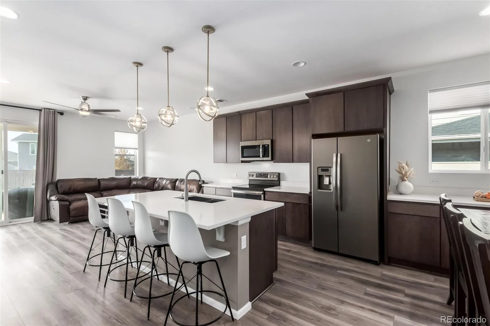 Once inside discover a light-filled open concept floor plan with sleek laminate flooring that flows seamlessly throughout the main living areas. The spacious living room is designed for both comfort and entertainment, featuring built-in surround sound and large sliding glass doors that open to the backyard, bringing in natural light and offering easy indoor-outdoor living.