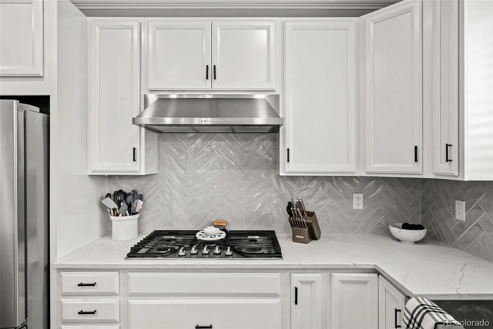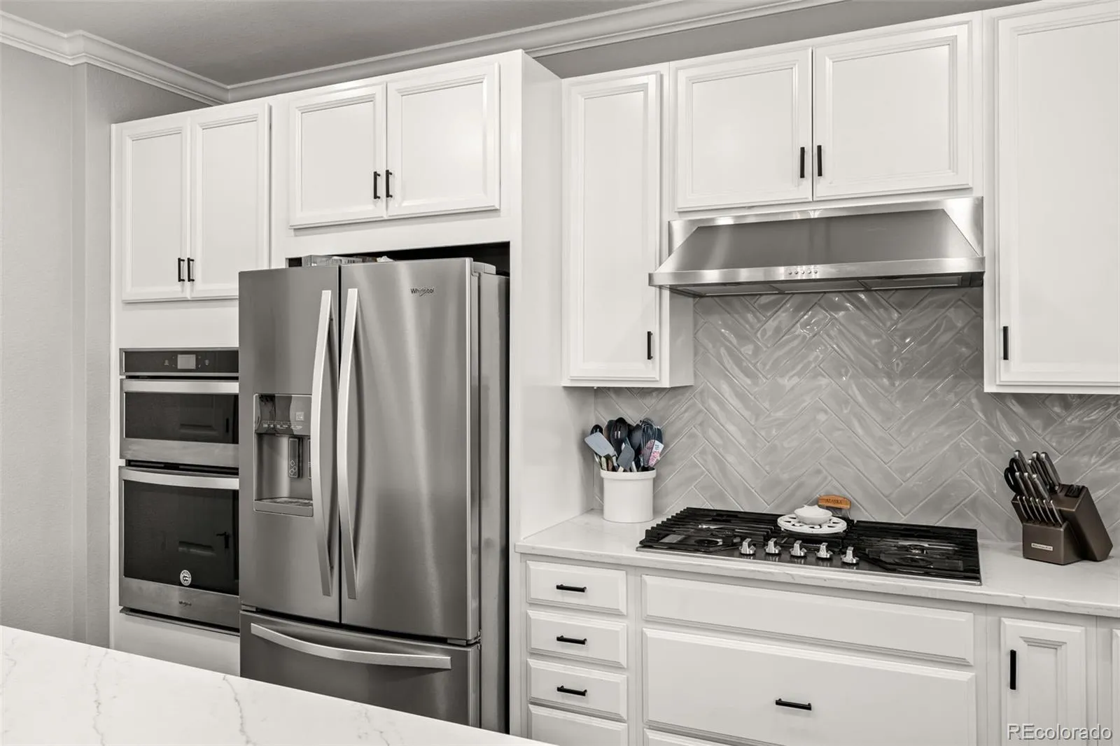 The gourmet kitchen features a stylish backsplash, double ovens, and a gas range—perfect for gatherings of any size. Step outside to a stamped concrete patio with no rear neighbors, offering privacy and space to relax.