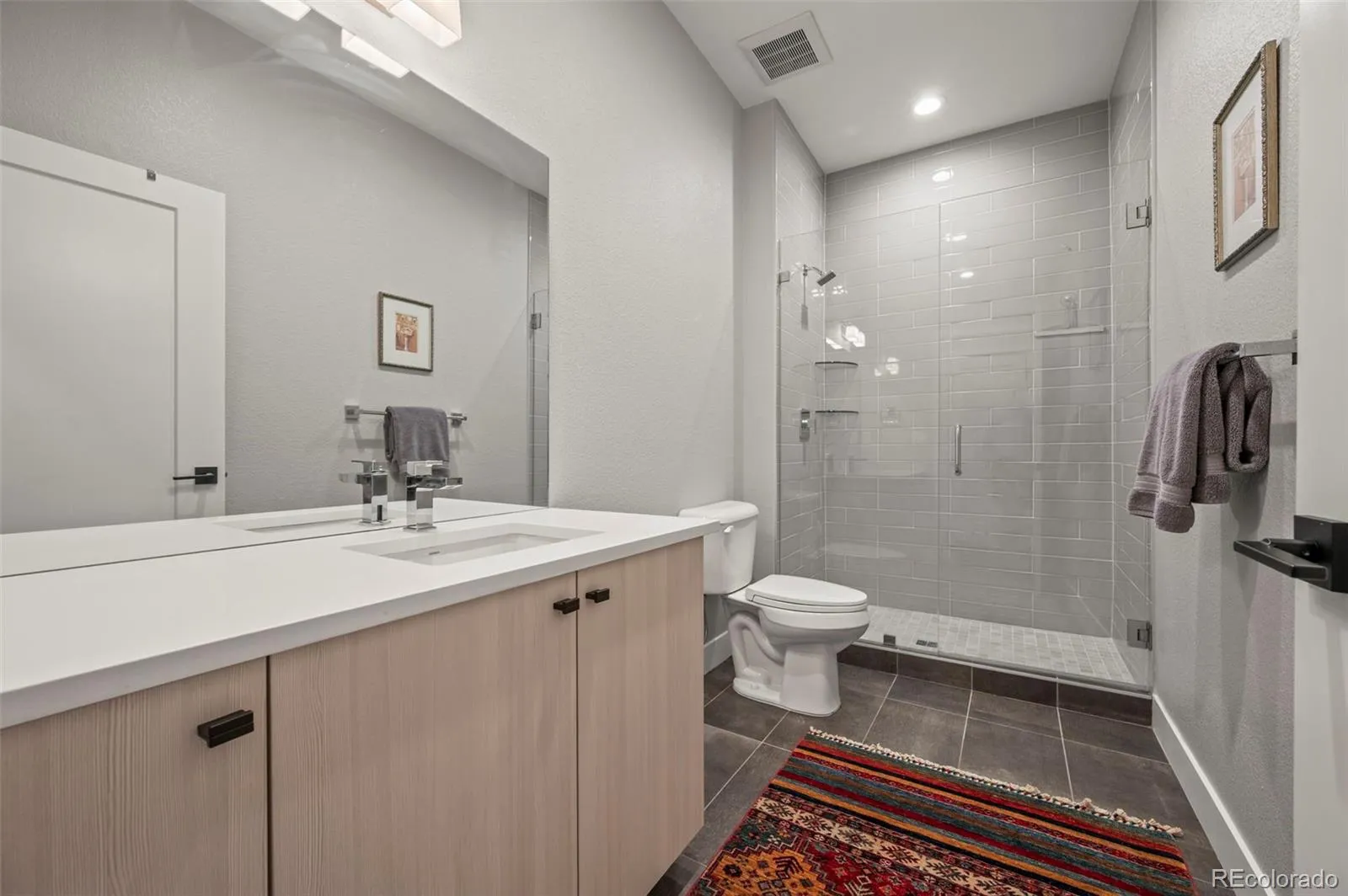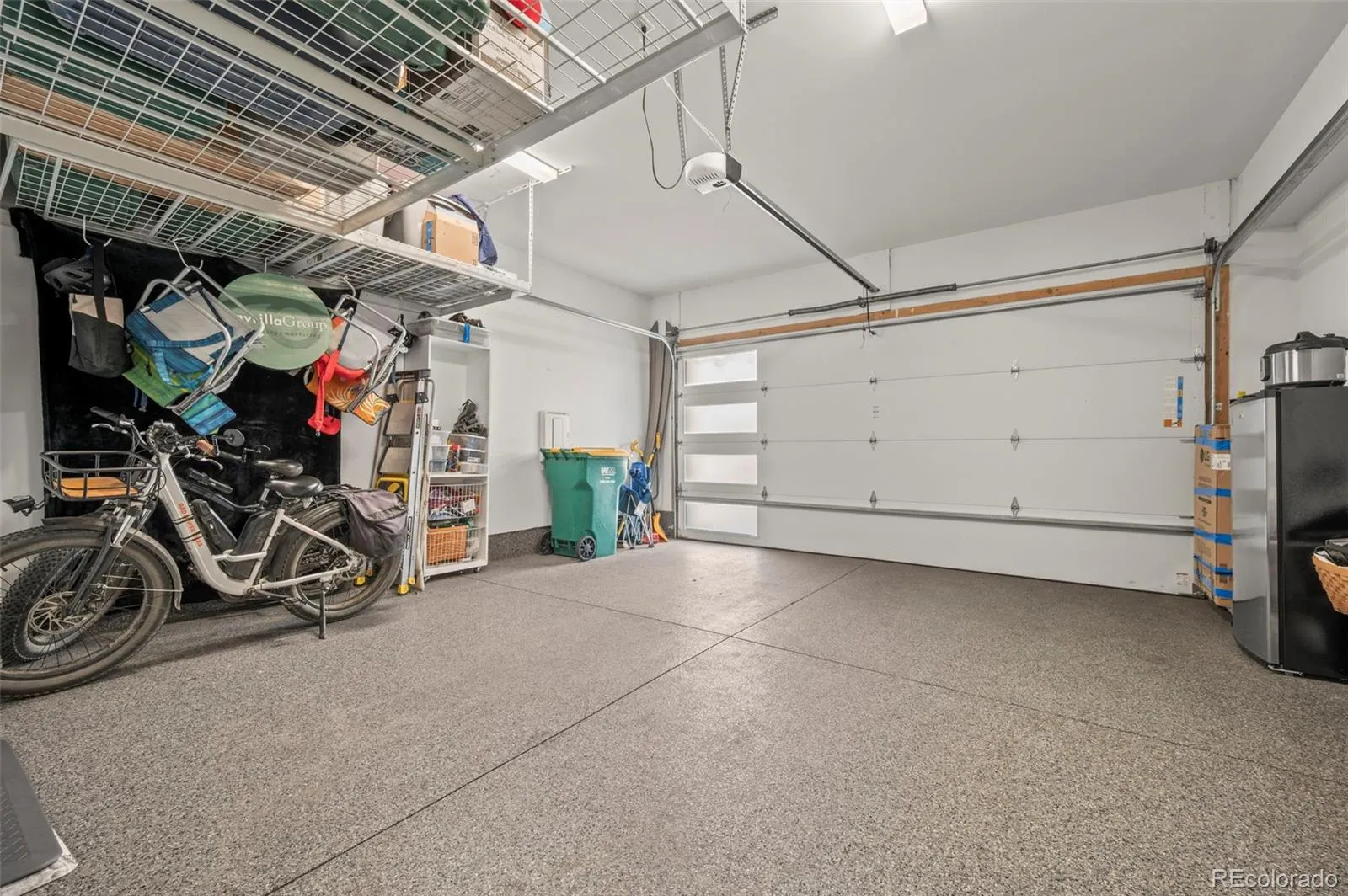 On the main level, you have a full bedroom with it’s own tucked away patio and a 3/4 guest bath with high end finishes, storage and the entrance to the two car garage. The attached two car garage has a drywalled interior and epoxy floor.