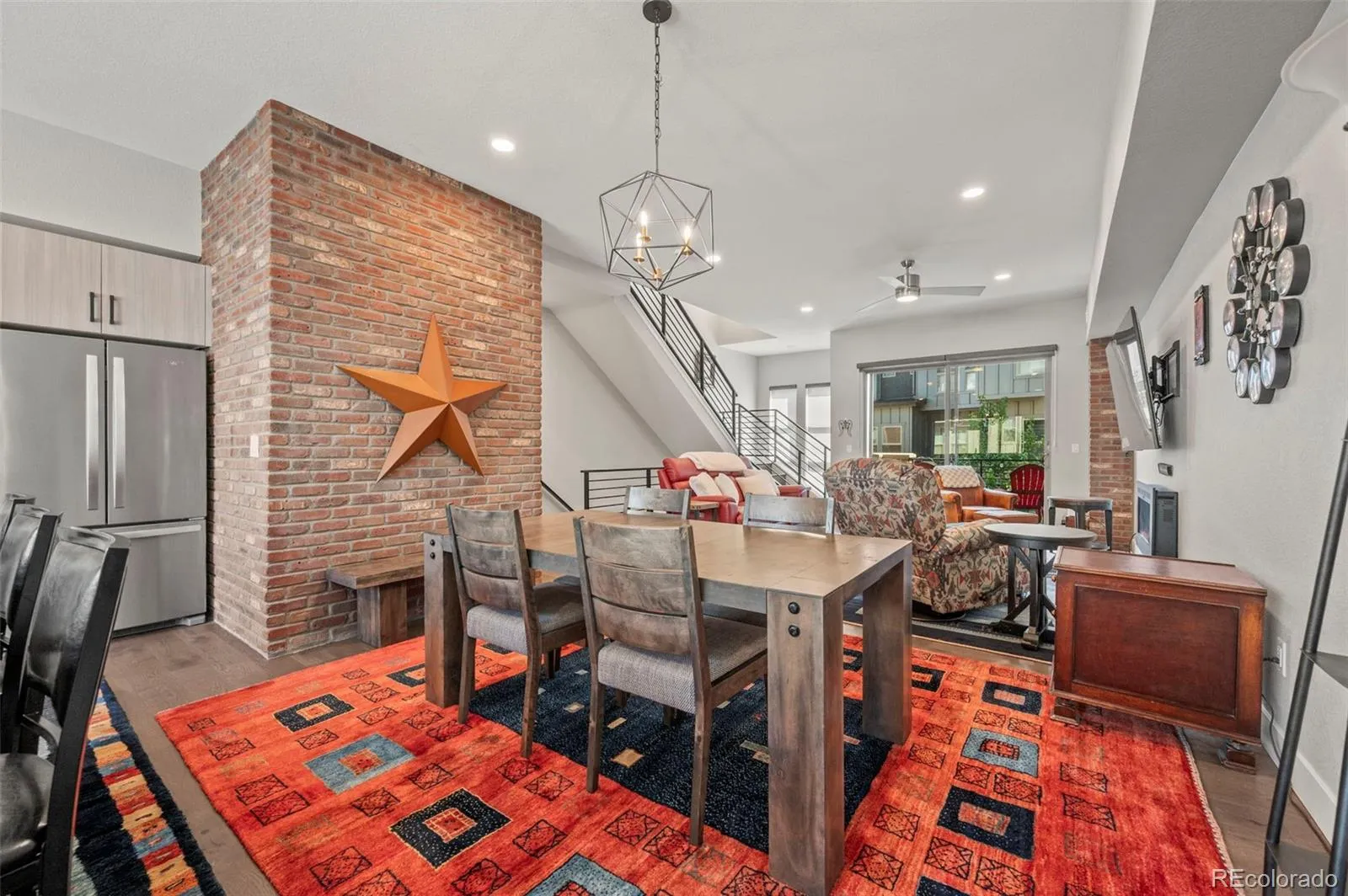 As you head up the first flight of stairs, you’ll find a bright and inviting living area featuring an open concept kitchen and an oversized island with separate dining area. The adjoining family room, complete with a cozy fireplace and unique brick accent wall provides the perfect setting for both relaxing evenings and entertaining. There’s a private powder bathroom perfect for when guests visit. The family room opens to a private covered balcony.