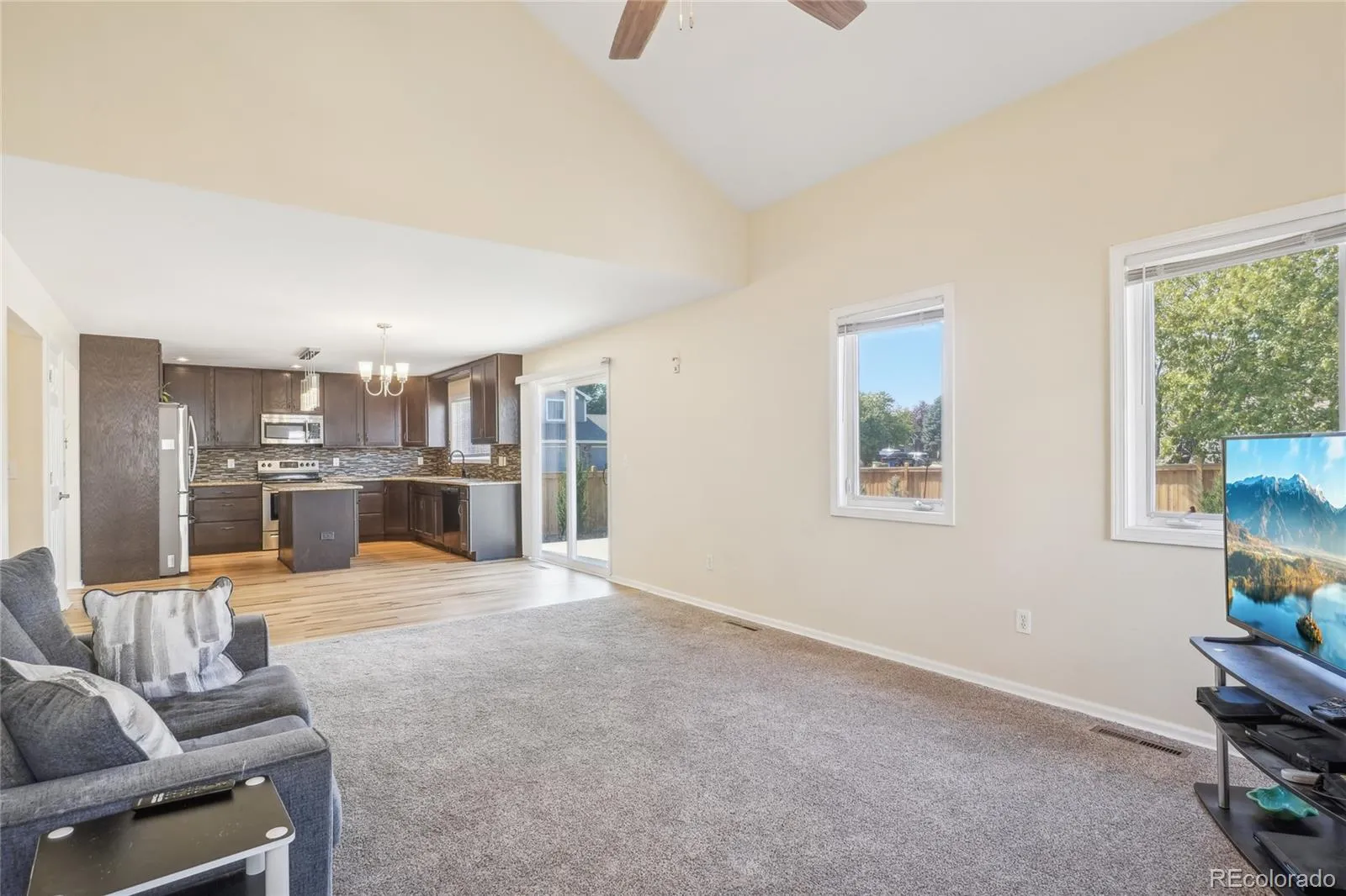 A lush, landscaped front yard greets you on arrival and leads into a bright, airy living room with soaring vaulted ceilings. The formal living room flows effortlessly into the dining room, creating an inviting space for entertaining. The open kitchen, informal dining area, and family room offer a more relaxed setting for everyday living. Here, vaulted ceilings, a cozy fireplace, and sliding glass doors to the backyard set the stage for seamless indoor-outdoor living. A main-level laundry room and powder bath add to the home’s practicality.
