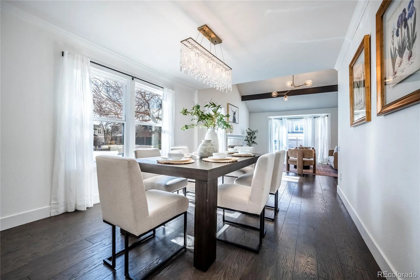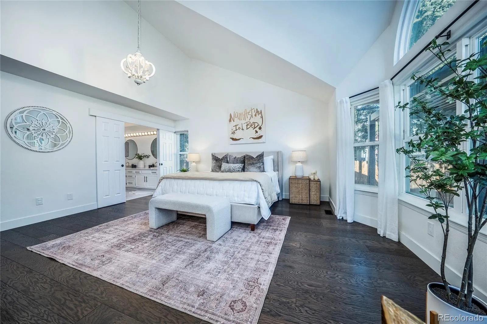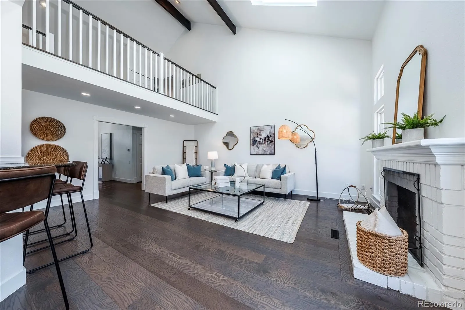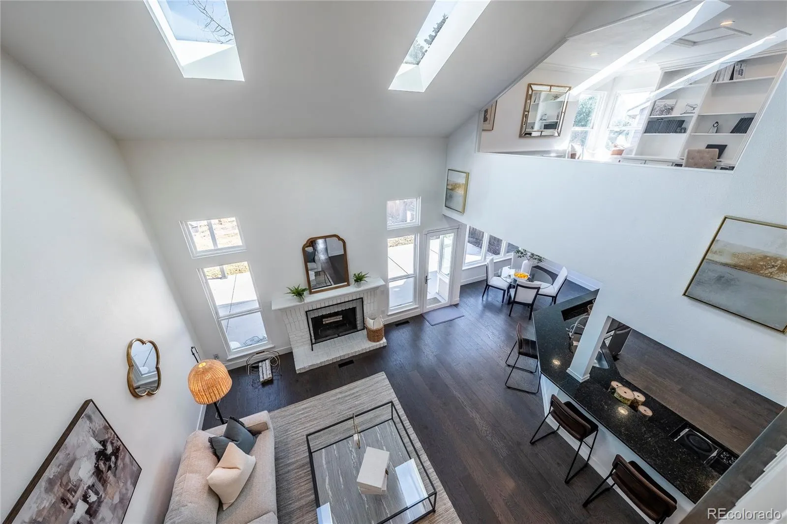 Step inside to soaring vaulted ceilings, wide-plank hardwood floors, and stunning wood beams. The main floor features formal dining and living rooms both featuring individual fireplaces, a powder bath, and a spacious family room with a second fireplace. The kitchen impresses with stainless steel appliances, ample cabinetry, and a sunny eat-in nook filled with natural light.