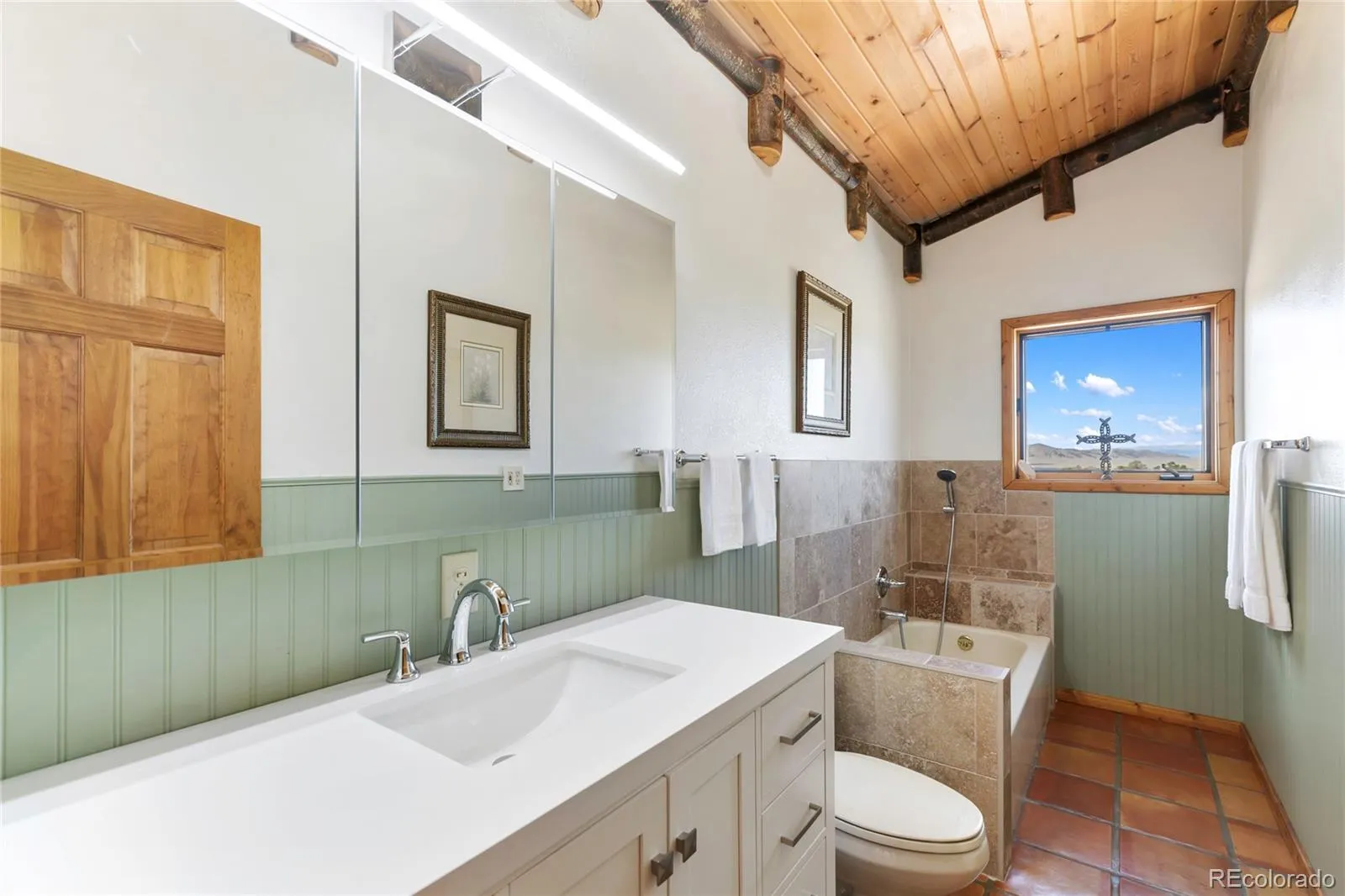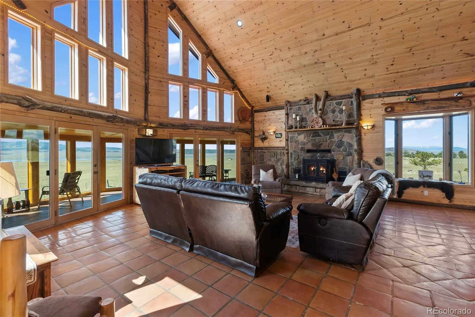 Inside, the home blends durability with warm mountain character. Radiant heat beneath handcrafted Saltillo tile keeps gear drying and floors warm after long days in the field. The gourmet kitchen features bold live-edge counters and custom cabinetry—built tough, beautiful, and ready for big cooking days or early-morning staging before heading out. The great room’s open layout and expansive windows frame ridgelines, roaming wildlife, and shifting weather patterns that define high-country living.