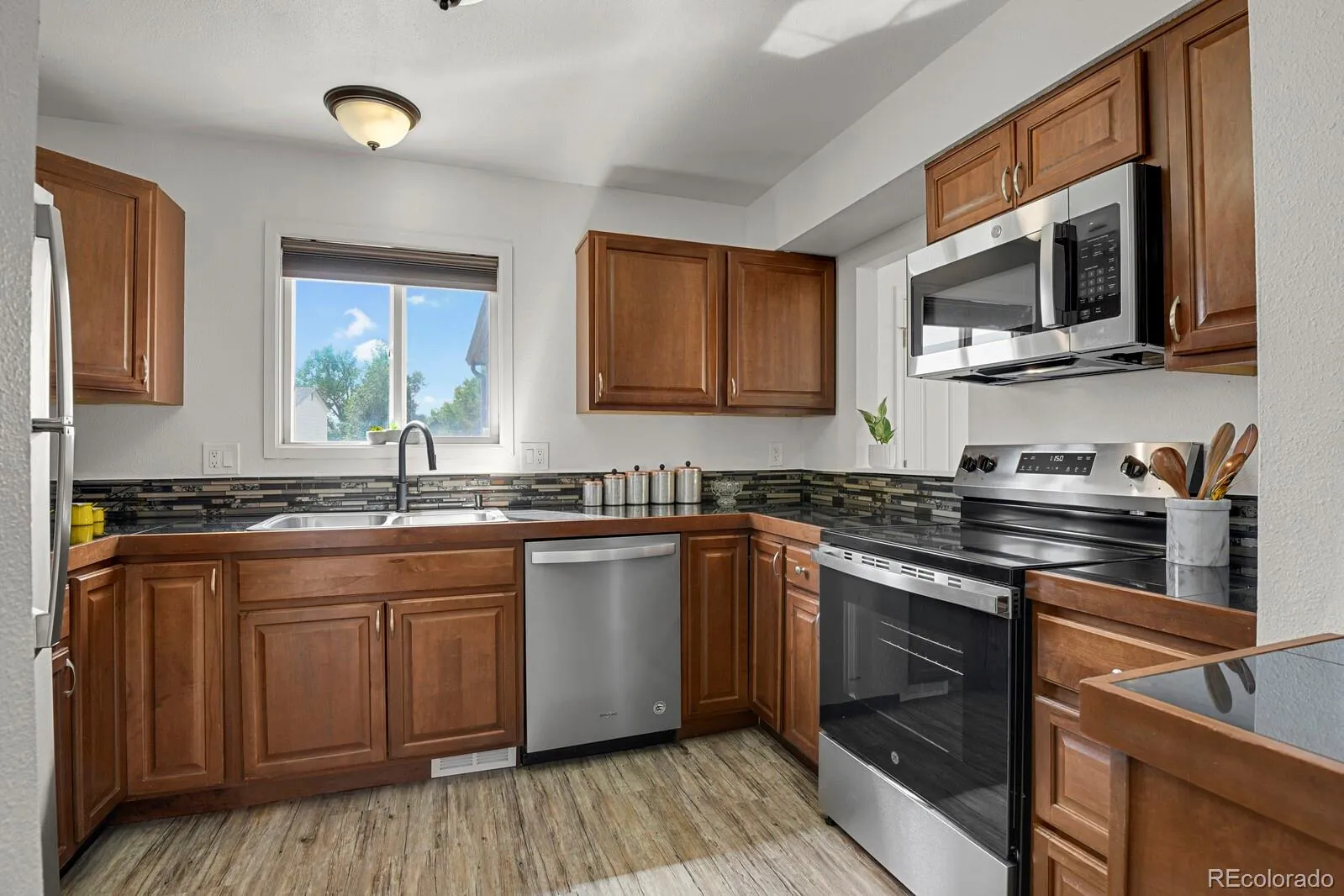 Welcome to the former model home of the Crosstrail neighborhood in Stratmoor in Southwest Colorado Springs! Built in 1984 as the first home in the neighborhood this home proudly sits on an oversized corner lot of more than a quarter acre with unbeatable mountain views from both the front and backyard. The finished 2-car-garage (once the sales office) adds incredible flexibility with extra windows, skylights, heating, extra outlets, plus room on the upgraded electrical panel for an EV charger. Inside, enjoy peace of mind with major systems updated: new roof (2024), furnace and A/C, (2017), and water heater (2019) as well as brand new appliances in the kitchen! Fresh carpet in the basement bedroom and professionally cleaned carpet in the rest of the home as well as window covers throughout make this home move-in ready. The fenced in side yard with patio is a great place to BBQ or a convenient dog run, space to garden, play, or simply relax. Put up a fence around the huge backyard and you get even more of all this space for entertaining and more! The prime location is ideal to military bases, shopping, trails, the Broadmoor, I25, and all daily needs while the home sits on a quiet cul-de-sac – ready for its next chapter with you!