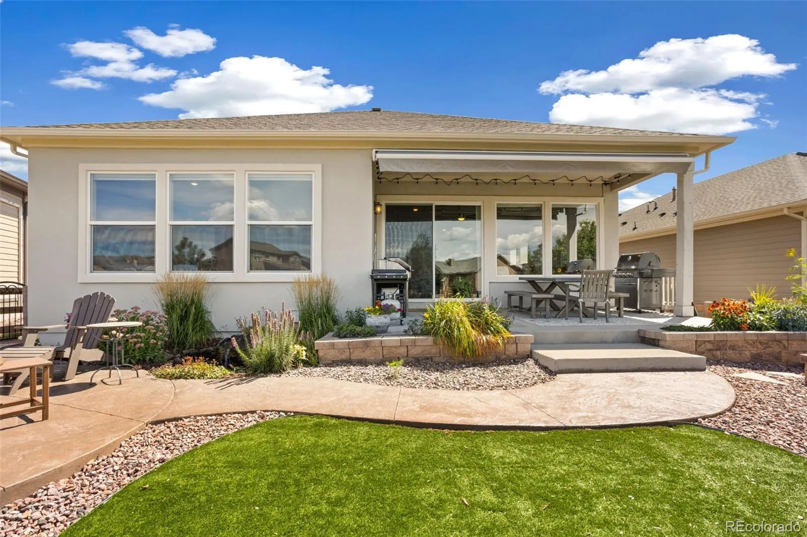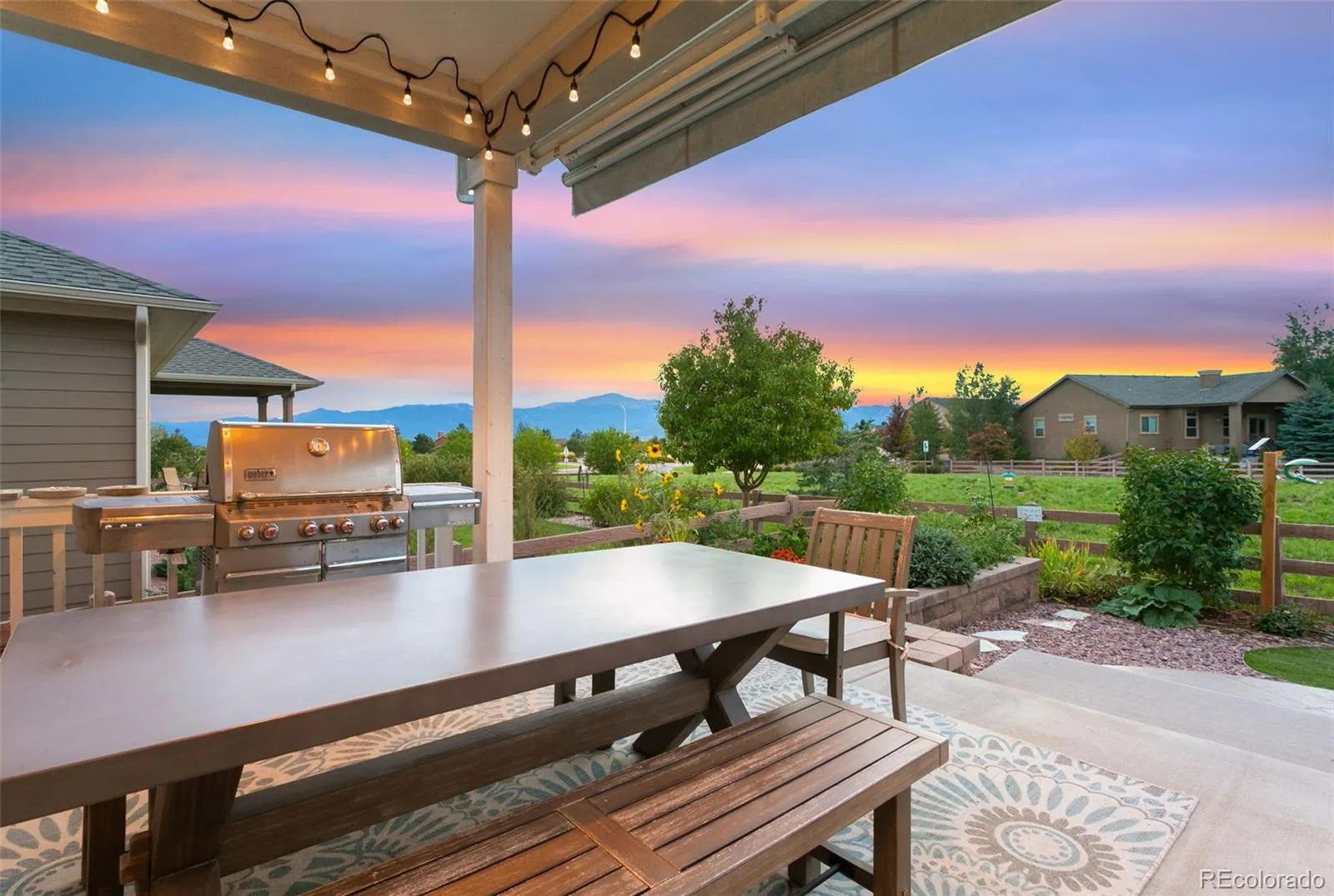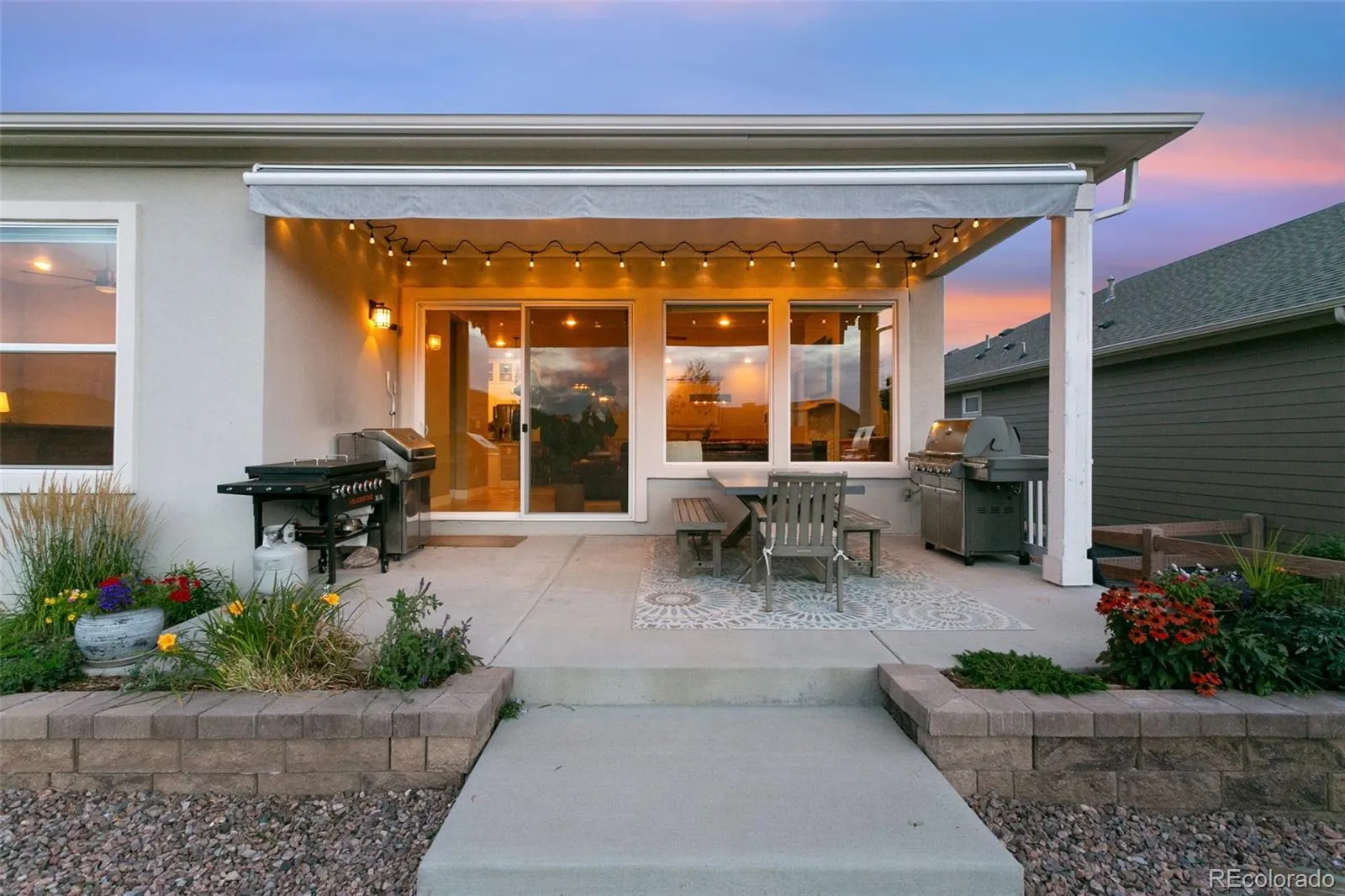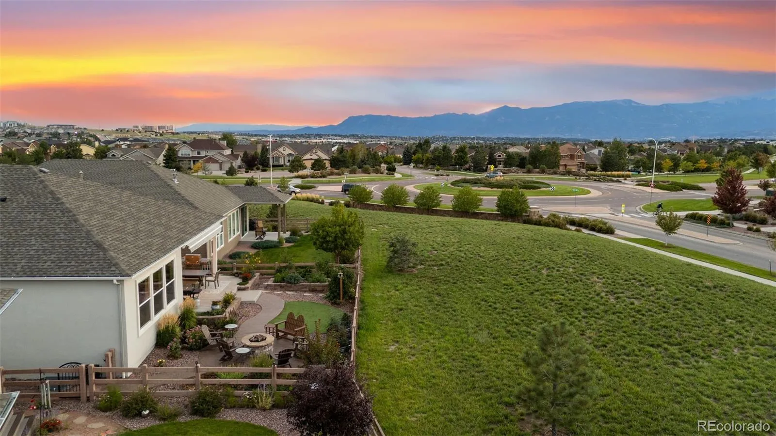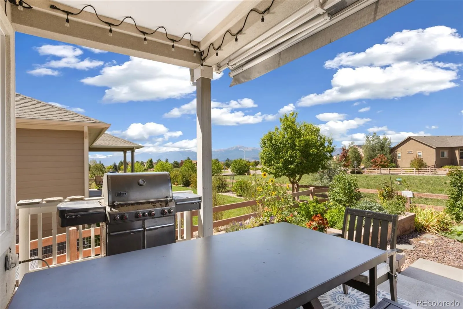 Set on a quiet street in the heart of the Wolf Ranch community, this home blends modern convenience with stunning Colorado scenery. From the back covered patio, enjoy sweeping views of Pikes Peak and the Front Range, framed by a fully landscaped, low-maintenance yard with native plants, a tranquil water feature, and a built-in gas fire pit. With a stucco exterior, paid-off solar panel system, and an east-facing driveway, the property is as practical as it is beautiful. Outdoor living is elevated with a retractable awning and gas grill hookup, while the lot backs to open space for privacy. A tandem three-car garage adds generous storage for vehicles, hobbies, or gear.