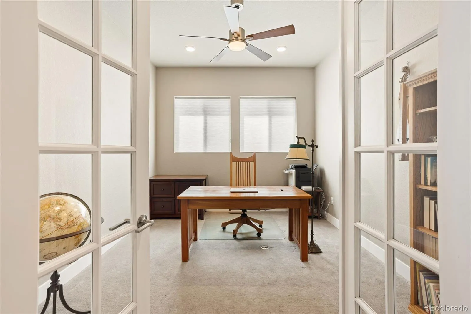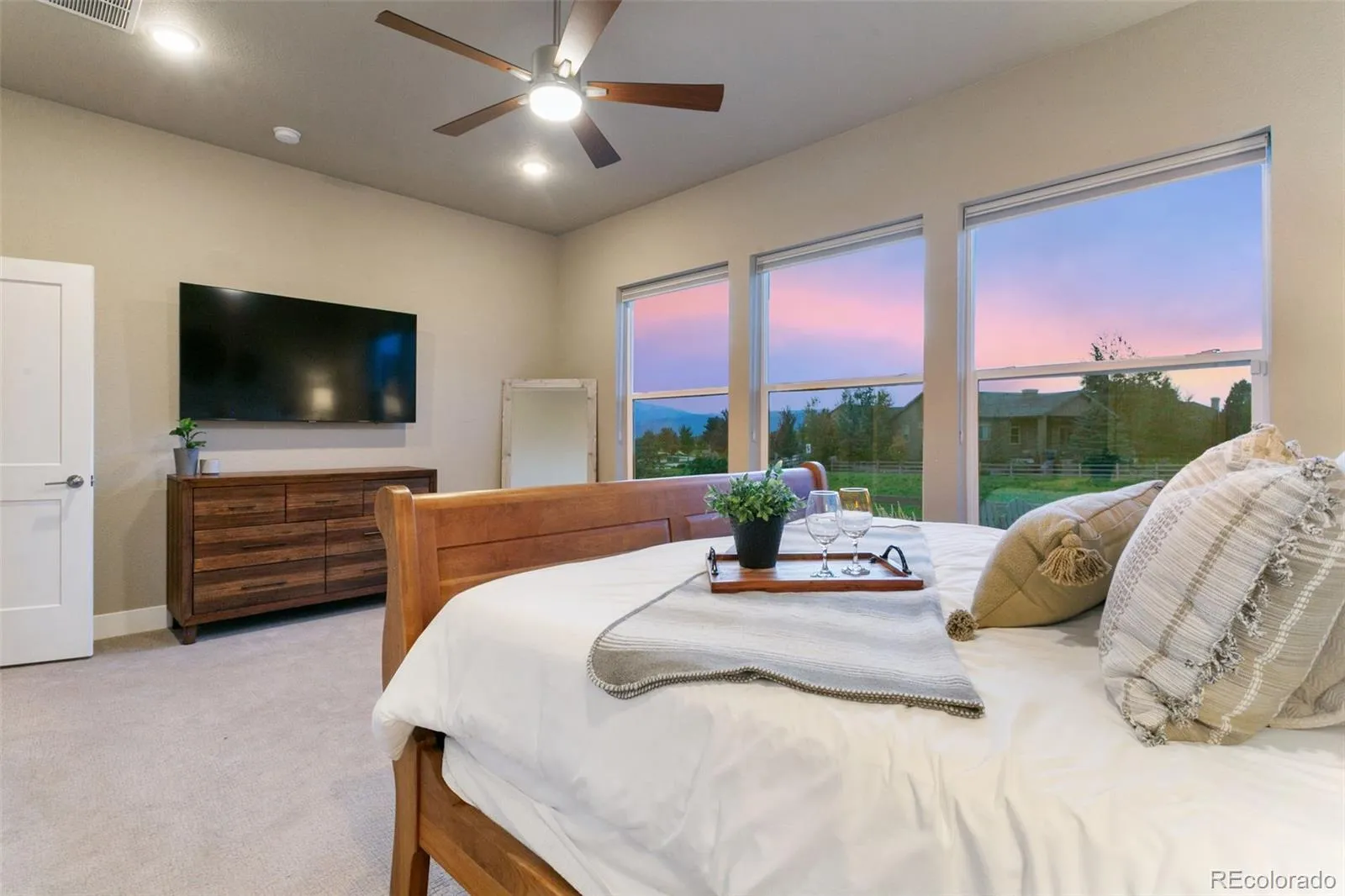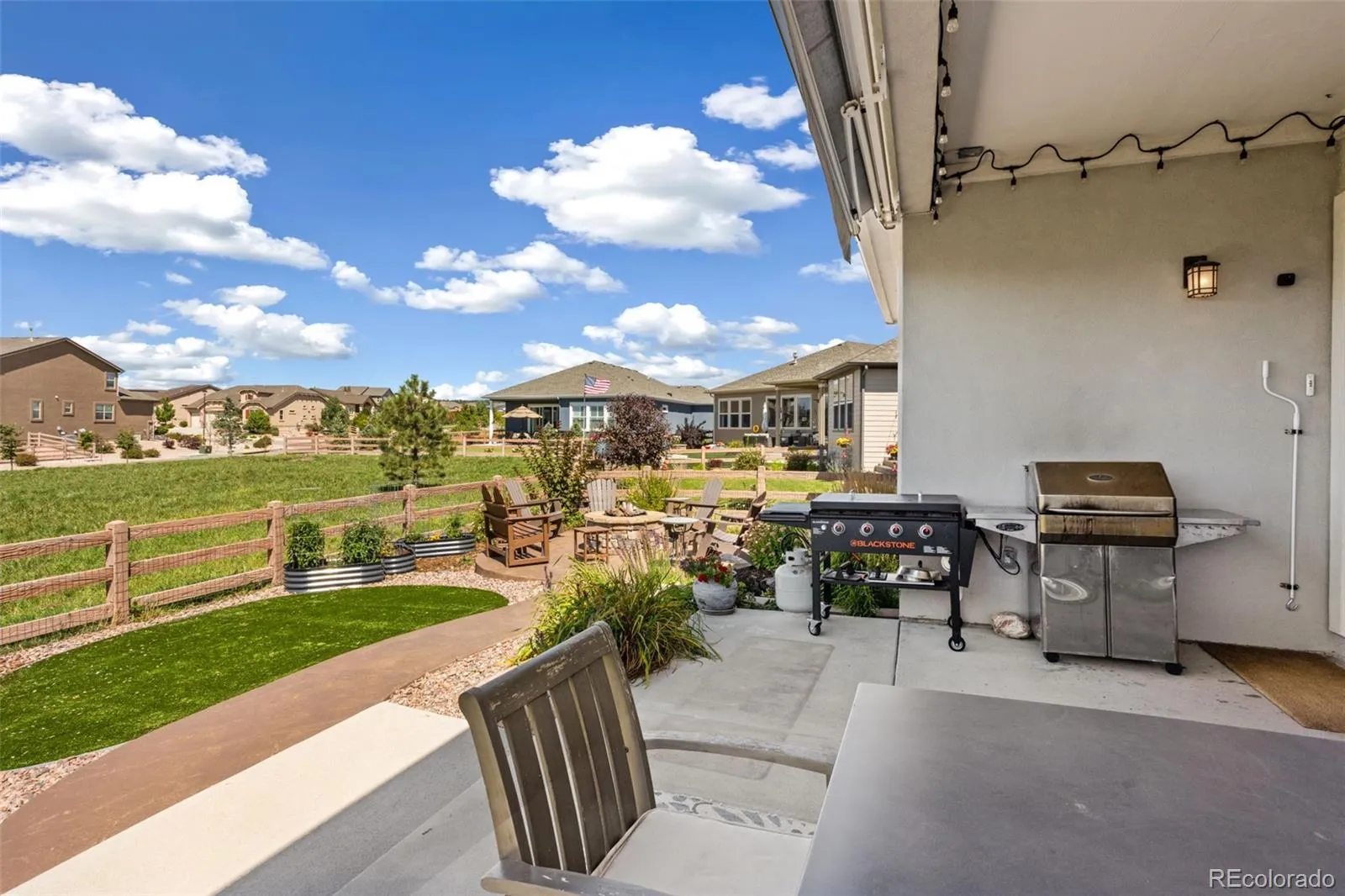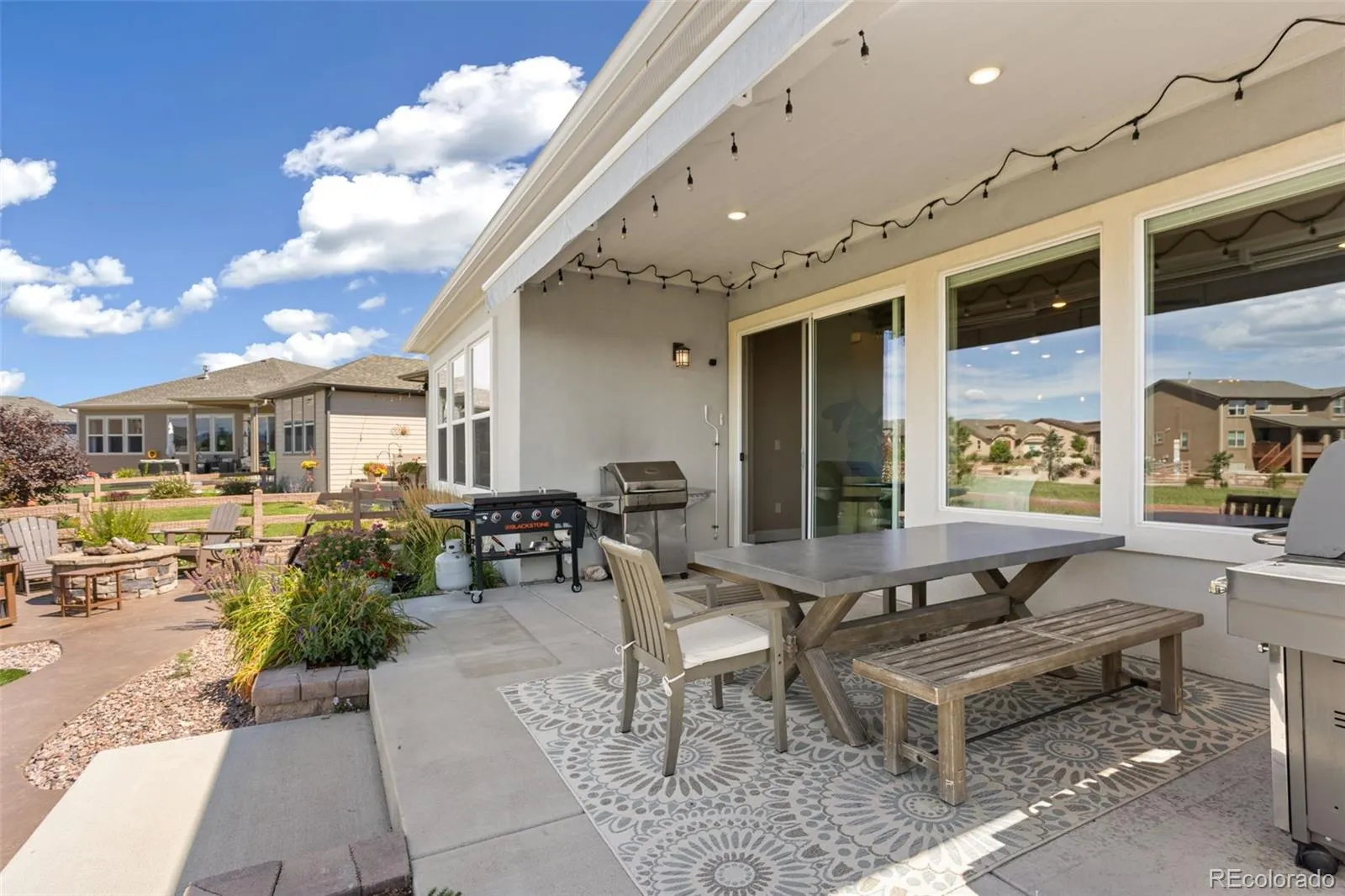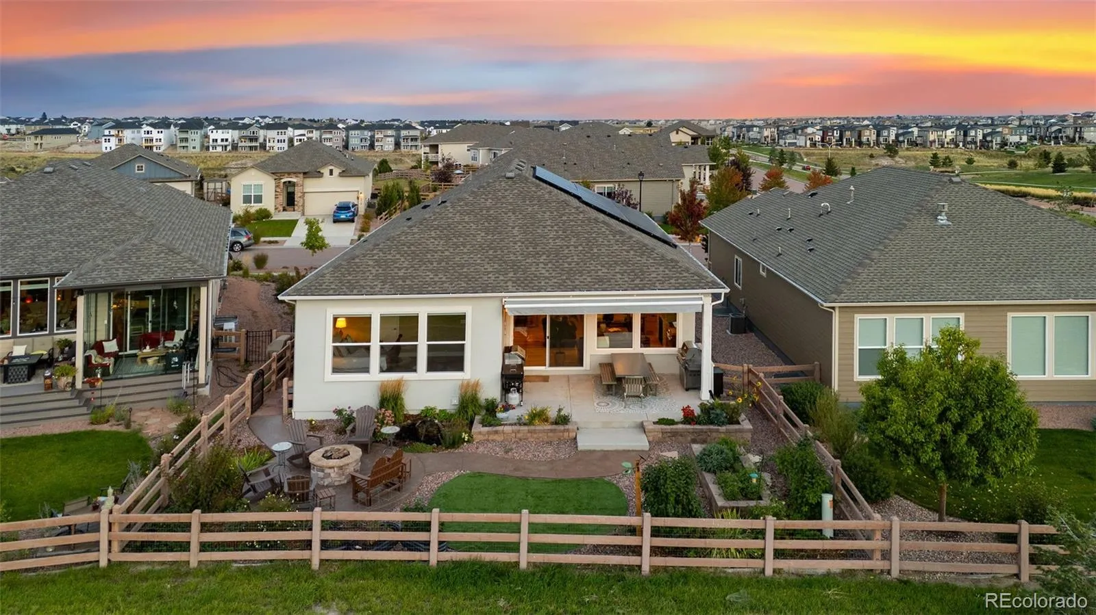 Set on a quiet street in the heart of the Wolf Ranch community, this home blends modern convenience with stunning Colorado scenery. From the back covered patio, enjoy sweeping views of Pikes Peak and the Front Range, framed by a fully landscaped, low-maintenance yard with native plants, a tranquil water feature, and a built-in gas fire pit. With a stucco exterior, paid-off solar panel system, and an east-facing driveway, the property is as practical as it is beautiful. Outdoor living is elevated with a retractable awning and gas grill hookup, while the lot backs to open space for privacy. A tandem three-car garage adds generous storage for vehicles, hobbies, or gear.