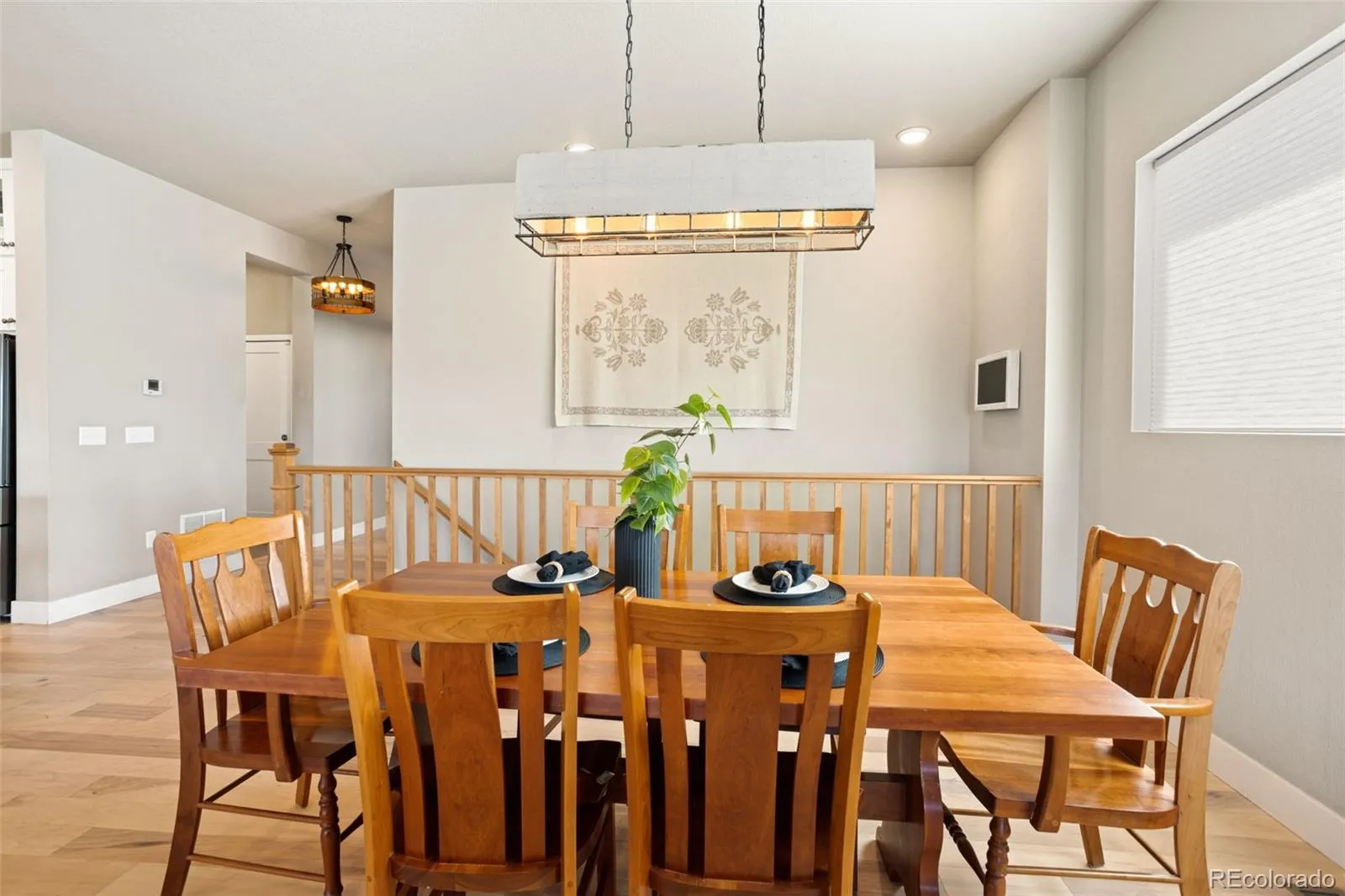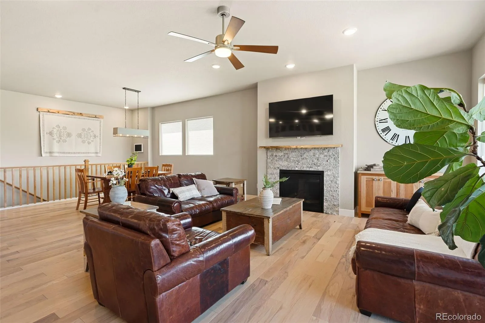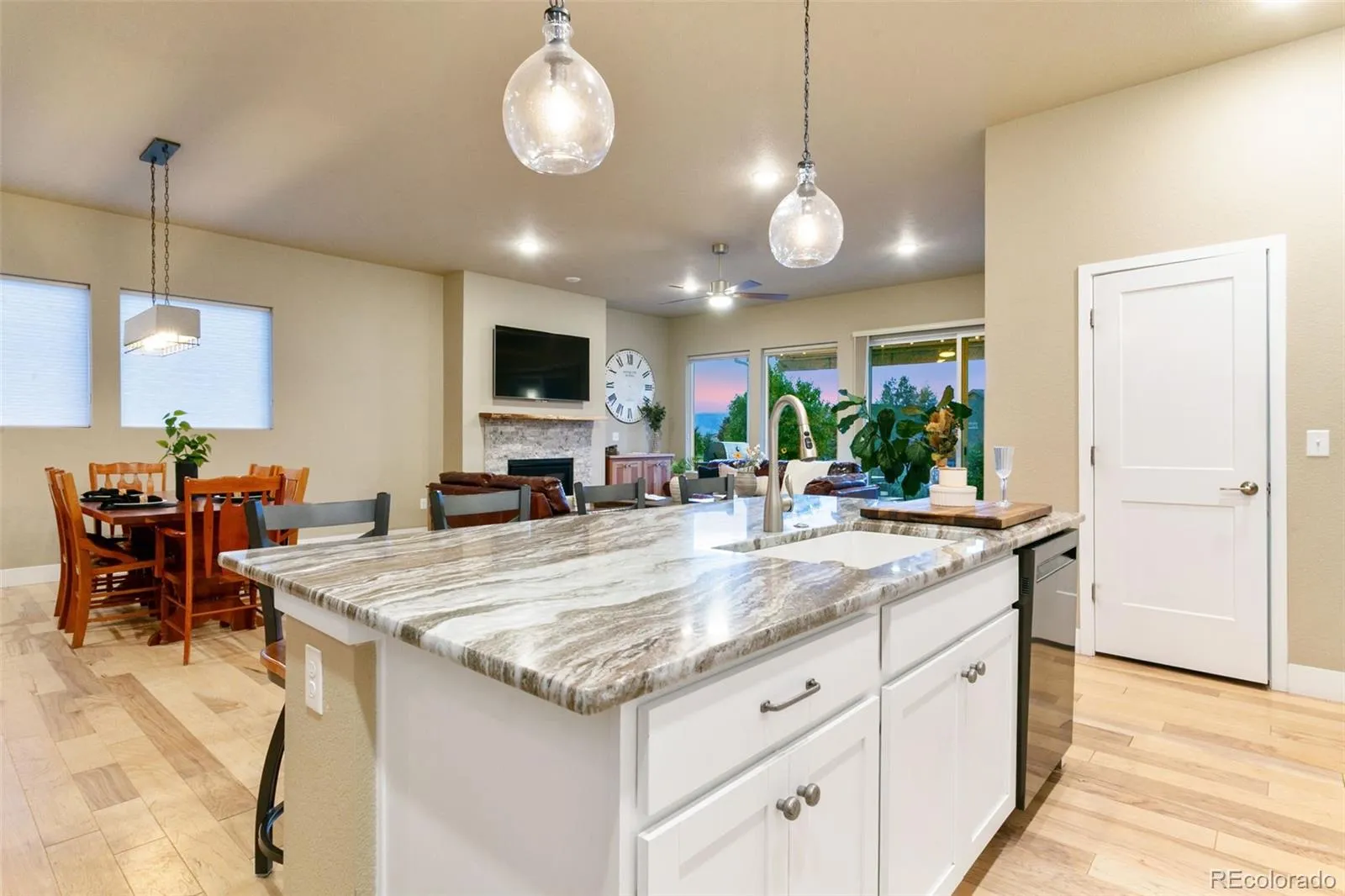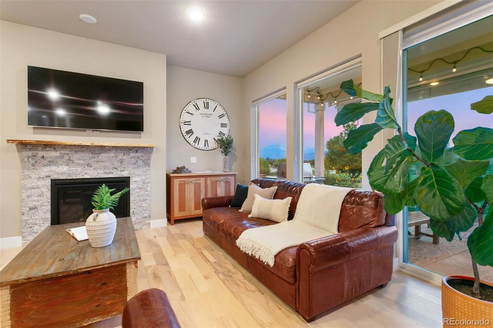 Inside, main-level living is enhanced by natural light, hickory floors, and updated finishes throughout. The kitchen is both stylish and functional, featuring expanded cabinets, new lighting, and elegant dolomite counters. An open layout creates a warm and inviting atmosphere, while central vac adds convenience. From the great room and the master suite, soak in mountain views that make every day feel distinctly Colorado. The primary retreat includes a massive walk-in closet and a luxurious space with an oversized shower. A cozy gas fireplace anchors the main living space, adding charm and comfort.