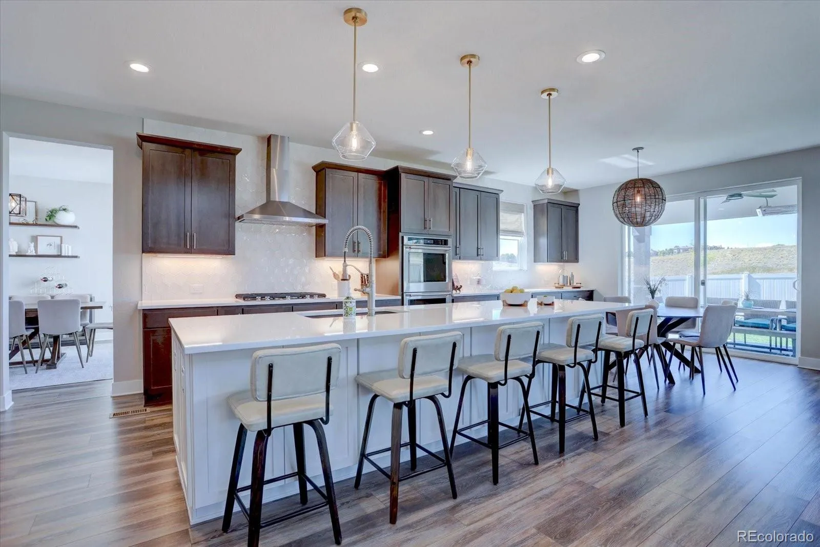 a 36” cooktop, double oven, sleek quartz countertops & gorgeous custom tile backsplash that extends to the