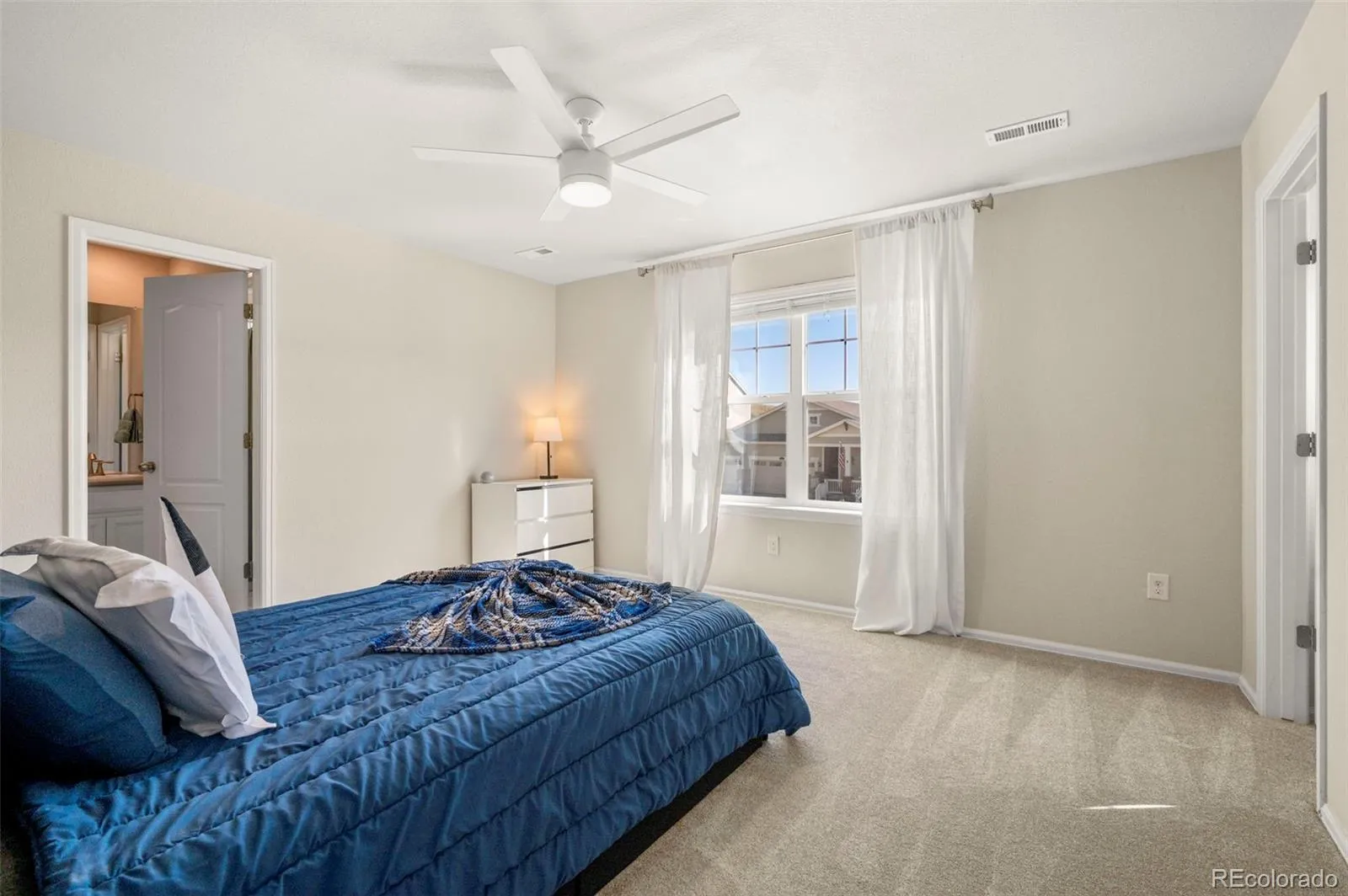 Upstairs, the primary suite features a tray ceiling, spa-like bath with dual vanities, soaking tub, tiled shower with bench, and dual walk-in closets. Two additional bedrooms share a Jack & Jill bath, while the versatile loft captures mountain views and provides the perfect spot for a playroom, office, or second living space.