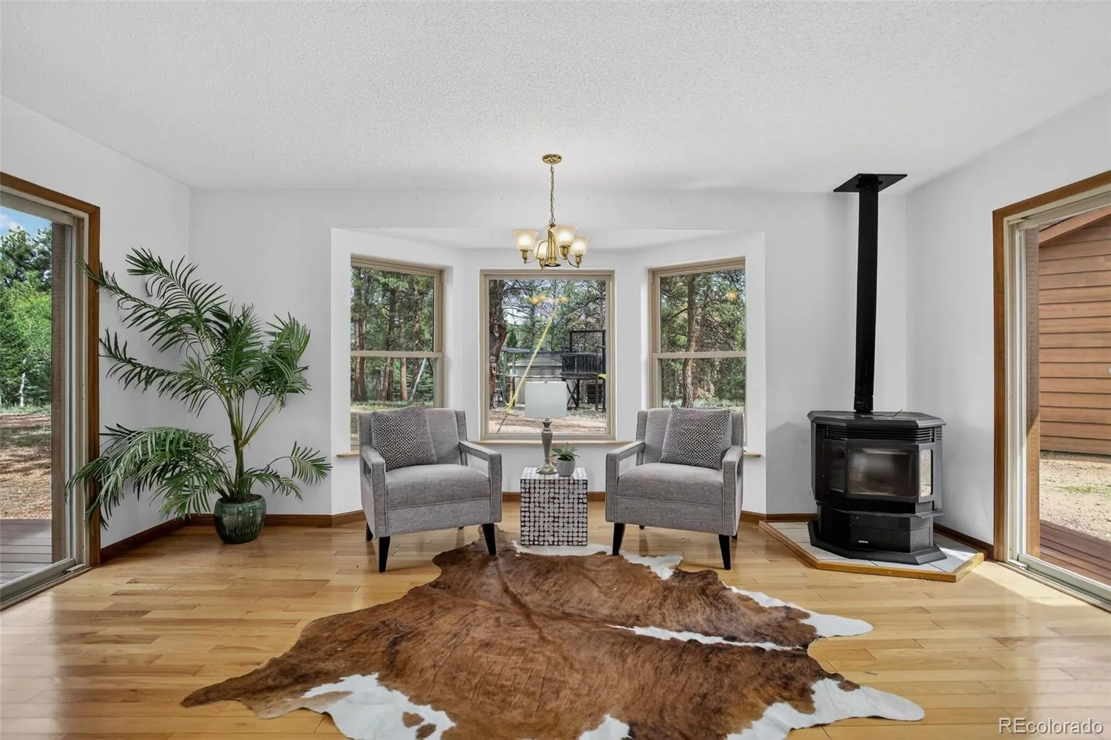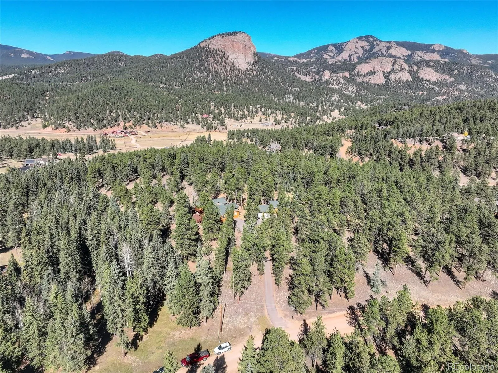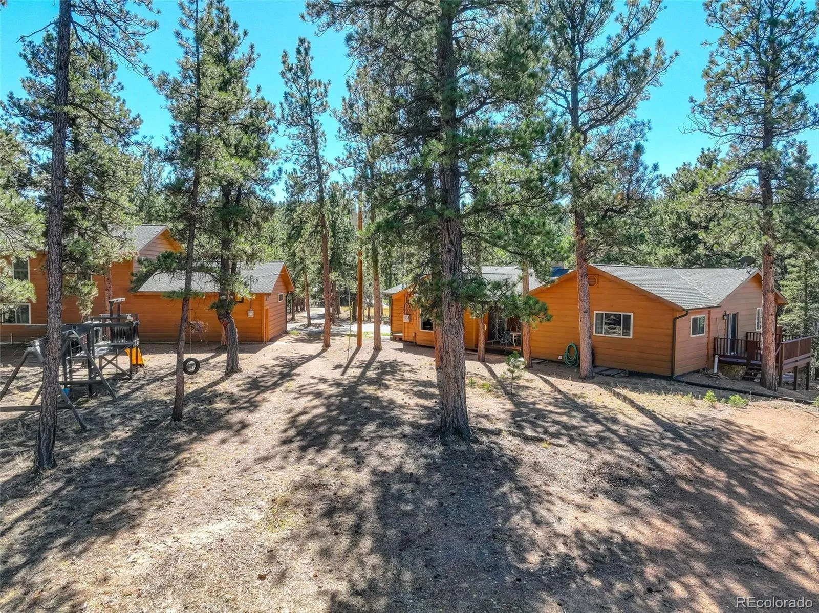 Gorgeous Mountain Retreat in Coveted Woodside Park! Ride straight off your property onto miles of neighborhood trails in this sought-after equestrian community. Set on 4.13 acres of flat, usable land, this serene retreat offers privacy, woods, wildlife, and mountain views. A circular driveway leads to a meticulously maintained home designed for seamless indoor–outdoor living.The main level features an open, light-filled layout with hardwood flooring throughout, where the kitchen, dining, and living areas flow effortlessly to a spacious deck—perfect for entertaining. The updated kitchen boasts all-wood cabinetry, granite countertops, stainless steel appliances, a center island, and a convenient built-in indoor grill. Bay windows extend the dining area with backyard views and access to a second deck. The primary suite captures views of Lions Head and offers a walk-in closet plus multiple additional closets and a generous en-suite bath. A second en-suite bedroom on the main level provides flexible living, complemented by two more bedrooms and a full hall bath. The lower walk – out level is bright and versatile, featuring a large recreation room with cozy wood-burning stove, a den/office, secondary family room, bonus room, additional bath, secondary laundry, and a substantial storage area with egress windows. Throughout the home, multiple wood-burning fireplaces and pellet stoves provide inviting warmth and mountain charm. From here, step out to an expansive lower-level deck with built-in seating, ideal for gatherings and year-round enjoyment. Outdoors, enjoy the open backyard, playground, and space for pets. A detached oversized 3-car garage offers an extended bay, separate workshop, and a large office space above, with ample vehicle space plus RV parking—room for all your Colorado toys. Just minutes to Staunton State Park, with Denver and world-class ski resorts within easy reach, this property blends equestrian lifestyle, mountain living, and everyday convenience.