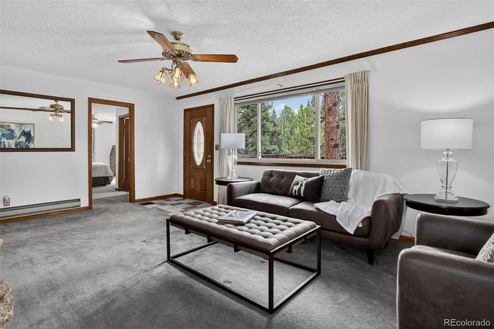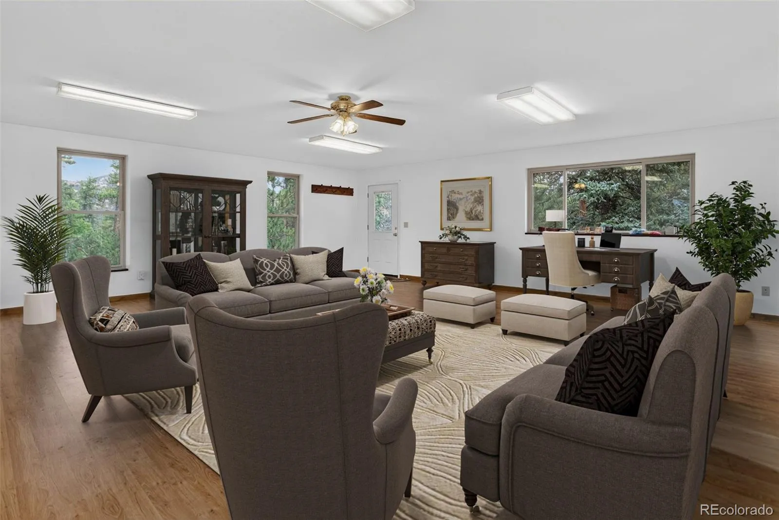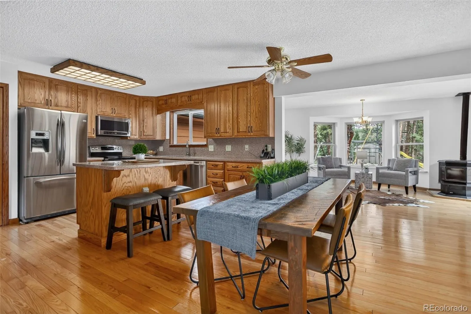 Gorgeous Mountain Retreat in Coveted Woodside Park! Ride straight off your property onto miles of neighborhood trails in this sought-after equestrian community. Set on 4.13 acres of flat, usable land, this serene retreat offers privacy, woods, wildlife, and mountain views. A circular driveway leads to a meticulously maintained home designed for seamless indoor–outdoor living.The main level features an open, light-filled layout with hardwood flooring throughout, where the kitchen, dining, and living areas flow effortlessly to a spacious deck—perfect for entertaining. The updated kitchen boasts all-wood cabinetry, granite countertops, stainless steel appliances, a center island, and a convenient built-in indoor grill. Bay windows extend the dining area with backyard views and access to a second deck. The primary suite captures views of Lions Head and offers a walk-in closet plus multiple additional closets and a generous en-suite bath. A second en-suite bedroom on the main level provides flexible living, complemented by two more bedrooms and a full hall bath. The lower walk – out level is bright and versatile, featuring a large recreation room with cozy wood-burning stove, a den/office, secondary family room, bonus room, additional bath, secondary laundry, and a substantial storage area with egress windows. Throughout the home, multiple wood-burning fireplaces and pellet stoves provide inviting warmth and mountain charm. From here, step out to an expansive lower-level deck with built-in seating, ideal for gatherings and year-round enjoyment. Outdoors, enjoy the open backyard, playground, and space for pets. A detached oversized 3-car garage offers an extended bay, separate workshop, and a large office space above, with ample vehicle space plus RV parking—room for all your Colorado toys. Just minutes to Staunton State Park, with Denver and world-class ski resorts within easy reach, this property blends equestrian lifestyle, mountain living, and everyday convenience.