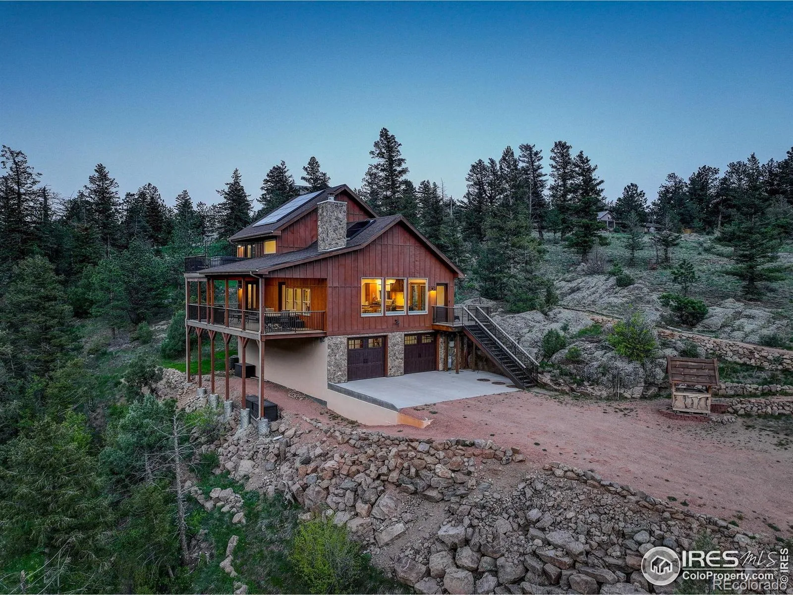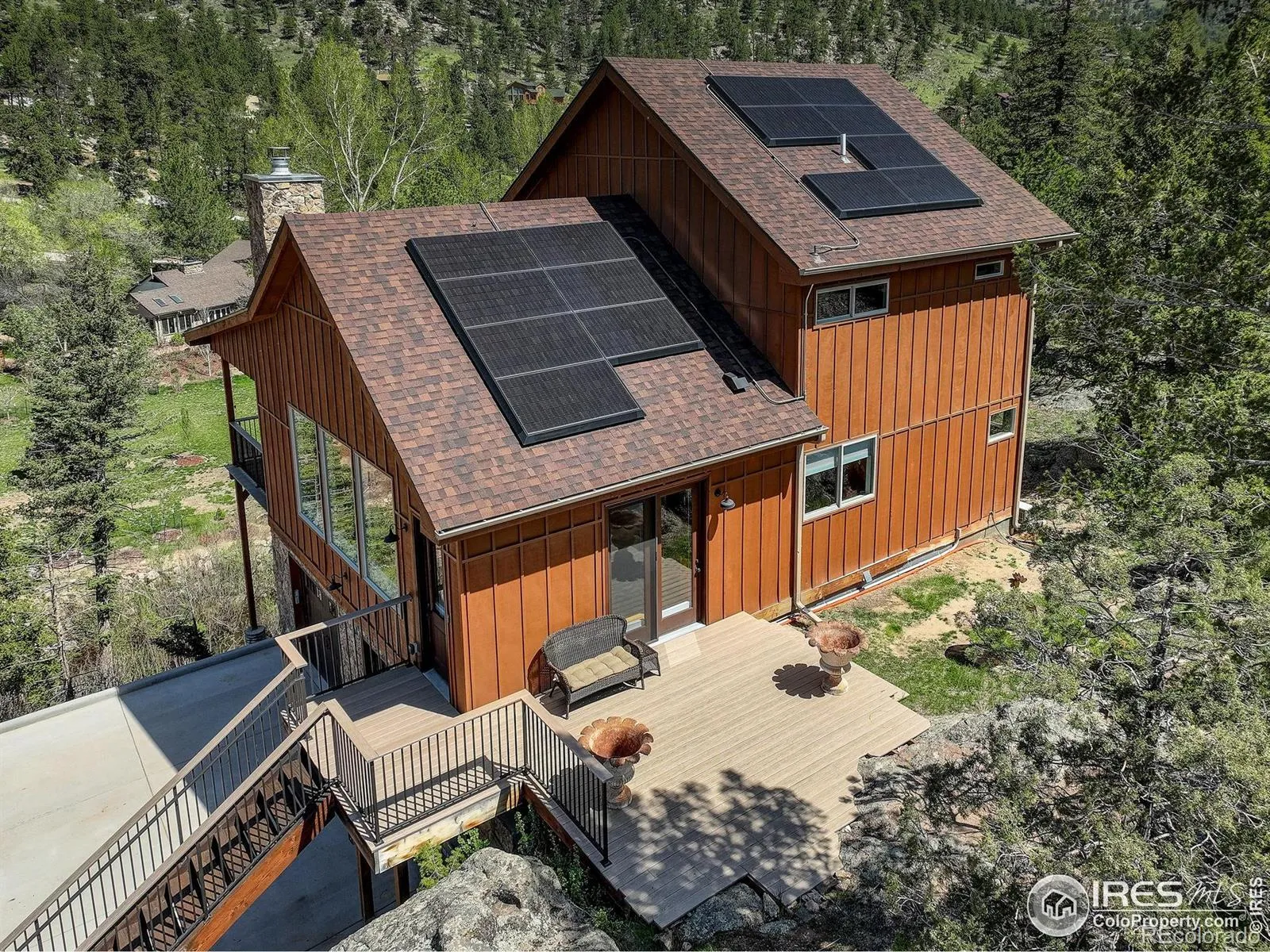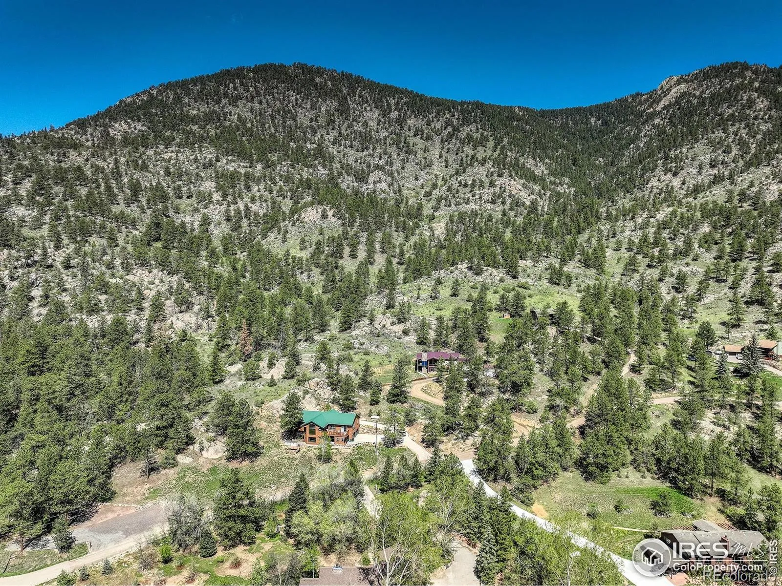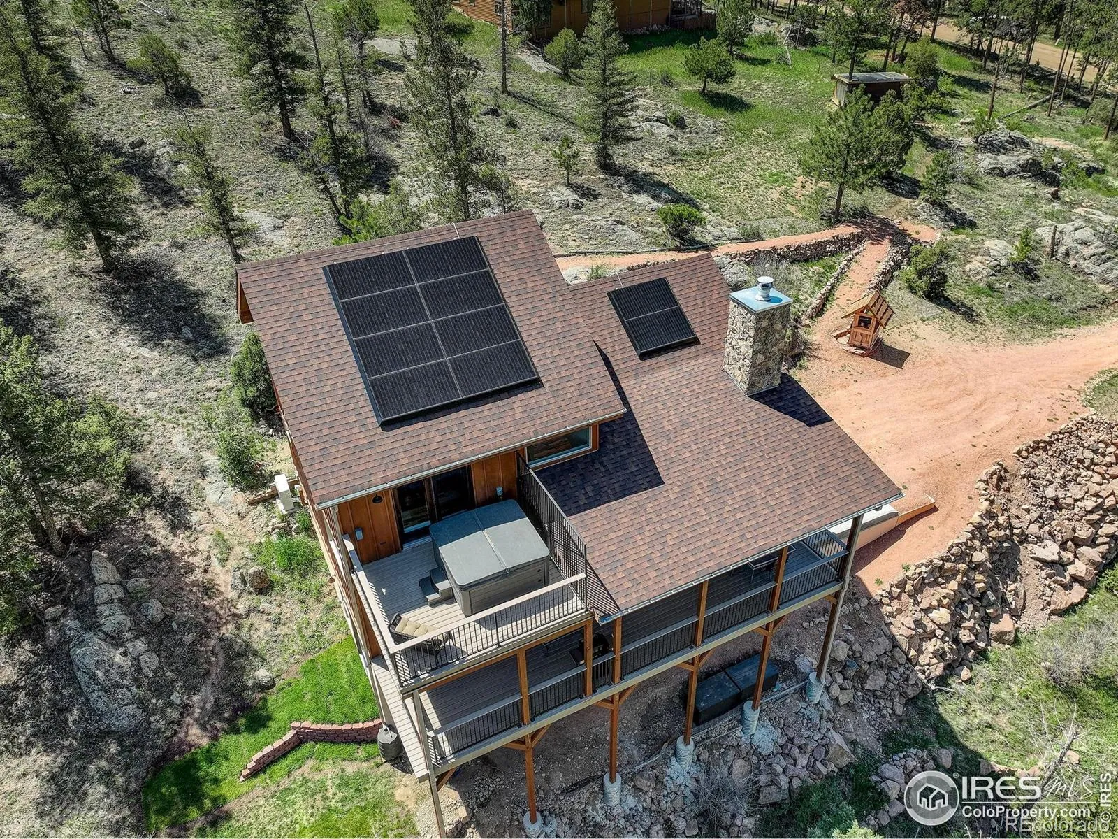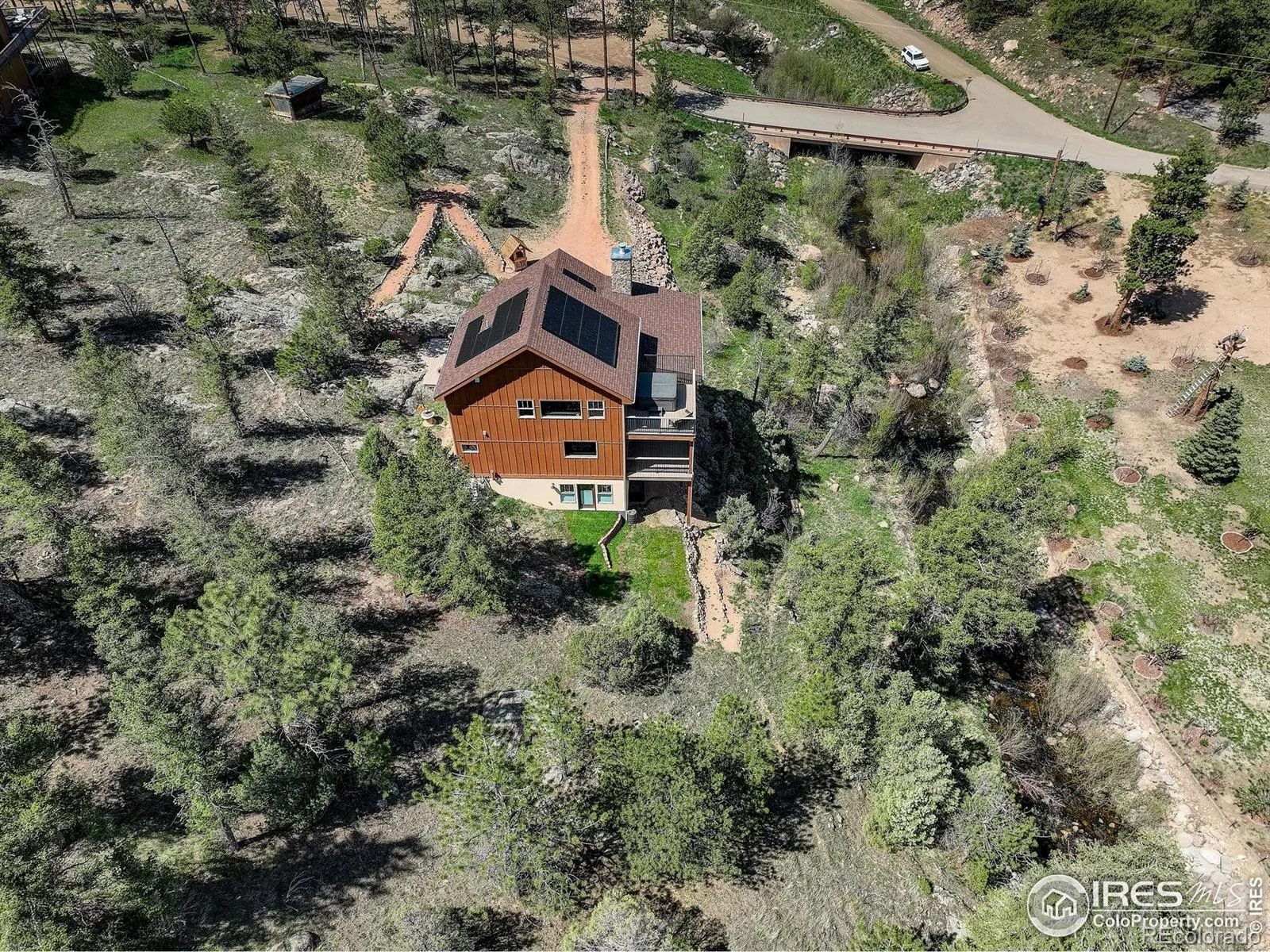 One-of-a-kind near net-zero waterfront estate! Step outside your newly constructed custom home and cast a line into the Little Thompson River. This stunning residence in Pinewood Springs is a rare sanctuary that blends sustainable living, sophisticated design, and extraordinary privacy. Set on 1.5 acres with direct access to Roosevelt National Forest, the property also features meandering park-like trails for peaceful walks and wildlife encounters, all framed by sweeping mountain views from every window. Inside, hickory floors flow throughout the home, leading to a gourmet kitchen outfitted with alder cabinetry, dual ovens, a copper sink and hood, and abundant storage. The open-concept design connects seamlessly to the great room, where electronic blinds provide comfort and climate control, and a floor-to-ceiling moss rock fireplace creates a warm focal point. Designed as a near net-zero, fossil-fuel-free retreat, this home features a 24-panel PV solar system, passive solar orientation, a hydronic radiant heat system, and fire-resistant exterior contributing to energy efficiency, comfort, and long-term peace of mind. Indoor-outdoor living shines on the expansive, no-maintenance covered deck, ideal for al fresco dining and relaxation with the soothing soundtrack of the river. The upper-level primary suite offers breathtaking views, a private patio with a hot tub, and a spa-worthy bath with copper sinks, a large shower, and a generous walk-in closet. A secondary main-level bedroom features deck access and an ensuite bath, while the lower-level bedroom enjoys walk-out access to the river. Additional features include an oversized garage, a south-facing driveway, and a 120 sq ft greenhouse perfect for year-round gardening. Ideally located between Estes Park and Lyons-just 35 minutes to Boulder or Longmont-this eco-conscious luxury home offers unparalleled serenity, craftsmanship, and sustainability for the discerning buyer.
