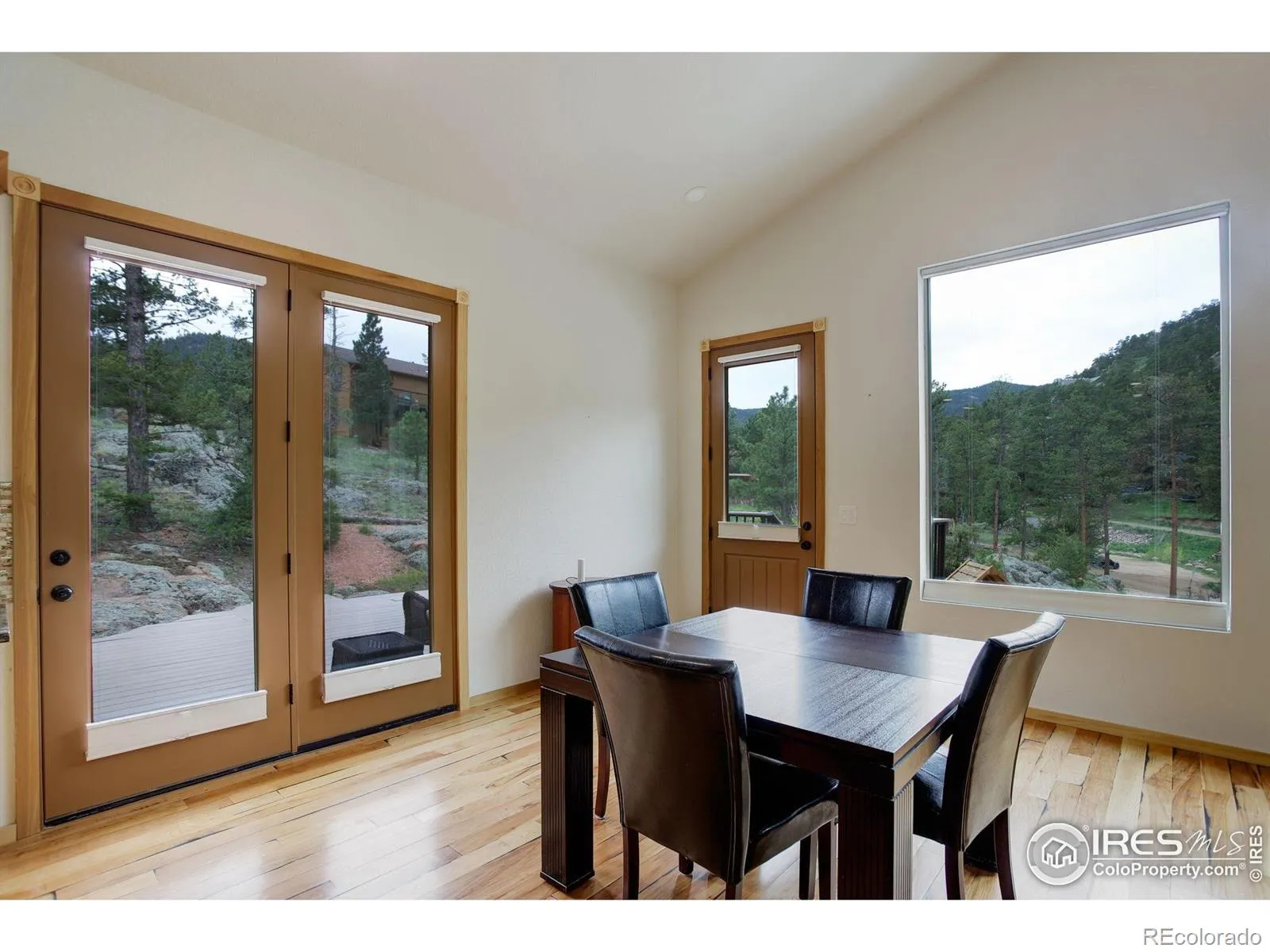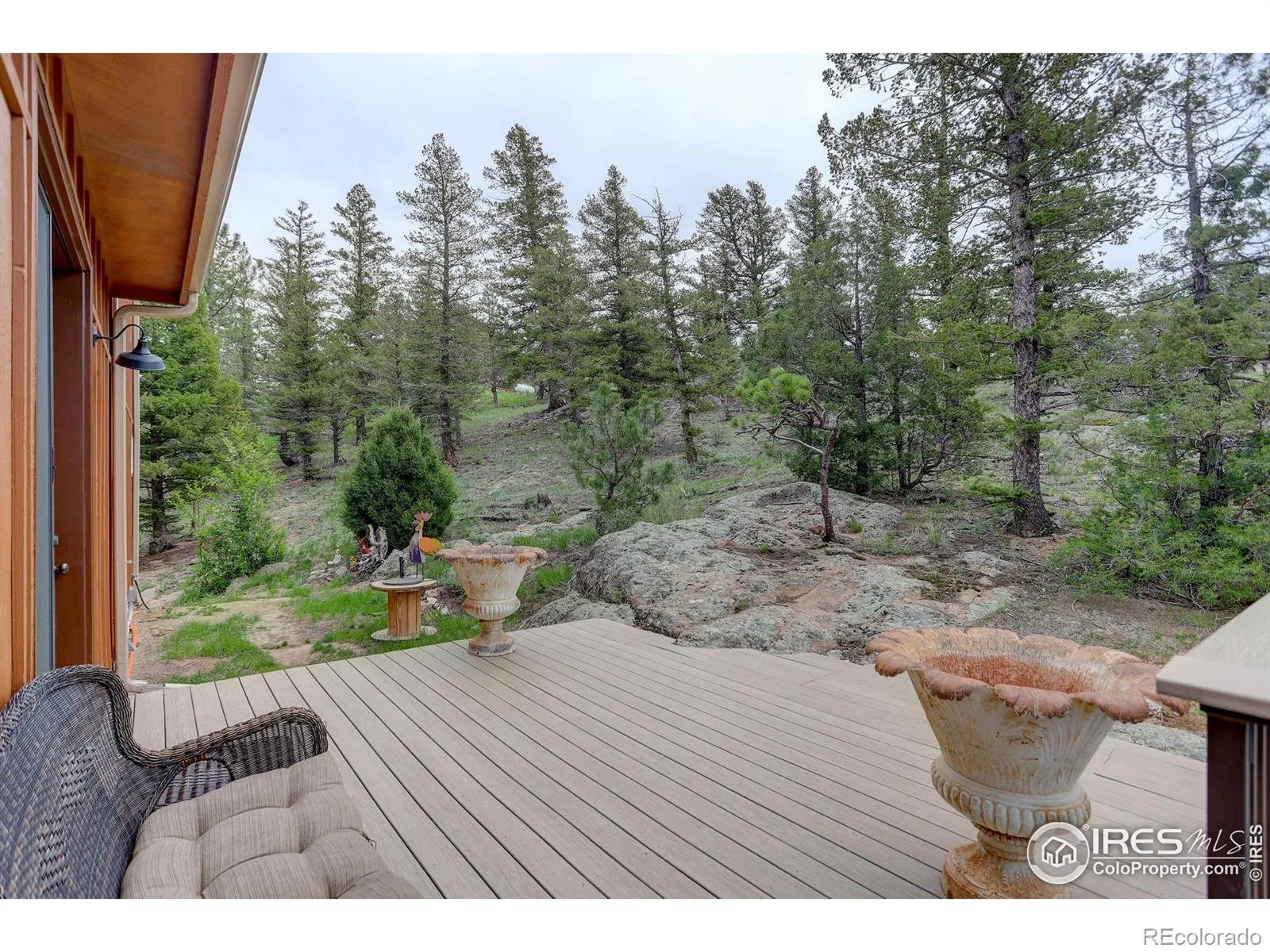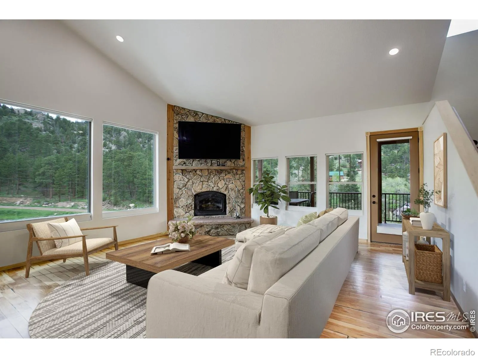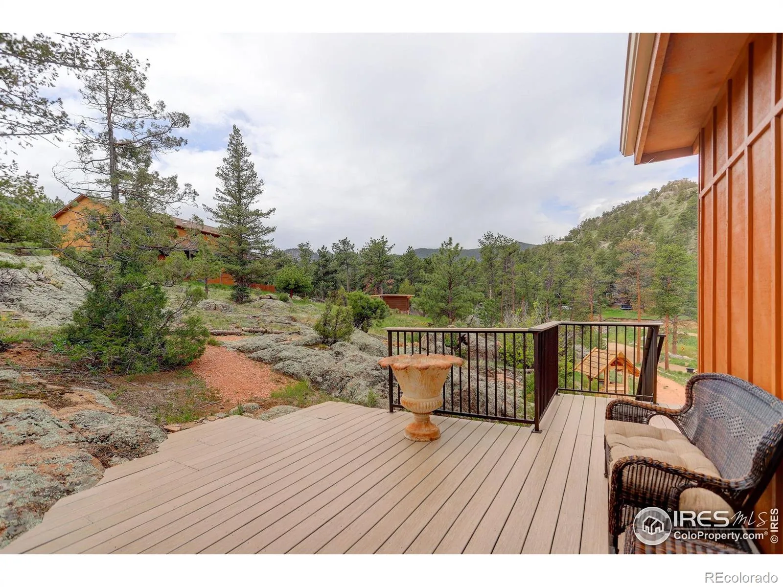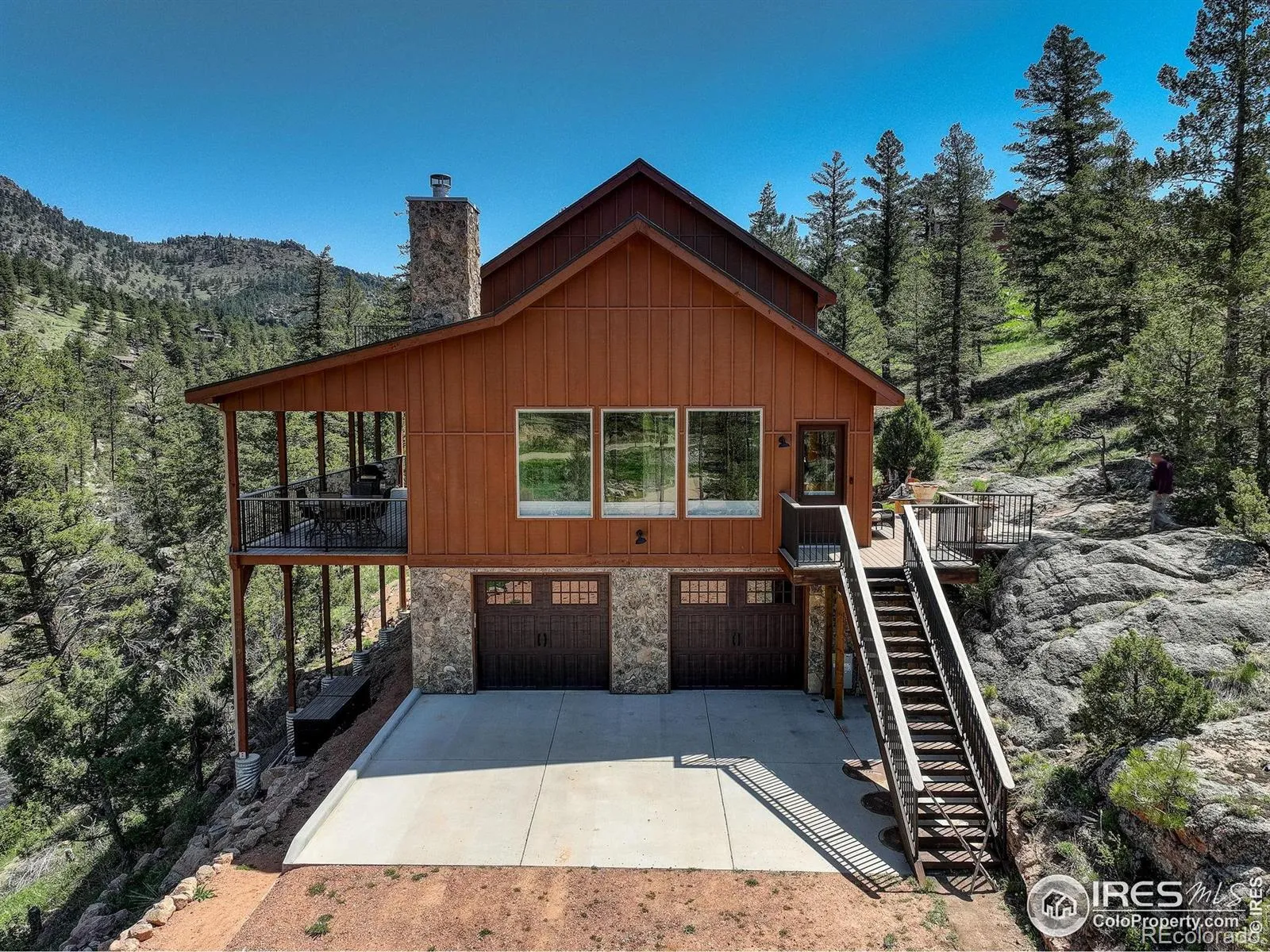 One-of-a-kind near net-zero waterfront estate! Step outside your newly constructed custom home and cast a line into the Little Thompson River. This stunning residence in Pinewood Springs is a rare sanctuary that blends sustainable living, sophisticated design, and extraordinary privacy. Set on 1.5 acres with direct access to Roosevelt National Forest, the property also features meandering park-like trails for peaceful walks and wildlife encounters, all framed by sweeping mountain views from every window. Inside, hickory floors flow throughout the home, leading to a gourmet kitchen outfitted with alder cabinetry, dual ovens, a copper sink and hood, and abundant storage. The open-concept design connects seamlessly to the great room, where electronic blinds provide comfort and climate control, and a floor-to-ceiling moss rock fireplace creates a warm focal point. Designed as a near net-zero, fossil-fuel-free retreat, this home features a 24-panel PV solar system, passive solar orientation, a hydronic radiant heat system, and fire-resistant exterior contributing to energy efficiency, comfort, and long-term peace of mind. Indoor-outdoor living shines on the expansive, no-maintenance covered deck, ideal for al fresco dining and relaxation with the soothing soundtrack of the river. The upper-level primary suite offers breathtaking views, a private patio with a hot tub, and a spa-worthy bath with copper sinks, a large shower, and a generous walk-in closet. A secondary main-level bedroom features deck access and an ensuite bath, while the lower-level bedroom enjoys walk-out access to the river. Additional features include an oversized garage, a south-facing driveway, and a 120 sq ft greenhouse perfect for year-round gardening. Ideally located between Estes Park and Lyons-just 35 minutes to Boulder or Longmont-this eco-conscious luxury home offers unparalleled serenity, craftsmanship, and sustainability for the discerning buyer.