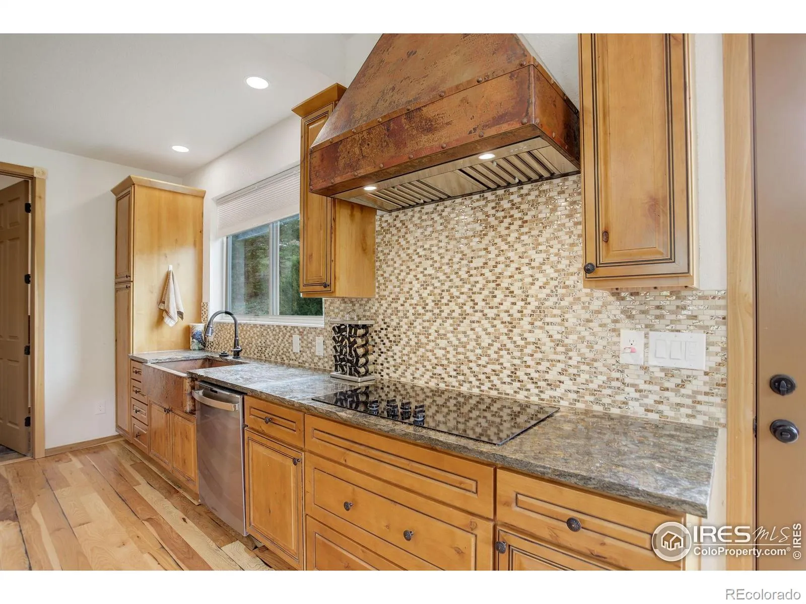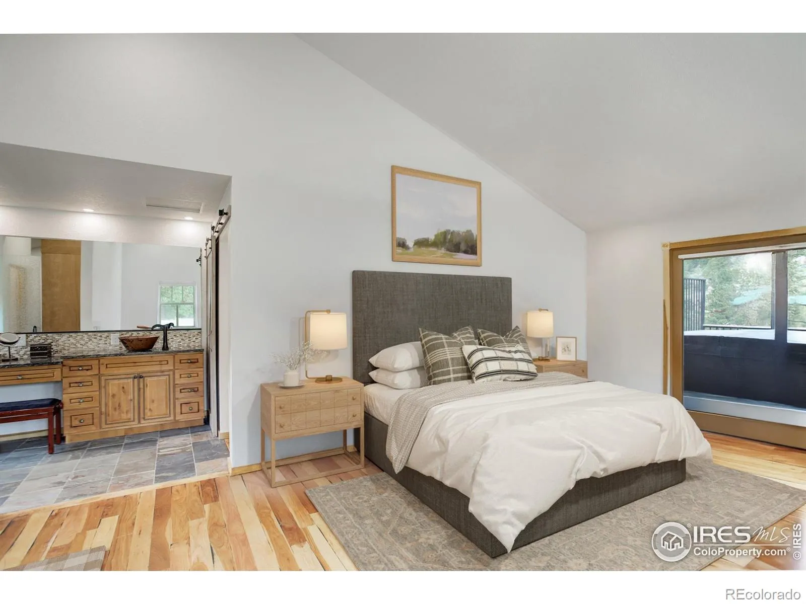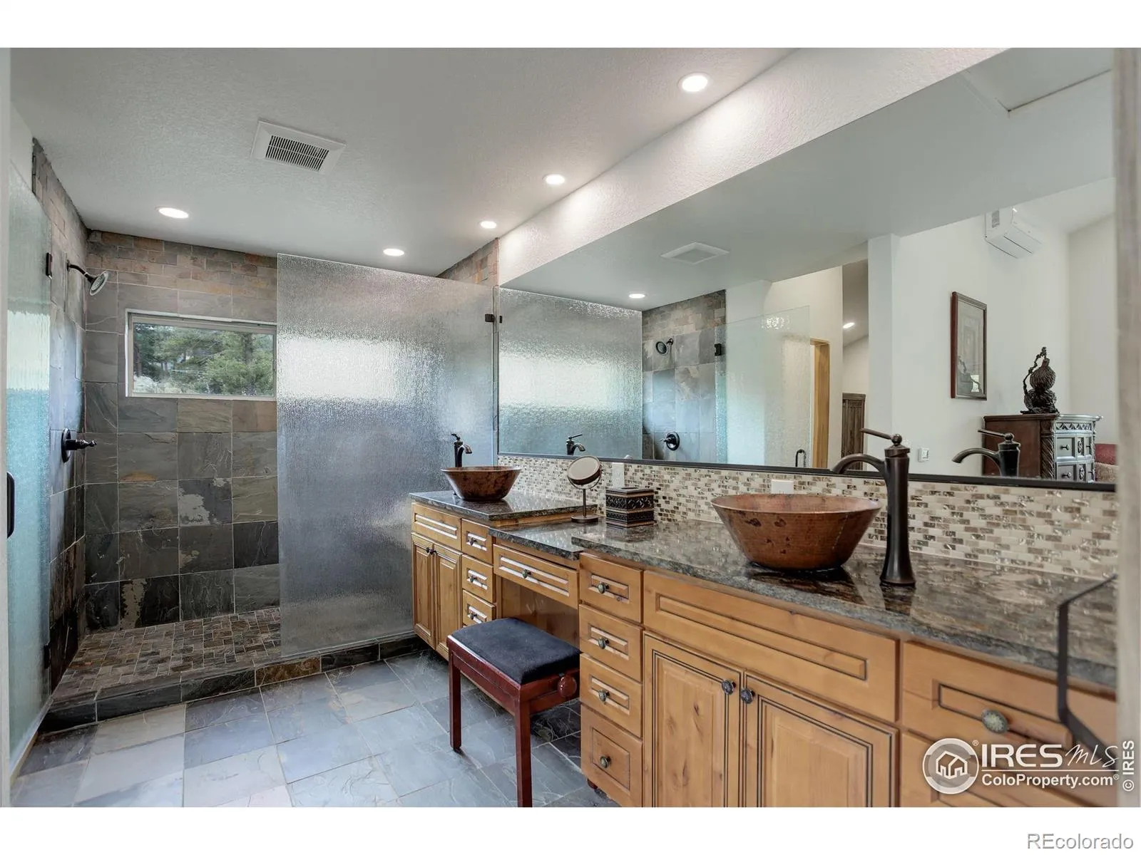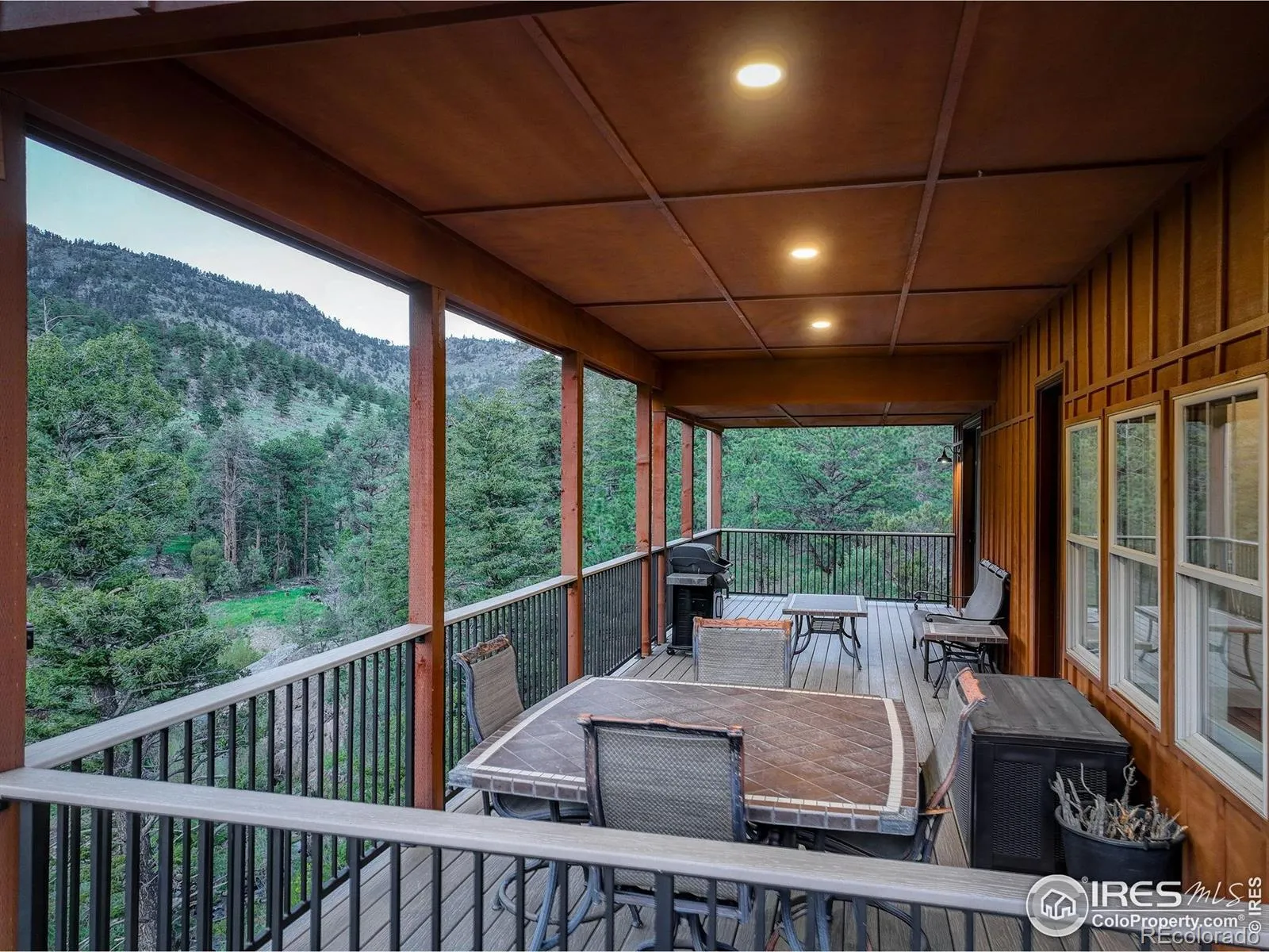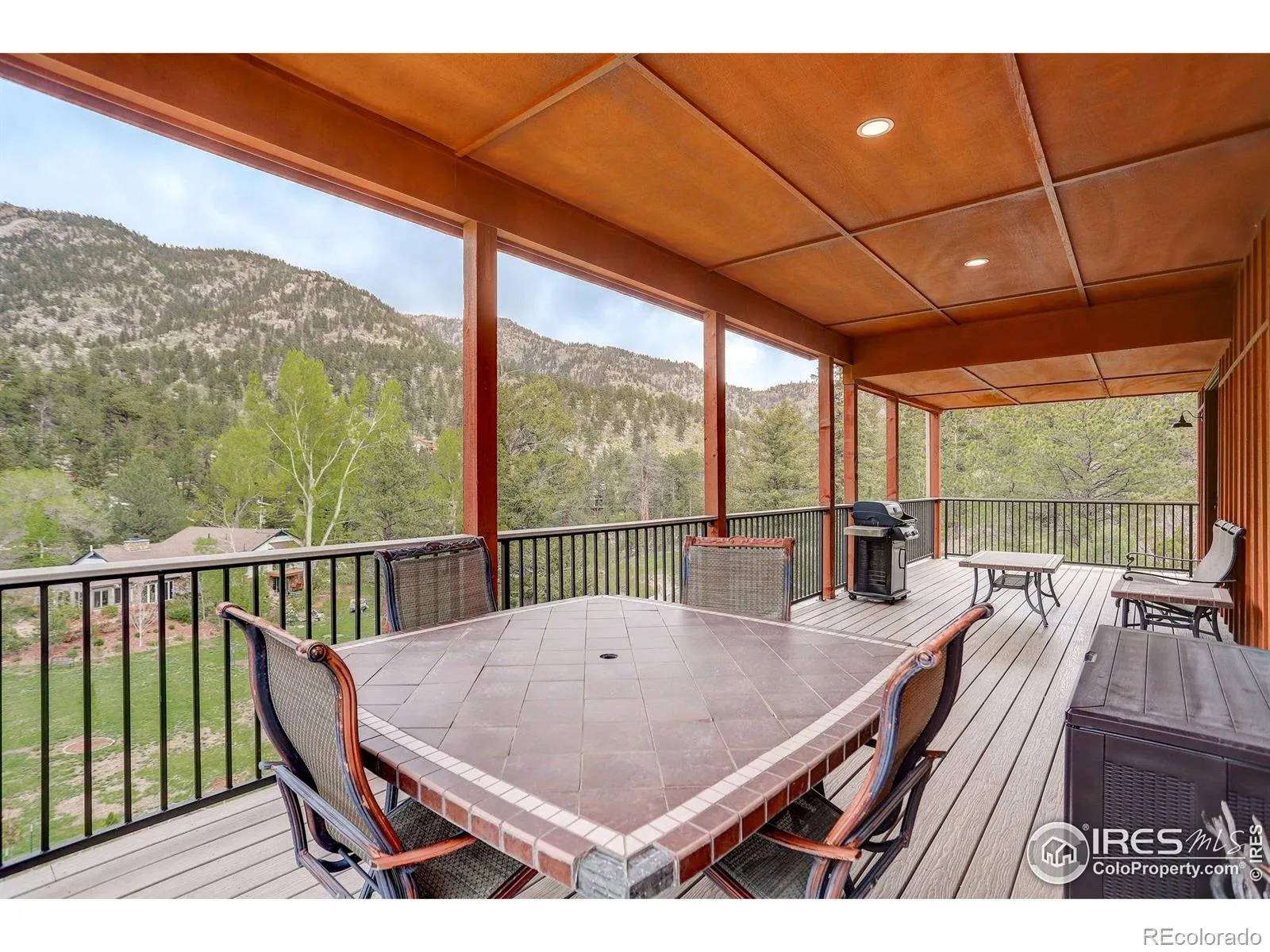 One-of-a-kind near net-zero waterfront estate! Step outside your newly constructed custom home and cast a line into the Little Thompson River. This stunning residence in Pinewood Springs is a rare sanctuary that blends sustainable living, sophisticated design, and extraordinary privacy. Set on 1.5 acres with direct access to Roosevelt National Forest, the property also features meandering park-like trails for peaceful walks and wildlife encounters, all framed by sweeping mountain views from every window. Inside, hickory floors flow throughout the home, leading to a gourmet kitchen outfitted with alder cabinetry, dual ovens, a copper sink and hood, and abundant storage. The open-concept design connects seamlessly to the great room, where electronic blinds provide comfort and climate control, and a floor-to-ceiling moss rock fireplace creates a warm focal point. Designed as a near net-zero, fossil-fuel-free retreat, this home features a 24-panel PV solar system, passive solar orientation, a hydronic radiant heat system, and fire-resistant exterior contributing to energy efficiency, comfort, and long-term peace of mind. Indoor-outdoor living shines on the expansive, no-maintenance covered deck, ideal for al fresco dining and relaxation with the soothing soundtrack of the river. The upper-level primary suite offers breathtaking views, a private patio with a hot tub, and a spa-worthy bath with copper sinks, a large shower, and a generous walk-in closet. A secondary main-level bedroom features deck access and an ensuite bath, while the lower-level bedroom enjoys walk-out access to the river. Additional features include an oversized garage, a south-facing driveway, and a 120 sq ft greenhouse perfect for year-round gardening. Ideally located between Estes Park and Lyons-just 35 minutes to Boulder or Longmont-this eco-conscious luxury home offers unparalleled serenity, craftsmanship, and sustainability for the discerning buyer.