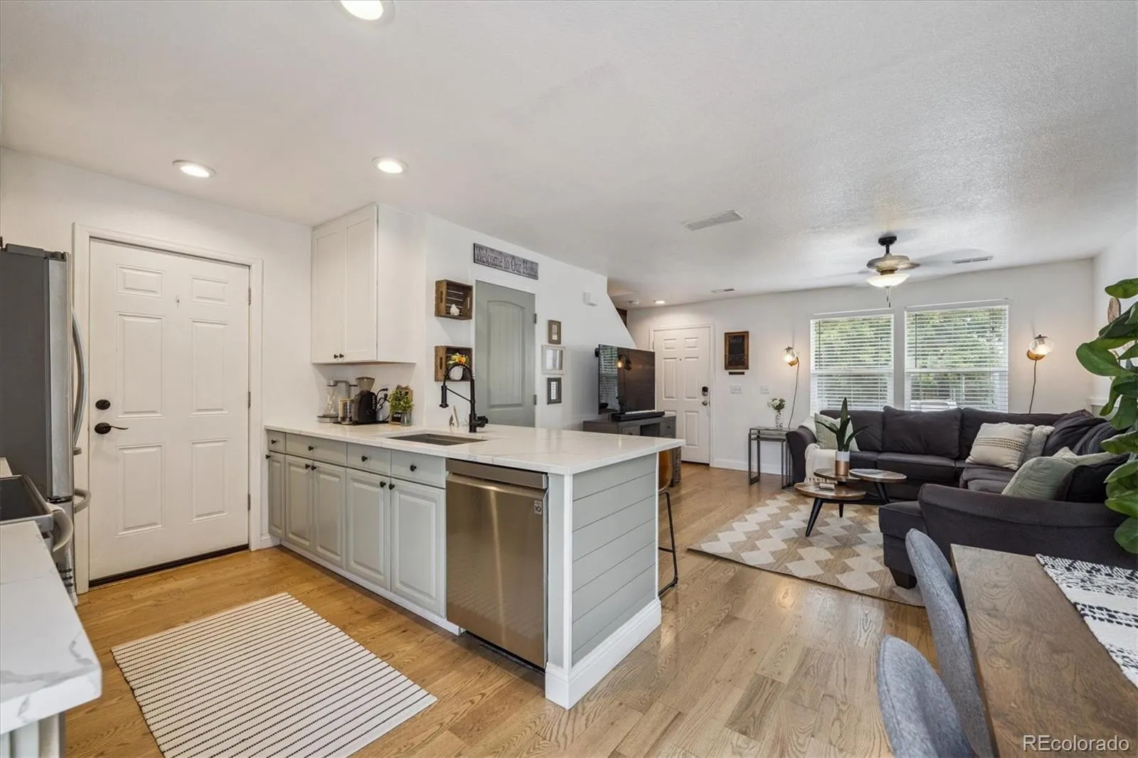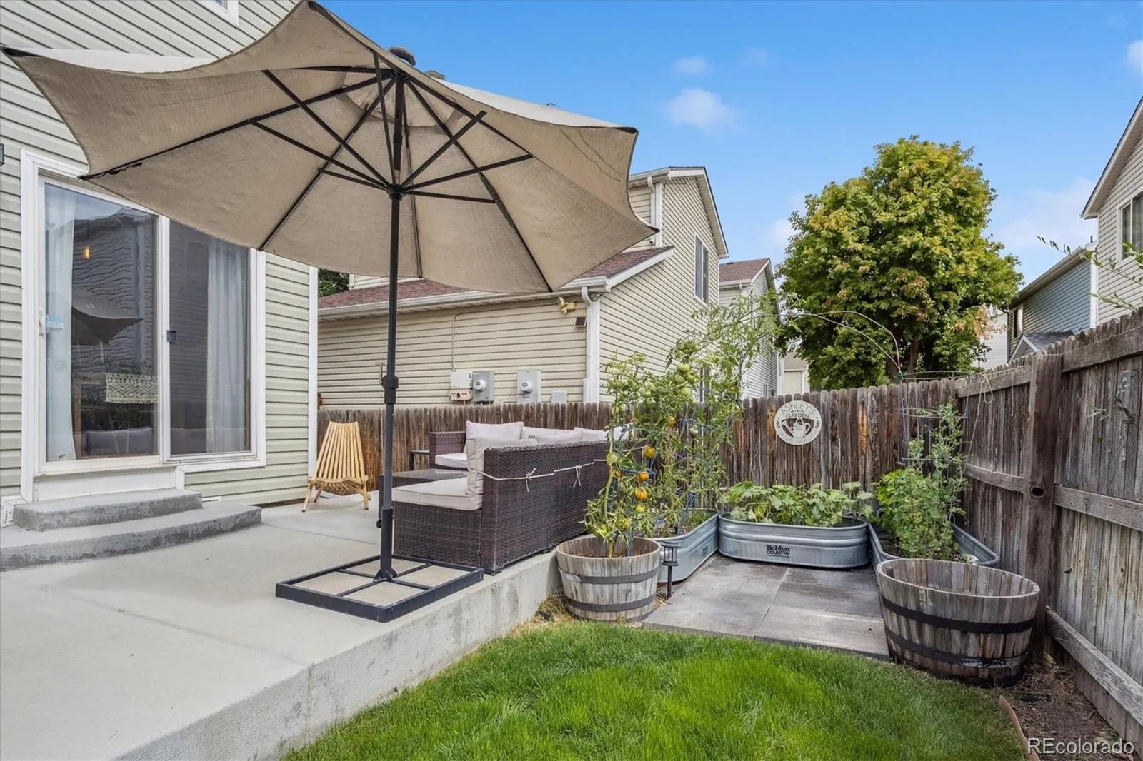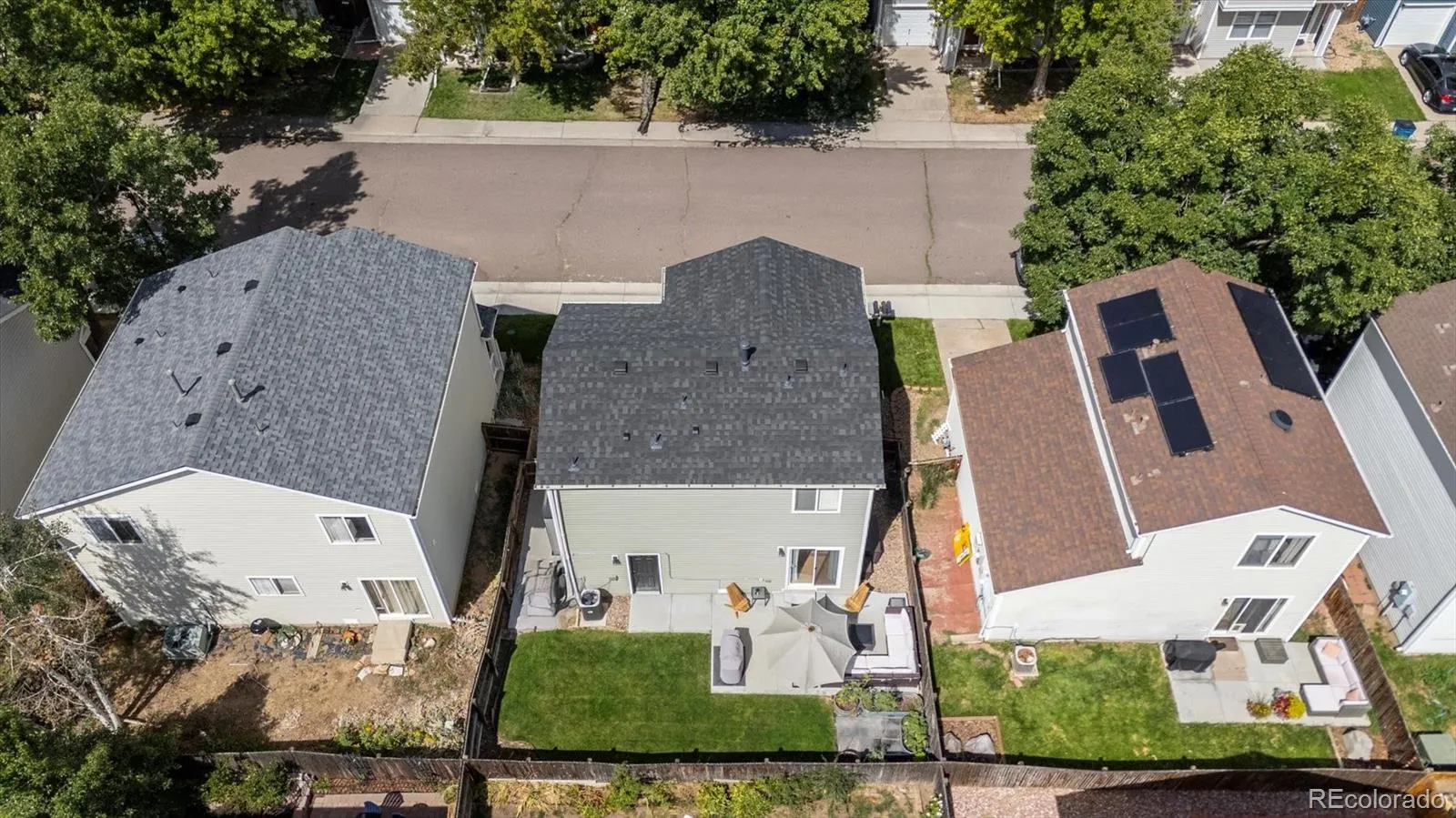 Beautifully-appointed Palisade Park starter home will steal your heart away! Super sharp 2-story w/three beds, two full baths and numerous recent updates, including new roof, new vinyl siding, new expanded driveway & sideyard access path, plus new back patio. Remodeled kitchen with quartz counters, floating shelves, newer stainless steel appliances and wine fridge, extra deep farmhouse sink, two tone can lighting, plus a rare direct access entry door between kitchen and garage. Custom full pantry w/lighting located beneath stairs. Open floorplan w/hardwood floors on the main level anchored by a large 14 x 14 living room space. Primary bedroom measures 12 x 10 with large walk-in closet and a private full bath w/granite counter and tub-shower combo. Two additional upstairs bedrooms, with south bedroom staged as home office, and another remodeled full bath plus a spacious upstairs laundry room with shelving and cabinetry. The oversized one-car garage measures 20 x 10 w/direct exterior access door to neatly manicured backyard area, featuring a healthy lawn, charming garden box area and new 25 x 11 concrete patio space ideal for outdoor dining or entertaining guests. Short 2 minute walk to Palisade Park, easy access to Hwy 285 and C-470, 10 minute drive to Red Rocks Amphitheater. Great low maintenance property in an excellent west metro neighborhood – see it today!