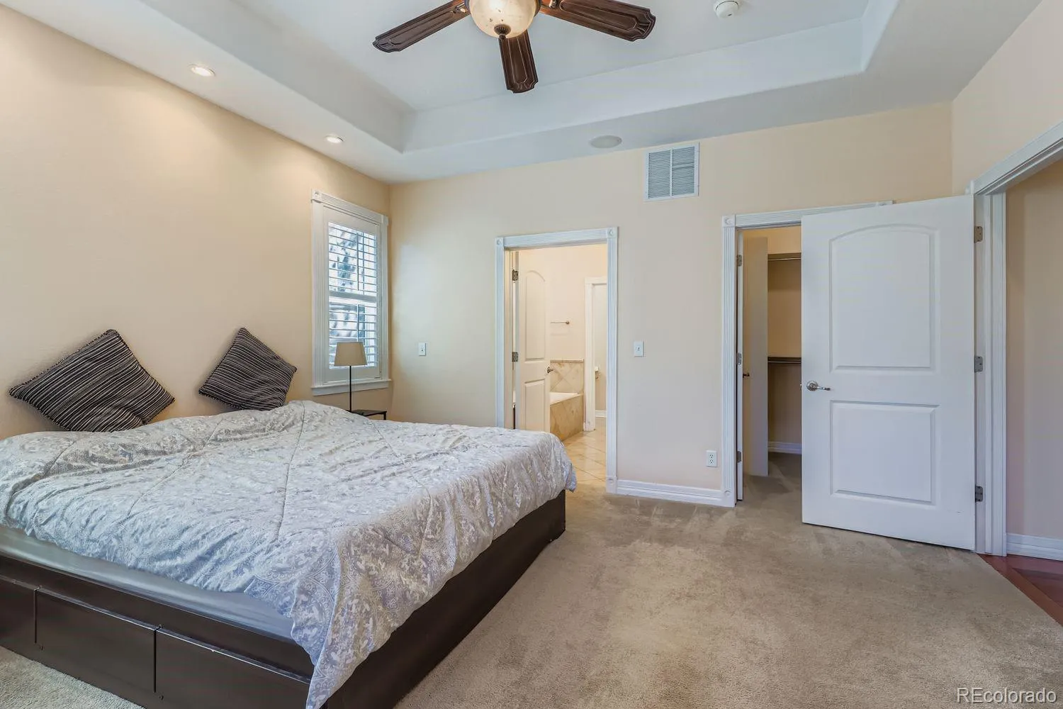 The main-floor master suite offers a serene retreat with a tray ceiling, newer carpet, and warm colored paint. Its en-suite bath includes a double vanity, soaking tub, separate shower, and private water closet. Conveniently, the laundry room connects the kitchen to the attached two-car garage.