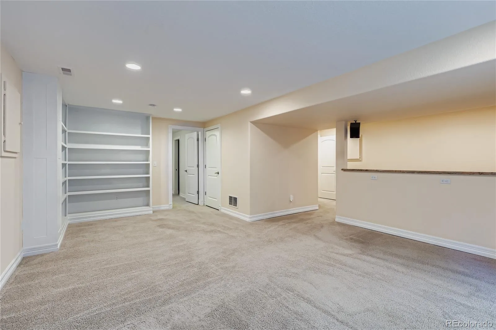The finished basement transforms into a true entertainment hub, complete with a peninsula countertop, 1950s diner–inspired glass block bar, and plenty of room for seating and a large-screen TV. A library/game area with built-in bookcases, an additional guest bedroom, and a three-quarter bath complete the lower level.