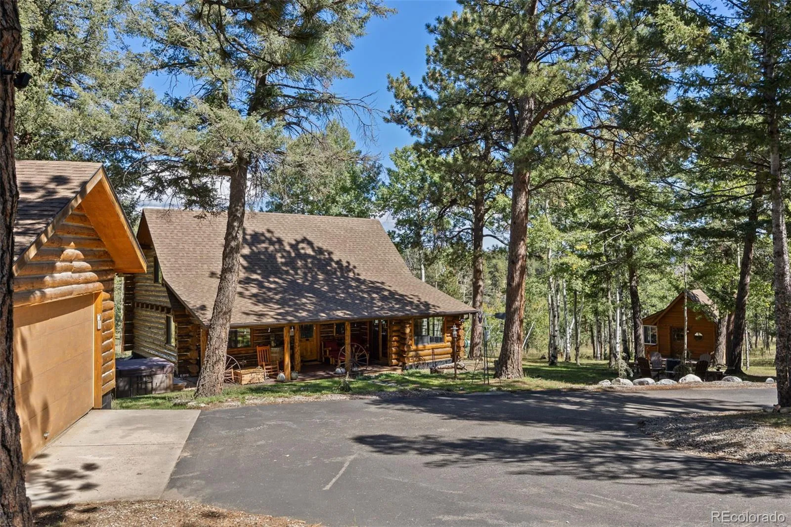 Set on 2.25 wooded acres with no HOA and year-round access, the setting offers privacy & a peaceful mountain feel just under an hour from Denver. Inside, exposed log beams, warm wood floors, custom cabinetry, handcrafted doors, & a stone fireplace w/ wood-burning stove create a timeless interior. Multiple decks extend living space outdoors, & a newer hot tub offers a private place to relax. Recent updates include a new furnace with Nest thermostat, new water heater & pressure tank, updated bathrooms, new decks on the main cabin and finished outbuilding, asphalt driveway, & upgraded lighting. A finished outbuilding with electricity provides flexible space for a studio, office, or retreat.