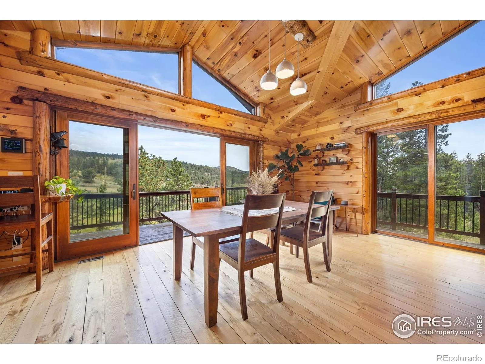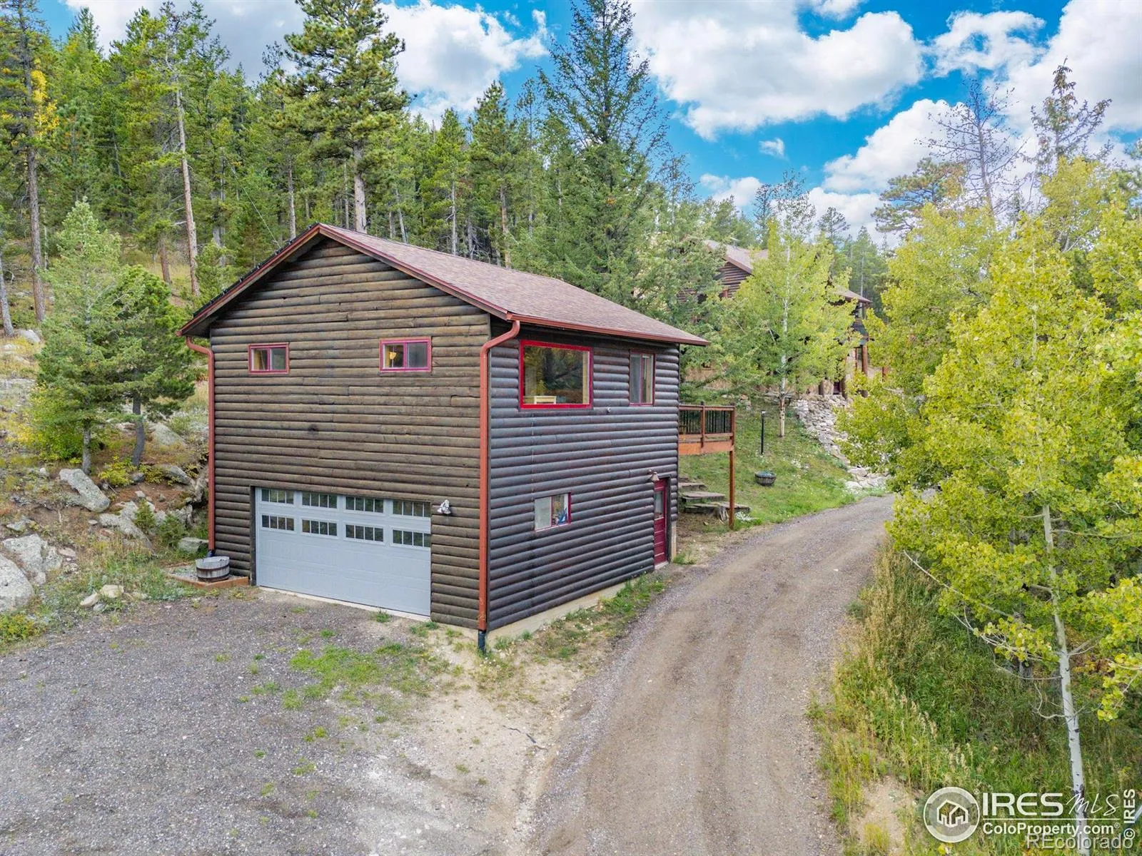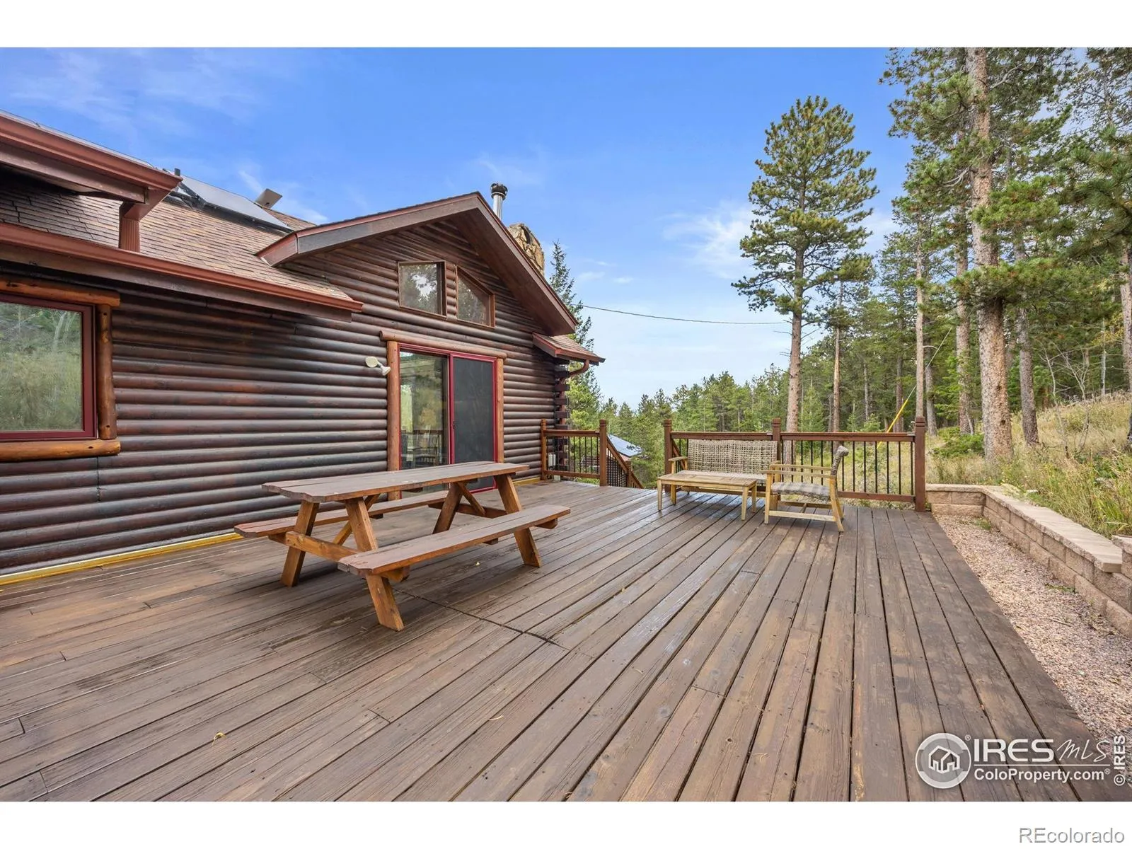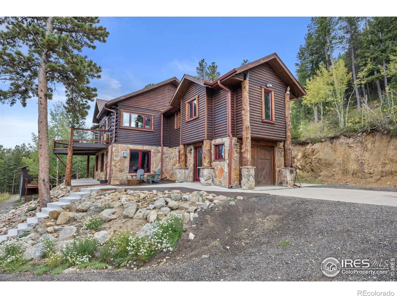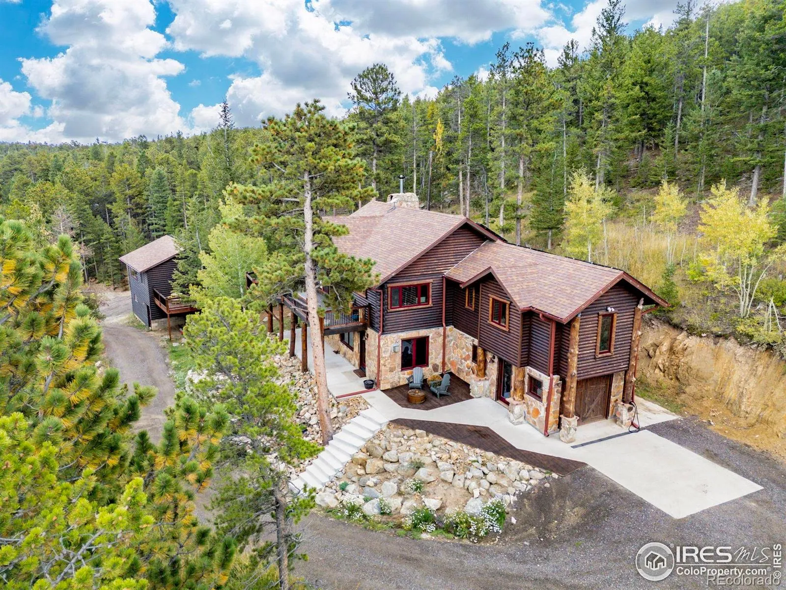 Perfectly positioned between Nederland and Boulder this custom-crafted log home blends timeless mountain charm with thoughtful modern updates. Set on 5 usable acres of green pasture with a barn/loafing shed, this property offers both privacy and wide-open space with serene mountain views. Inside, the finishes are a true work of art- rustic logs, tongue-and-groove pine, wide plank wood floors and fine custom wood details throughout that accent tall vaulted ceilings in this floorplan designed for both function and beauty. The kitchen shines with custom cabinetry, granite countertops, an island and updated appliances, while sliding glass doors open to a sunny wraparound deck that seamlessly connects indoor and outdoor living. Bright sunlit spaces are enhanced by skylights peppered throughout the home that create warm and inviting spaces. Soak in the warm ambiance around the natural stone fireplace in the evenings while spending your days on the spacious & sunny deck. Practicality meets craftsmanship with a workshop-style entry room for gear storage, a wired generator for peace of mind, and a 10kW solar system plus EV charger for efficiency. The oversized 2-car garage includes a private 1-bedroom ADU apartment with a kitchen and 3/4 bath-perfect for guests, rental income or multi-generational living. Additional features include a log-style shed, greenhouse and wraparound outdoor spaces where you can enjoy the crisp mountain air. Bring your horses, bikes, or ATVs- National Forest trails are nearby, offering endless recreation. A quick and scenic 20-minute drive brings you to the vibrant, cultural oasis of Boulder, or stay closer to home and enjoy the charm of Nederland with its local shops, restaurants, breweries, movie theater and live music venues. Winter brings skiing at nearby Eldora or skating at the town’s outdoor ice rink, while the surrounding trails and community events ensure year-round adventure and entertainment.