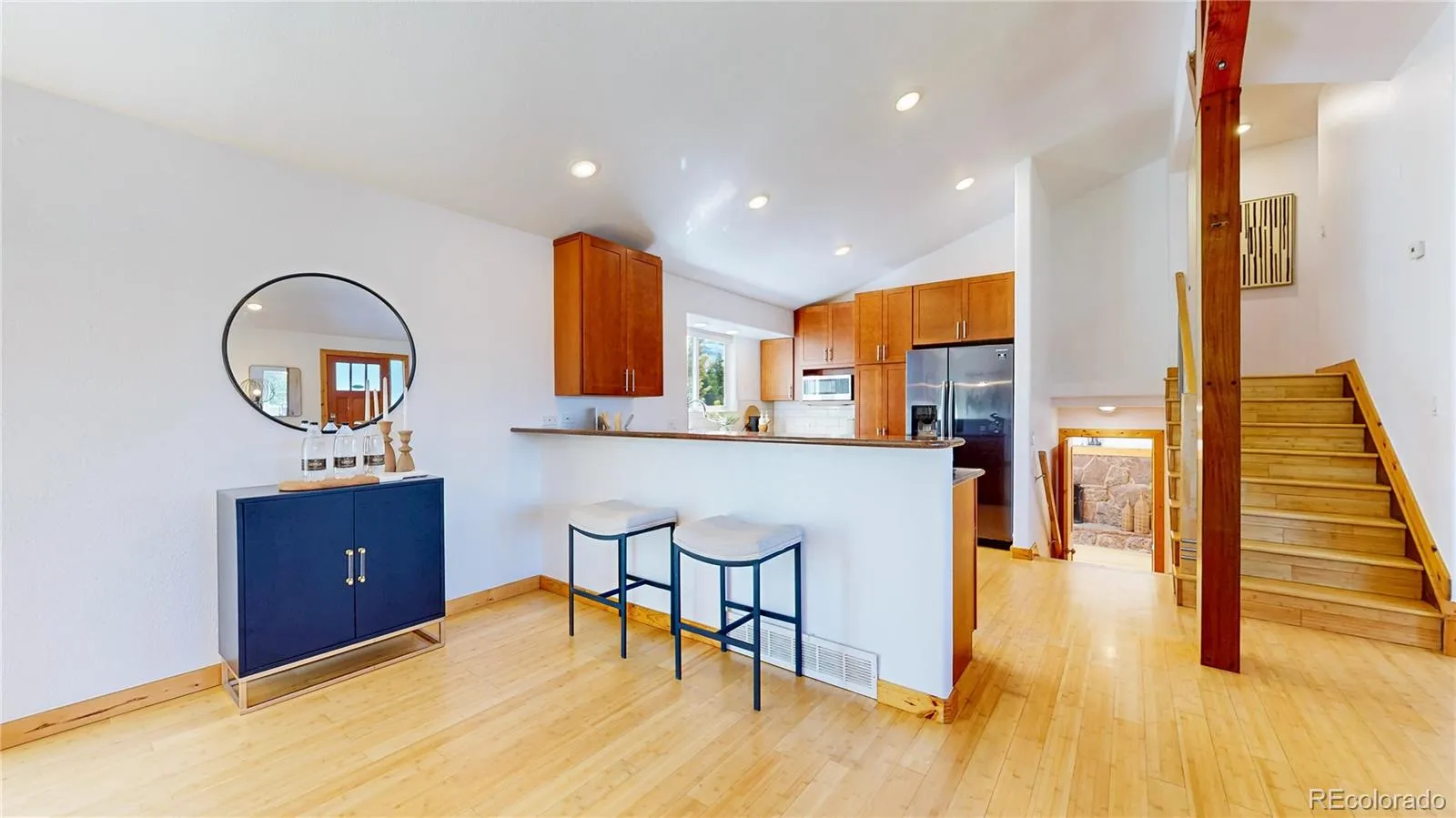 Modern rustic charm meets thoughtful updates in this gorgeous corner-lot home! Step inside to vaulted ceilings with pastoral beams and a light-filled, open-concept floor plan that seamlessly connects the kitchen, dining, and living room spaces. The kitchen features mahogany cabinetry, granite countertops, bar seating, and a stylish backsplash. Refinished bamboo floors run throughout most of the home, complemented by solid rustic doors and trim.