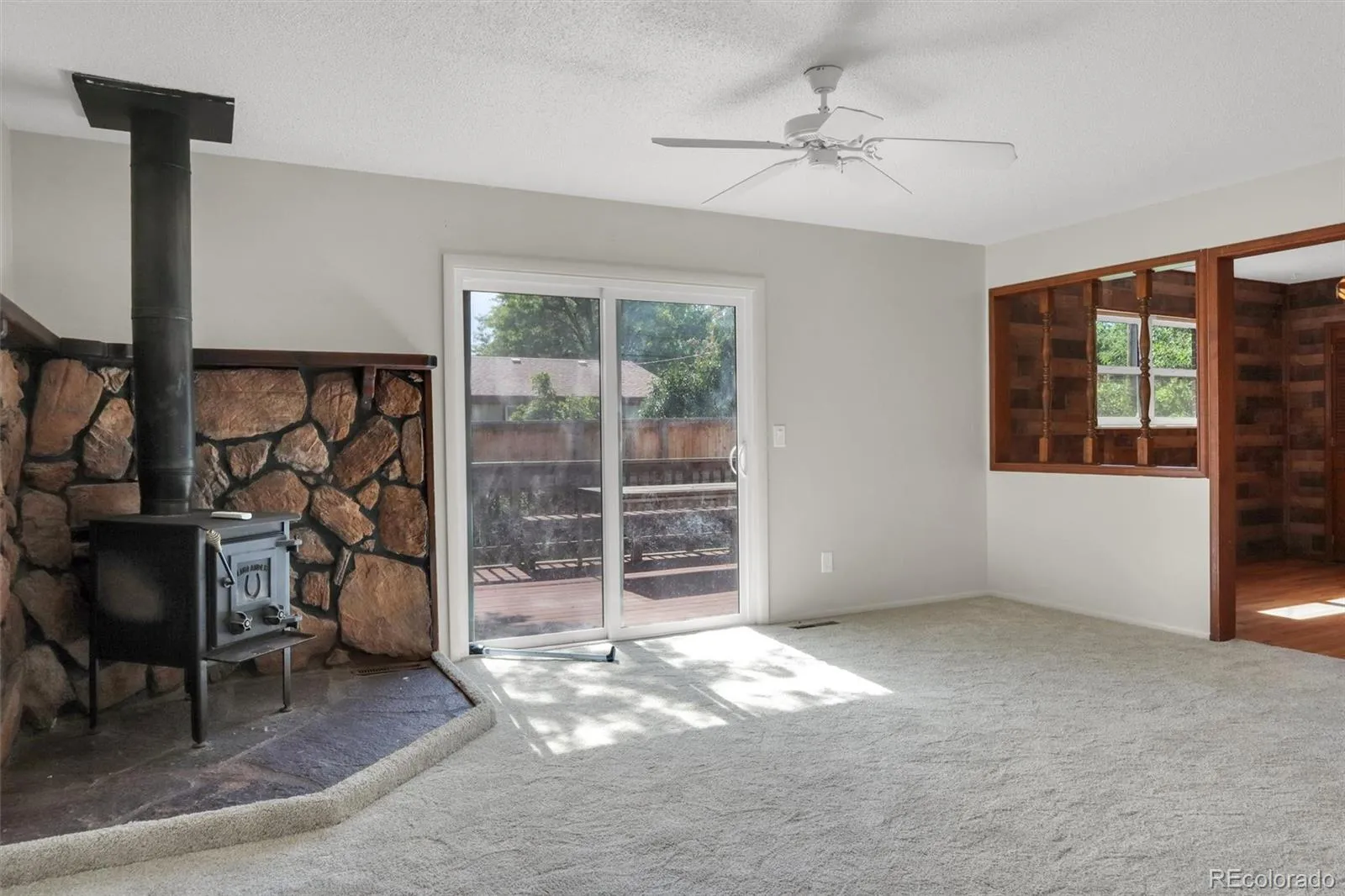 kitchen next to the living room with wood stove and the space for a formal dining room or a
