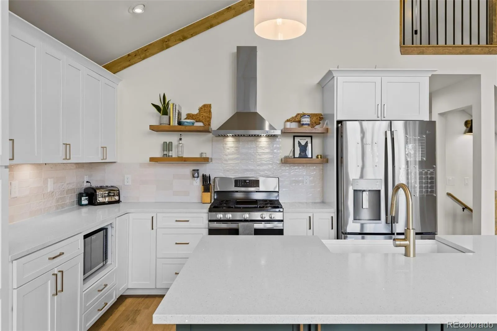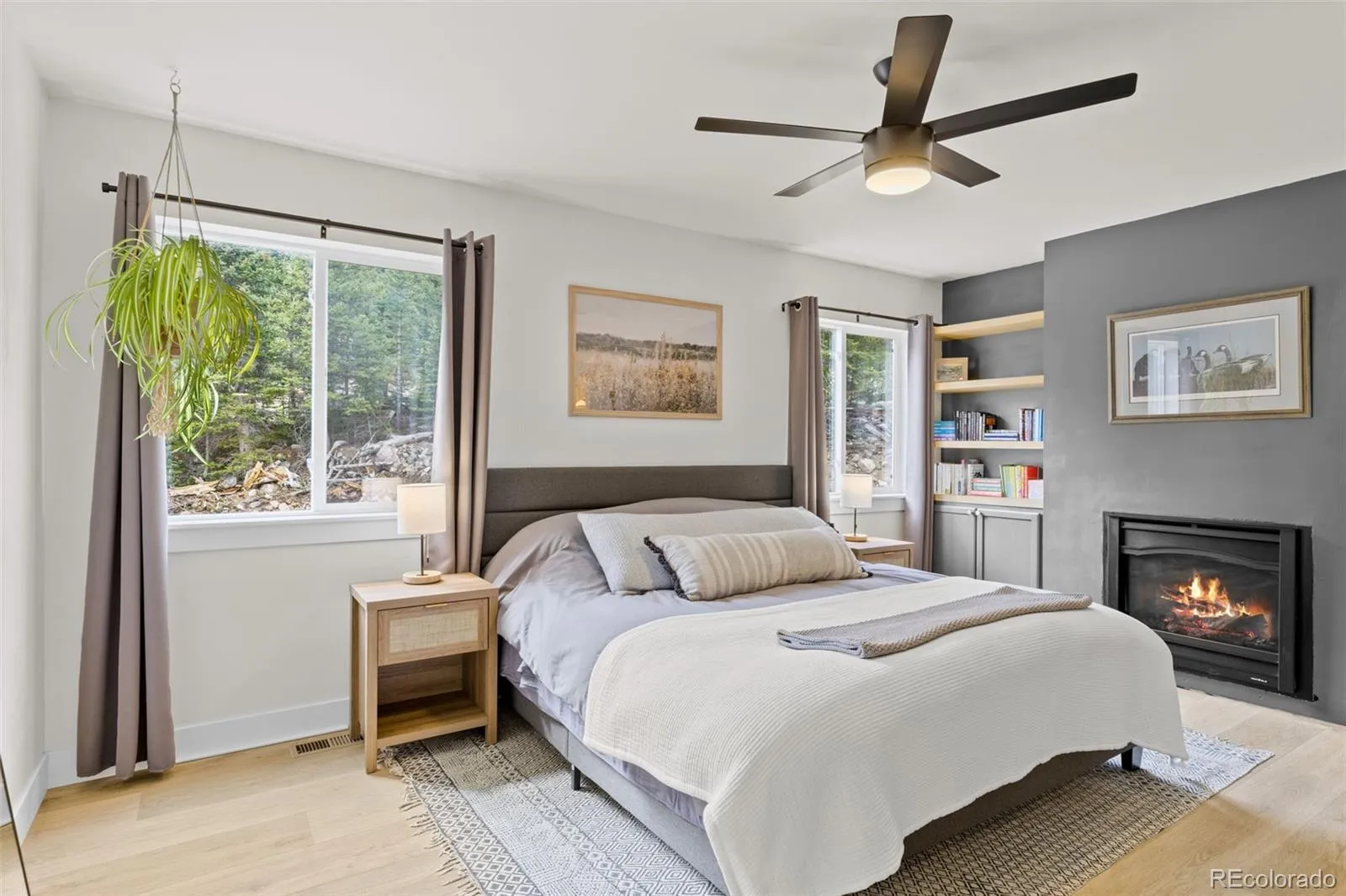 The custom kitchen is a chef’s delight, featuring quartz countertops, a sleek tile backsplash, high-end stainless appliances, floating shelves, and an oversized island with seating. Luxury vinyl plank flooring connects the main living spaces, while a second fireplace in the primary suite creates a cozy, private escape.