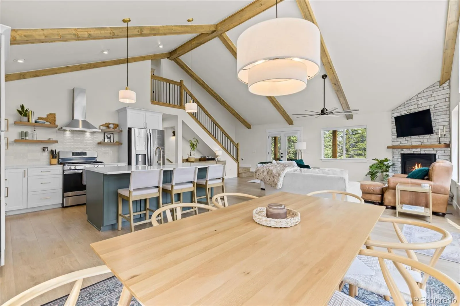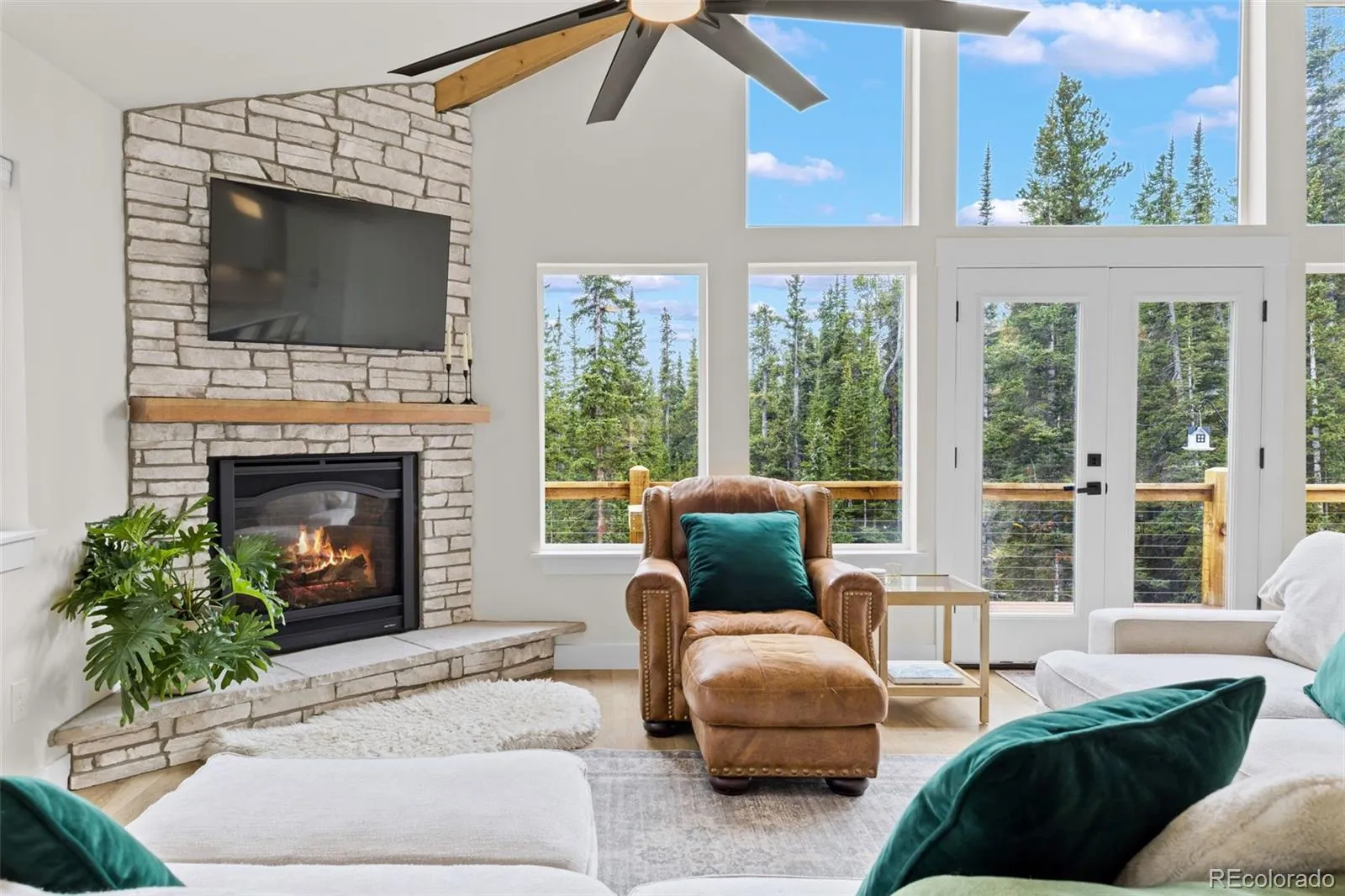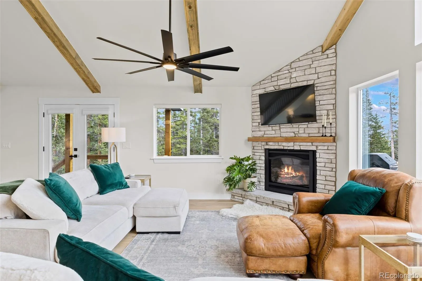 Built in 2023, this modern mountain retreat blends style, comfort, and functionality with quality finishes throughout. The open-concept great room welcomes you with soaring ceilings, exposed beams, and a stunning stone gas fireplace. A wall of windows fills the home with natural light and captures views of the surrounding forest.