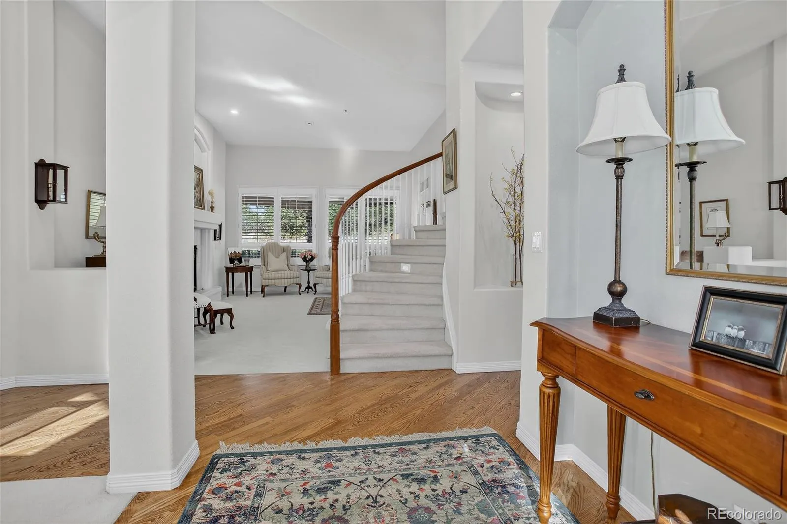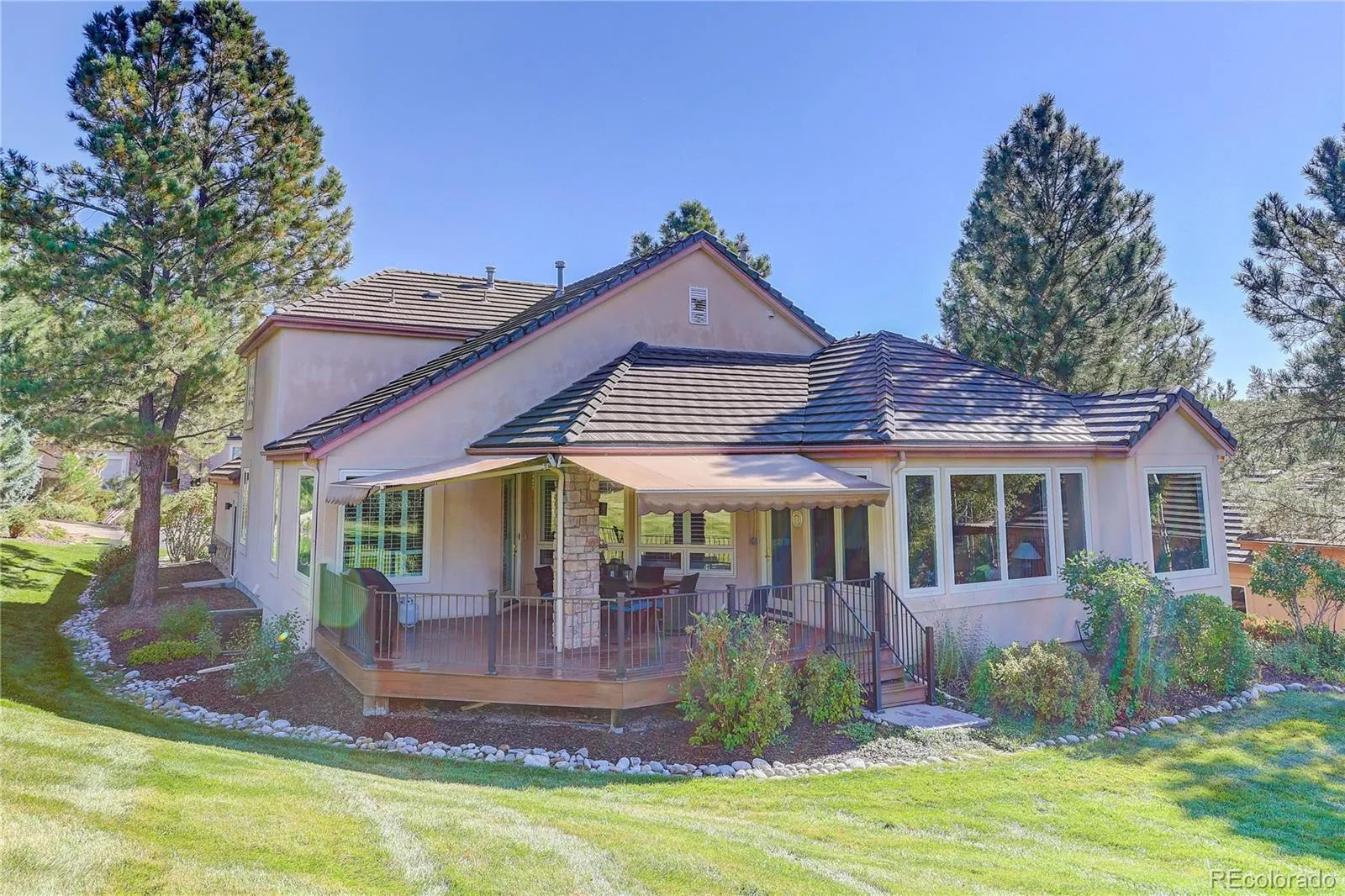 Welcome Home!!! Experience luxury, low-maintenance, main-floor living in this exquisite 4BR/4BA home nestled in The Greens enclave of The Village at Castle Pines. The home’s inviting curb appeal with 3-car garage is enhanced by breathtaking mountain views and direct access to the community’s trail system. Upon entering the home’s foyer you observe the formal living & dining rooms providing a sophisticated atmosphere for hosting guests. The main floor primary bedroom with cozy fireplace, mountain views, and access to the rear deck, also has an expansive updated 5-piece bath & walk-in closet. The kitchen features high-end cabinetry, granite countertops, stainless steel appliances and hardwood floors. Adjacent to the eat-in kitchen is the attached open concept den highlighted by more hardwood floors, vaulted ceilings, a 2-sided fireplace, and a wall of expansive windows offering amazing views of Colorado’s mountains. Completing the main level is a well-appointed study, powder room & conveniently located laundry room. A stylish curved staircase leads to the upper-level retreat boasting a family room, guest suite, and bathroom. The basement contains a large entertaining space and bar area, two bedrooms, a shared bath and an extensive unfinished storage/workshop area. The outdoor space blends seamlessly with the indoors as you enjoy a partially covered back deck with powered awnings overlooking meticulously maintained lawns, gardens, and mature trees. It’s a perfect setting for enjoying the mountain views and golden sunsets while relaxing or entertaining. Discover unparalleled luxury and effortless living at Castle Pines Village where residents enjoy the security of gated access with 24/7 staffed emergency services and monitored alarms, 3 pools, a fitness facility, tennis & pickleball courts, parks, miles of trails, and two of Colorado’s premier private golf courses. It’s also close to restaurants & shopping and within the highly rated Douglas County School District.