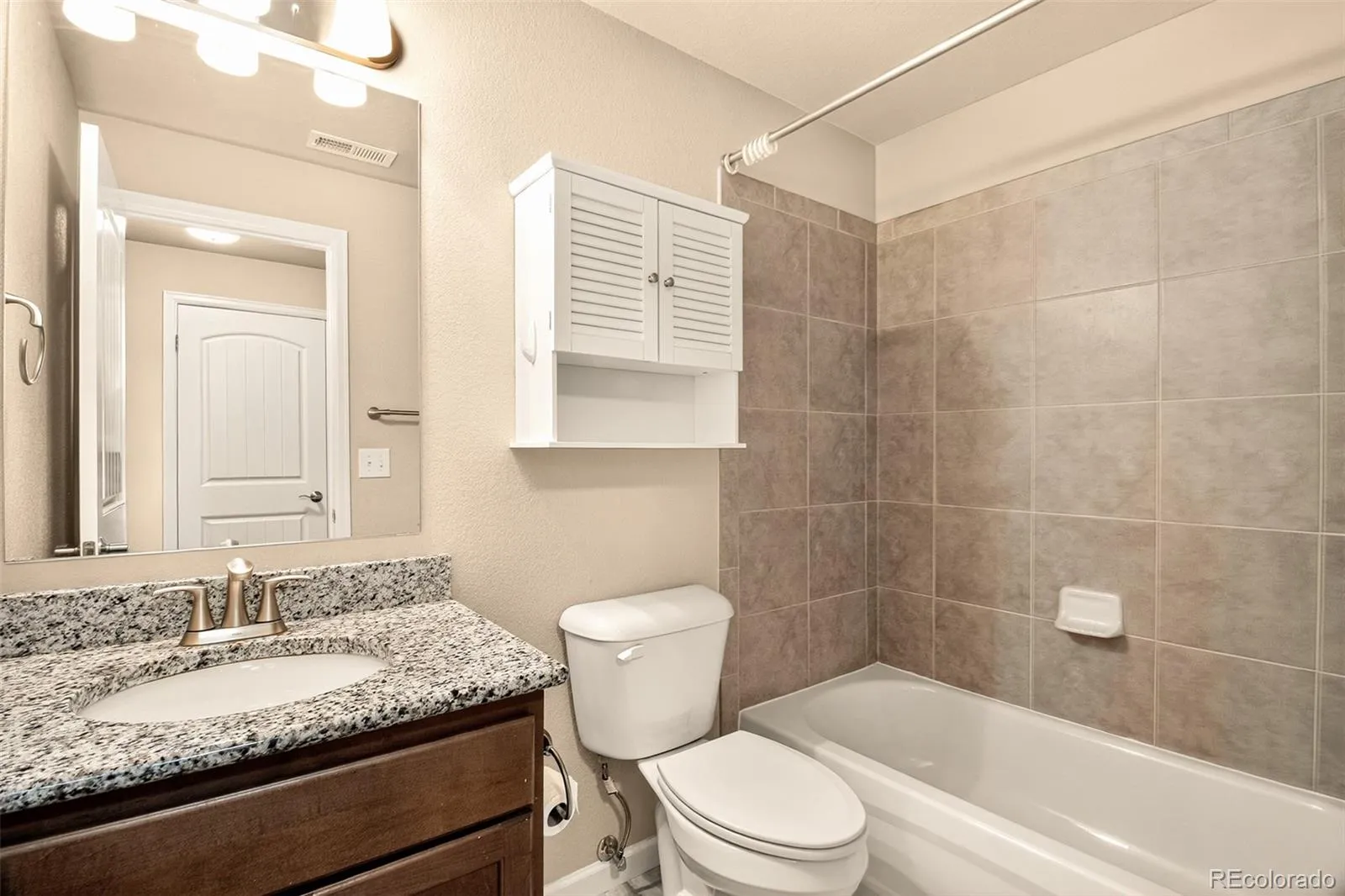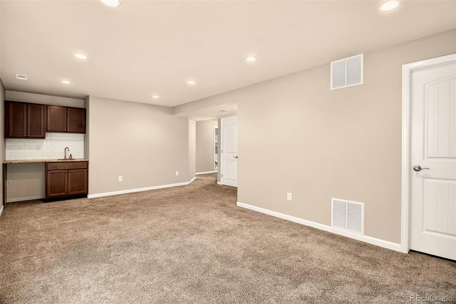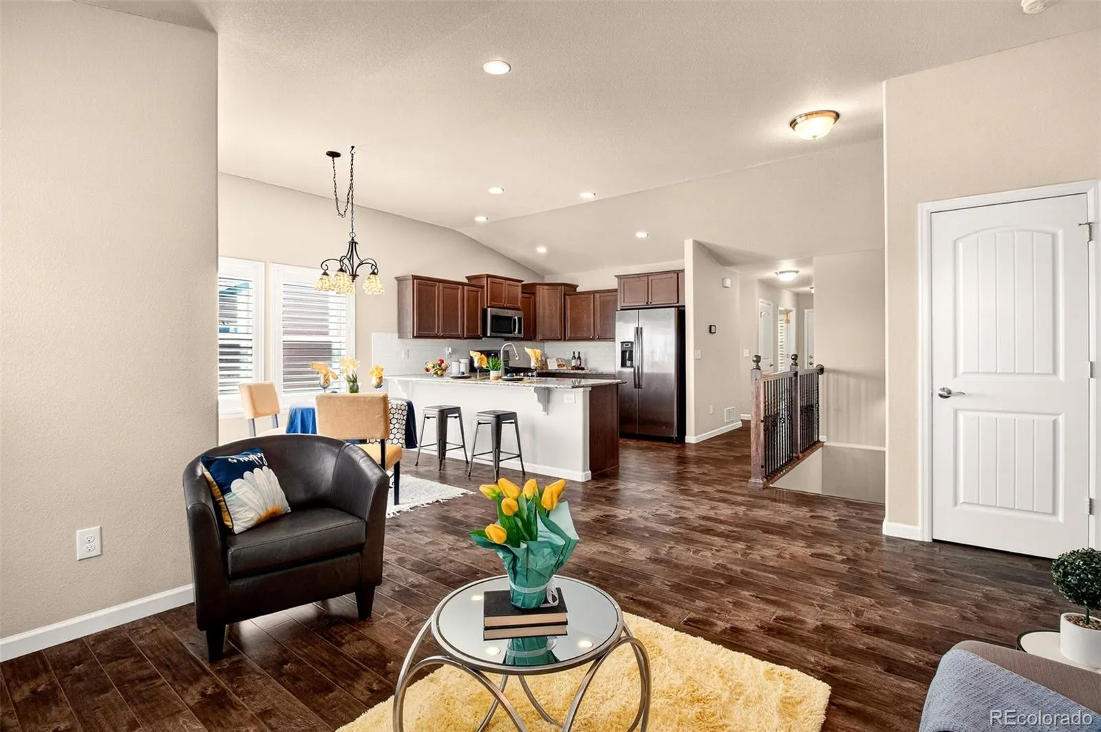 Welcome to low-maintenance living in the desirable Enclaves at Mountain Vista Ranch! This 2018 ranch-style patio home offers 3 bedrooms, 3 bathrooms, and over 2,300 sq. ft. of finished space, thoughtfully designed for both comfort and convenience. Step inside to an inviting open-concept main level featuring vaulted ceilings, abundant natural light, and a cozy gas log fireplace that anchors the living room. The kitchen blends style and functionality with a breakfast bar, granite countertops, stainless steel appliances, and plenty of cabinet space for storage. The spacious main-level primary suite offers a private retreat with a walk-in closet and an en-suite bath. An additional main-level office with French doors creates the perfect environment for remote work, a reading nook, or creative space. Downstairs, the finished basement expands your living options with a generous family room, a wet bar for entertaining, two additional bedrooms, a full bath, and an oversized utility/storage room. Outdoor living is just as enjoyable, with a private back patio ideal for relaxing mornings or evening gatherings and larger yard space. Residents also enjoy access to community walking trails, parks, and playgrounds—perfect for an active lifestyle. Located near shopping, dining, and District 49 schools, with quick access to Powers Blvd. and Marksheffel Rd., this move-in ready home combines modern finishes, a functional floor plan, and an unbeatable location.